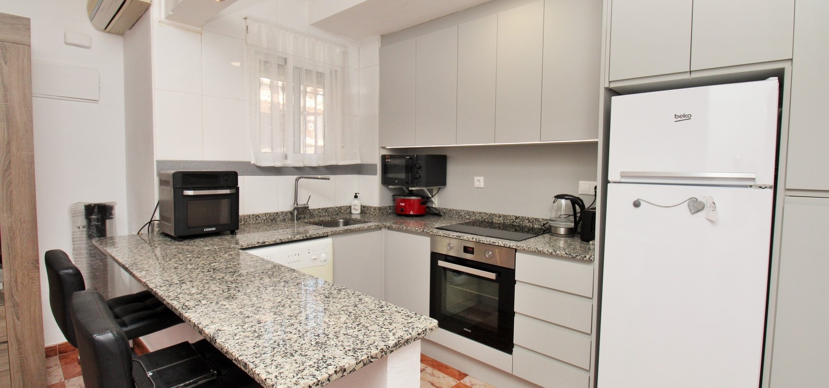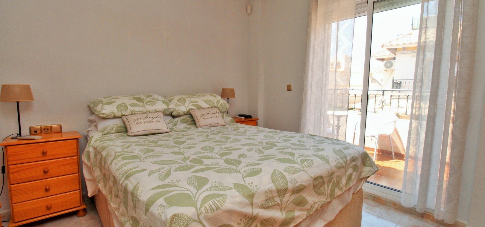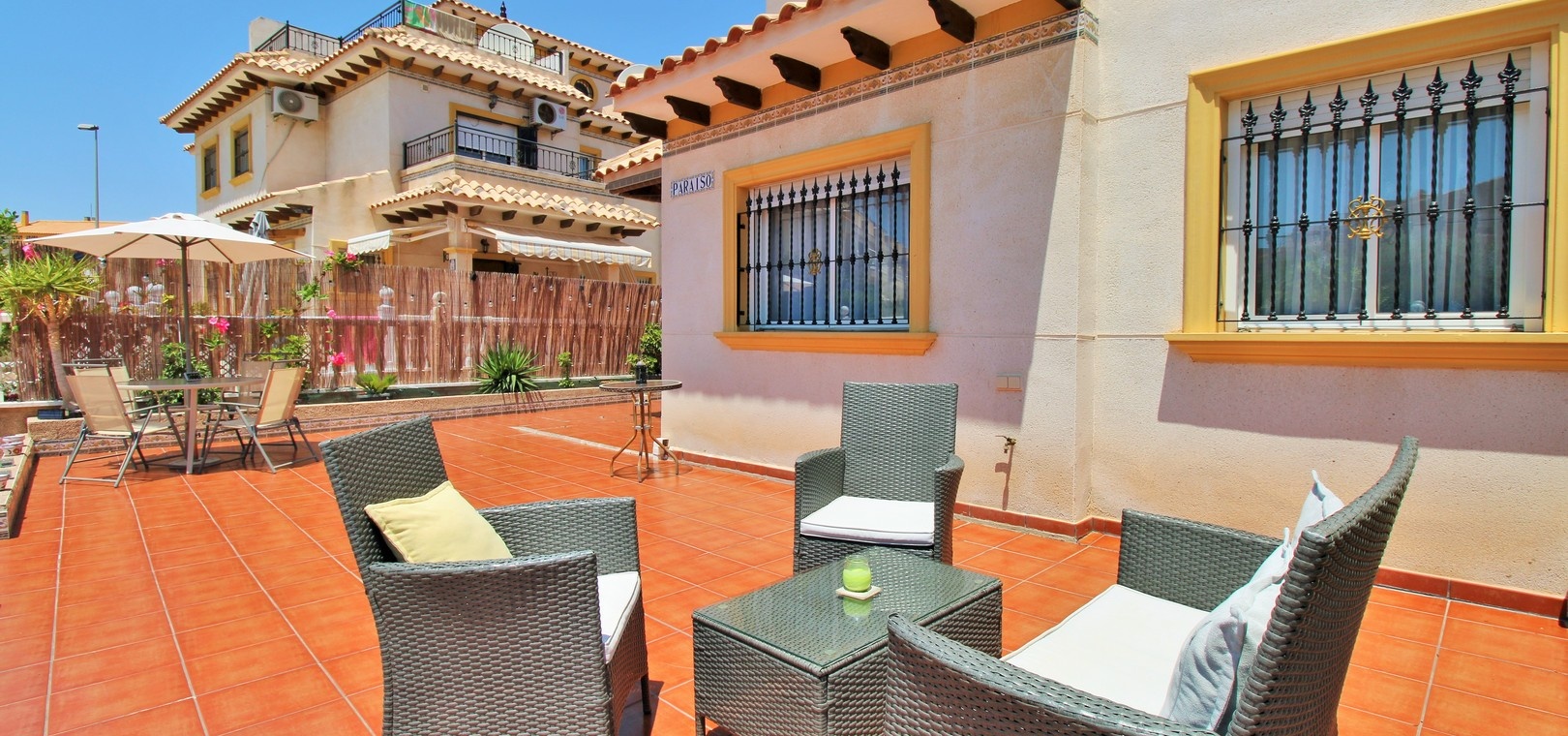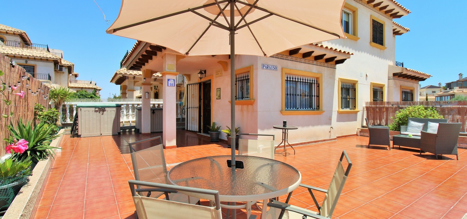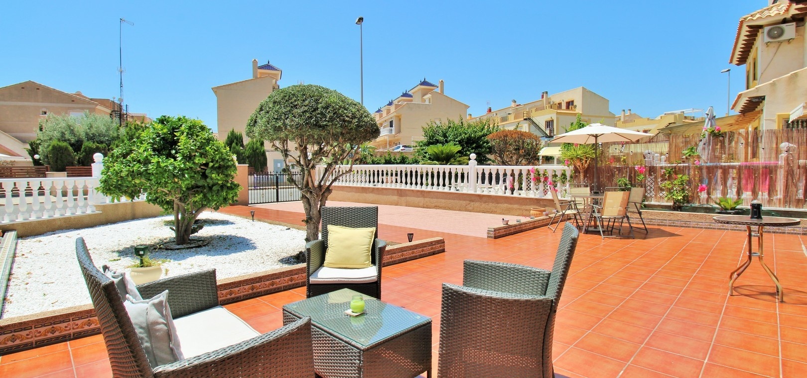 Jardin privatif de 139 m² avec : Allée privée Terrasse spacieuse avec auvents rétractables, idéale pour une utilisation toute l'année 2 chambres doubles avec placards intégrés 1 salle de bain familiale (à l'étage) 1 WC invités (rez-de-chaussée) Salon et salle à manger lumineux et ouvert en forme de L Cuisine américaine modernisée Chambre principale avec balcon privé Grand solarium privé avec espace de rangement supplémentaire Climatisation Vendu meublé , y compris les électroménagers Excellent état et prêt à emménager