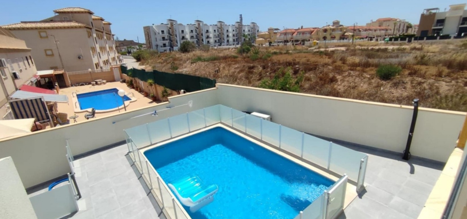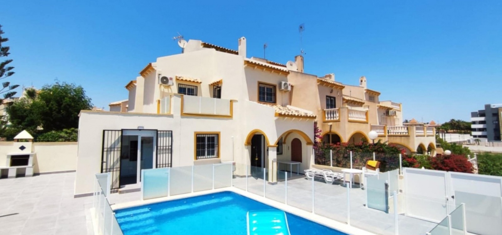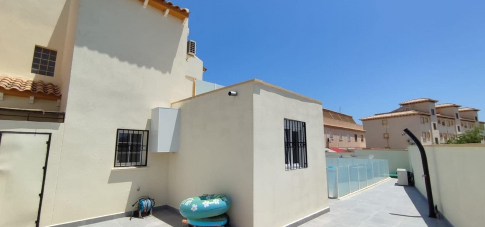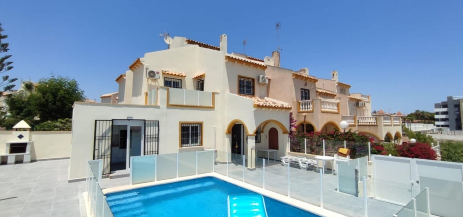 Nous sommes heureux de vous proposer cette magnifique villa quadruple rénovée avec goût. Elle comprend deux chambres doubles, deux salles de bains et une grande piscine privée chauffée. Elle est équipée de ventilateurs de plafond et de la climatisation, ainsi que d'une cuisine ouverte moderne avec spots et portes-fenêtres donnant sur la piscine. Cette dernière est vitrée pour éviter les chutes d'animaux ou d'enfants. Au rez-de-chaussée, une salle de douche et à l'étage, des salles de bains familiales carrelées de marbre moderne, sont à votre disposition. Les chambres sont climatisées et disposent de placards intégrés. La chambre principale donne sur un balcon ensoleillé avec vue sur la piscine. Au dernier étage, un solarium en gazon synthétique offre une vue imprenable sur les environs et la mer, accessible en 10 minutes à pied. La propriété se trouve à la frontière entre Playa Flamenca et La Zenia. Le centre commercial de La Zenia est à 5 minutes à pied, d'un côté, et le célèbre marché du samedi de Playa Flamenca à 5 minutes, de l'autre. Plusieurs parcours de golf de championnat sont accessibles en quelques minutes en voiture. Une superbe villa pour les vacances ou pour y vivre.