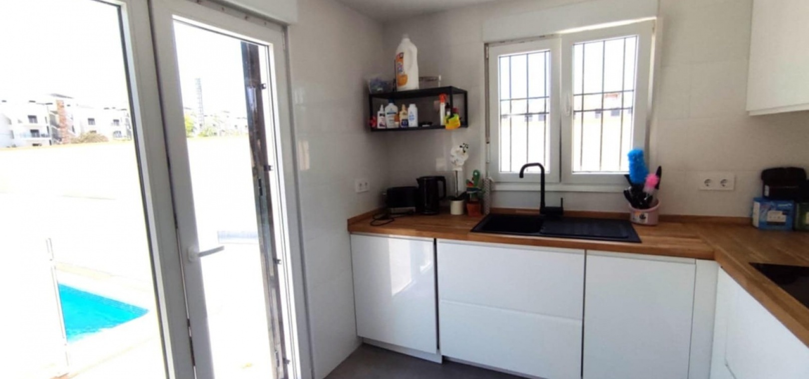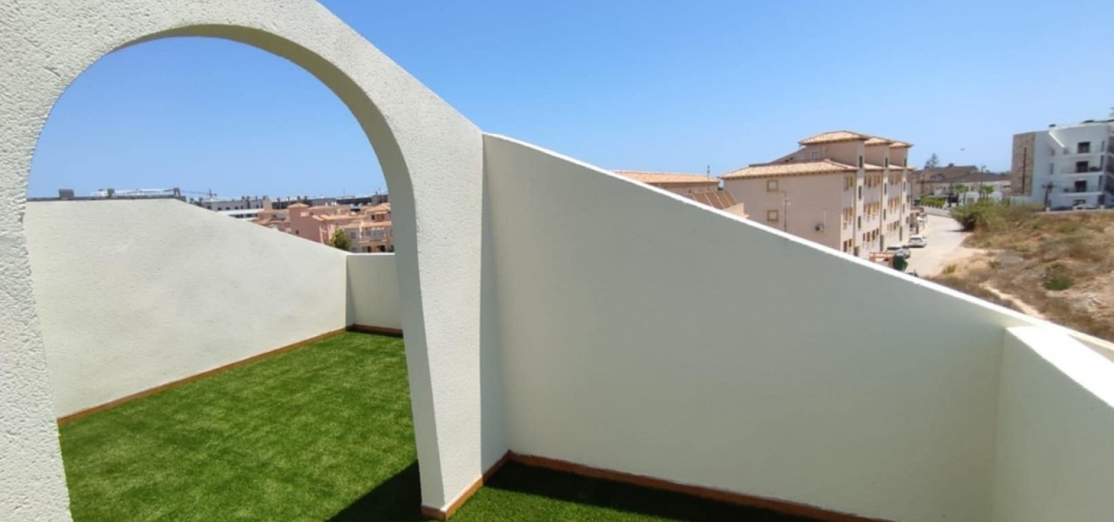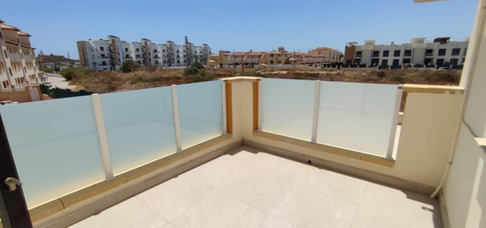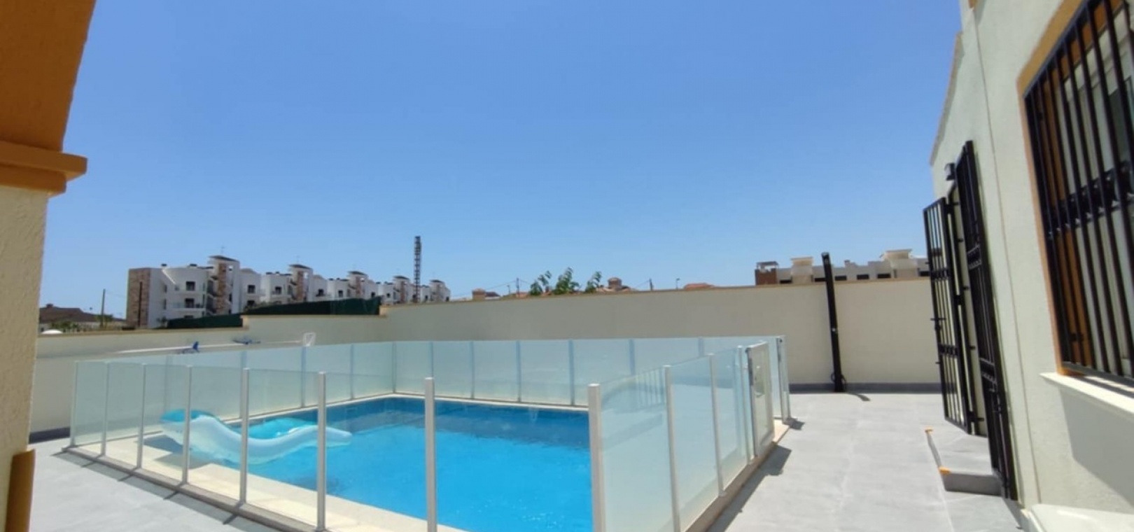Nous sommes heureux de vous proposer cette magnifique villa quadruple rénovée avec goût. Elle comprend deux chambres doubles, deux salles de bains et une grande piscine privée chauffée. Elle est équipée de ventilateurs de plafond et de la climatisation, ainsi que d'une cuisine ouverte moderne avec spots et portes-fenêtres donnant sur la piscine. Cette dernière est vitrée pour éviter les chutes d'animaux ou d'enfants. Au rez-de-chaussée, une salle de douche et à l'étage, des salles de bains familiales carrelées de marbre moderne, sont à votre disposition. Les chambres sont climatisées et disposent de placards intégrés. La chambre principale donne sur un balcon ensoleillé avec vue sur la piscine. Au dernier étage, un solarium en gazon synthétique offre une vue imprenable sur les environs et la mer, accessible en 10 minutes à pied. La propriété se trouve à la frontière entre Playa Flamenca et La Zenia. Le centre commercial de La Zenia est à 5 minutes à pied, d'un côté, et le célèbre marché du samedi de Playa Flamenca à 5 minutes, de l'autre. Plusieurs parcours de golf de championnat sont accessibles en quelques minutes en voiture. Une superbe villa pour les vacances ou pour y vivre.