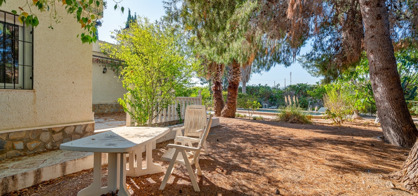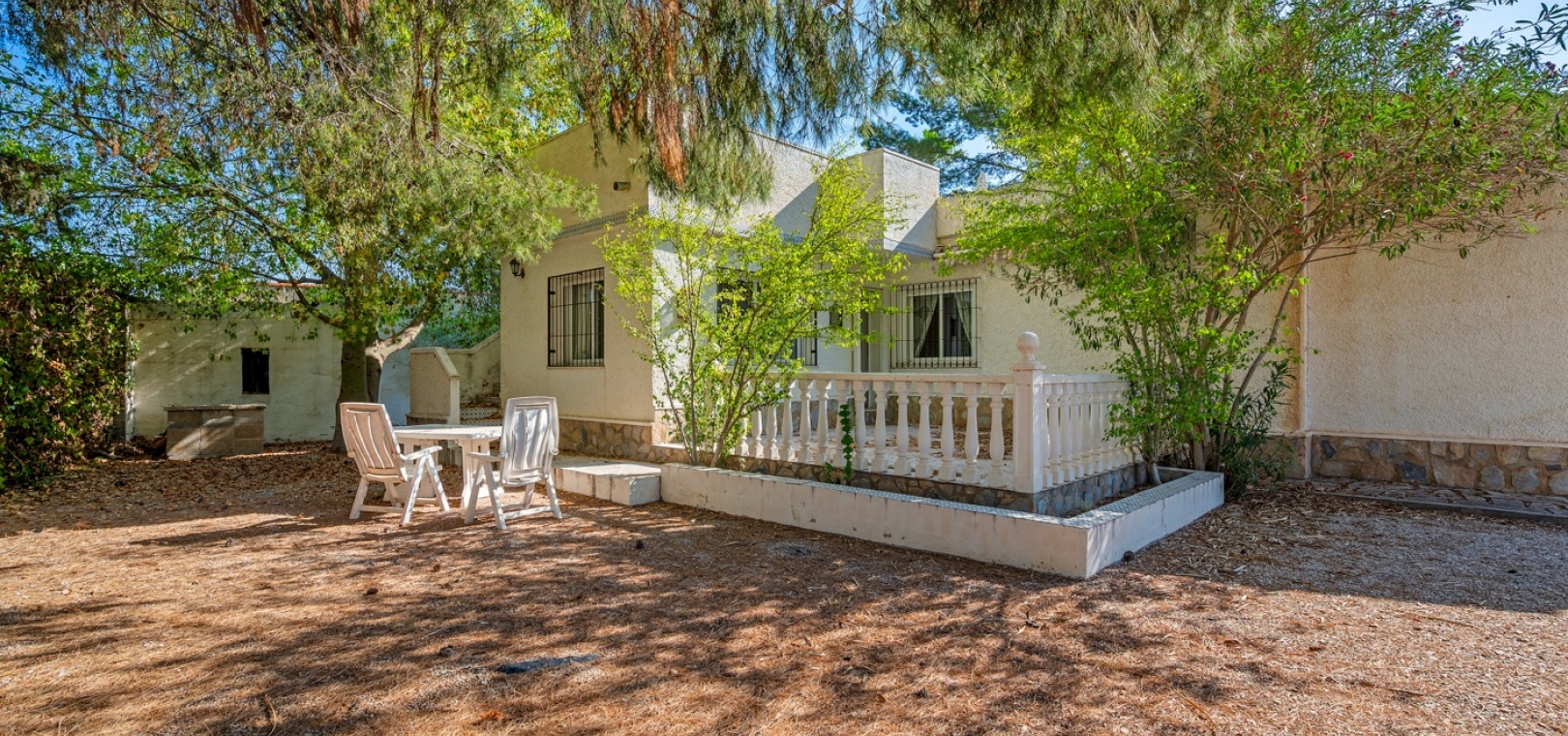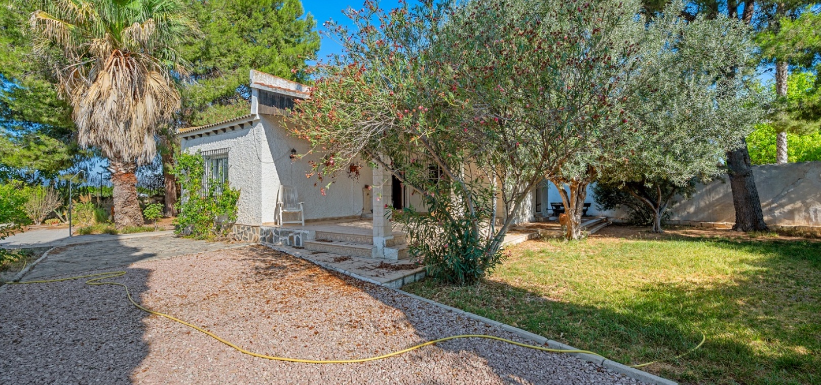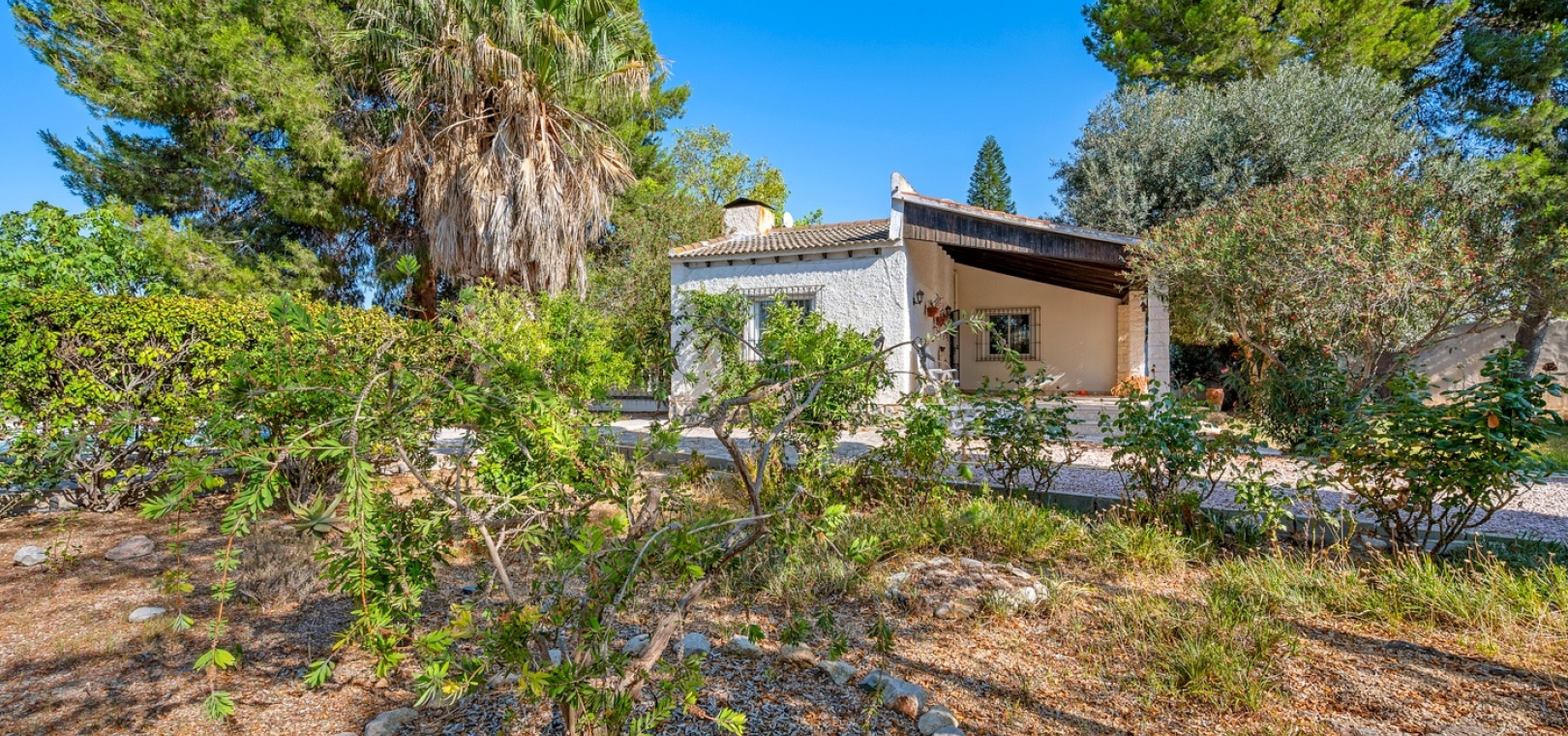 L’entrée principale permet de garer en privé avec accès direct au porche. À l’intérieur, un vaste salon-salle à manger avec cheminée maçonnée. D’un côté se trouve la chambre principale, et de l’autre, la cuisine avec buanderie, plus un petit hall menant à deux chambres supplémentaires séparées par la salle de bains. Une terrasse extérieure est idéale pour admirer le coucher de soleil ou profiter de l’espace piscine en évitant le grand solarium. Depuis cette terrasse, vous accédez au jardin entourant la maison, avec un grand espace comprenant piscine privée, barbecue et jardin naturel — parfait pour profiter du climat et de la tranquillité. Il y a également une petite dépendance qui pourrait être transformée en cuisine d’été ou pool‑bar.