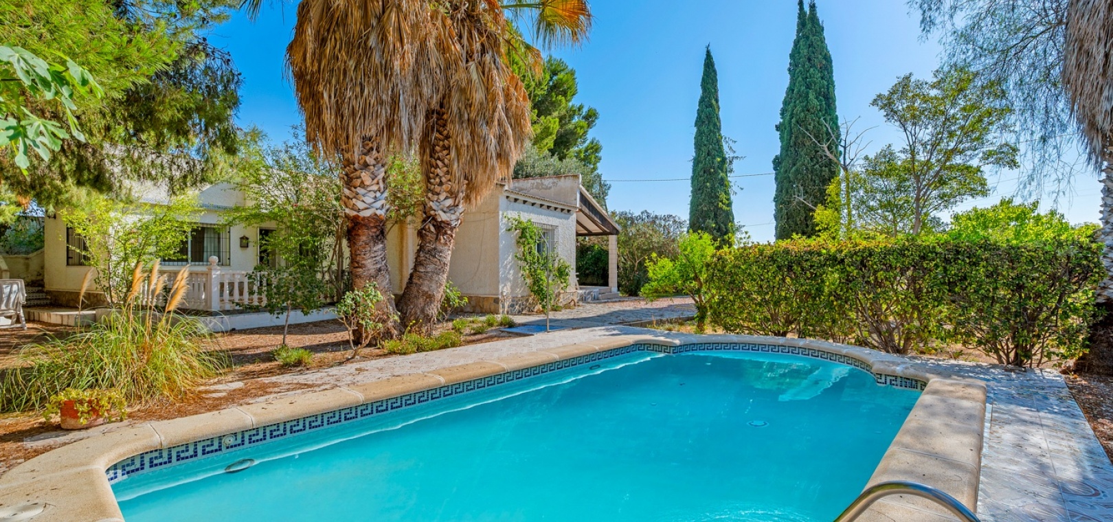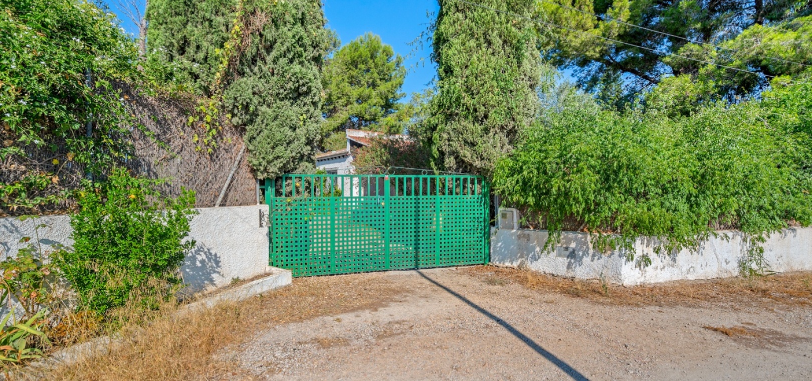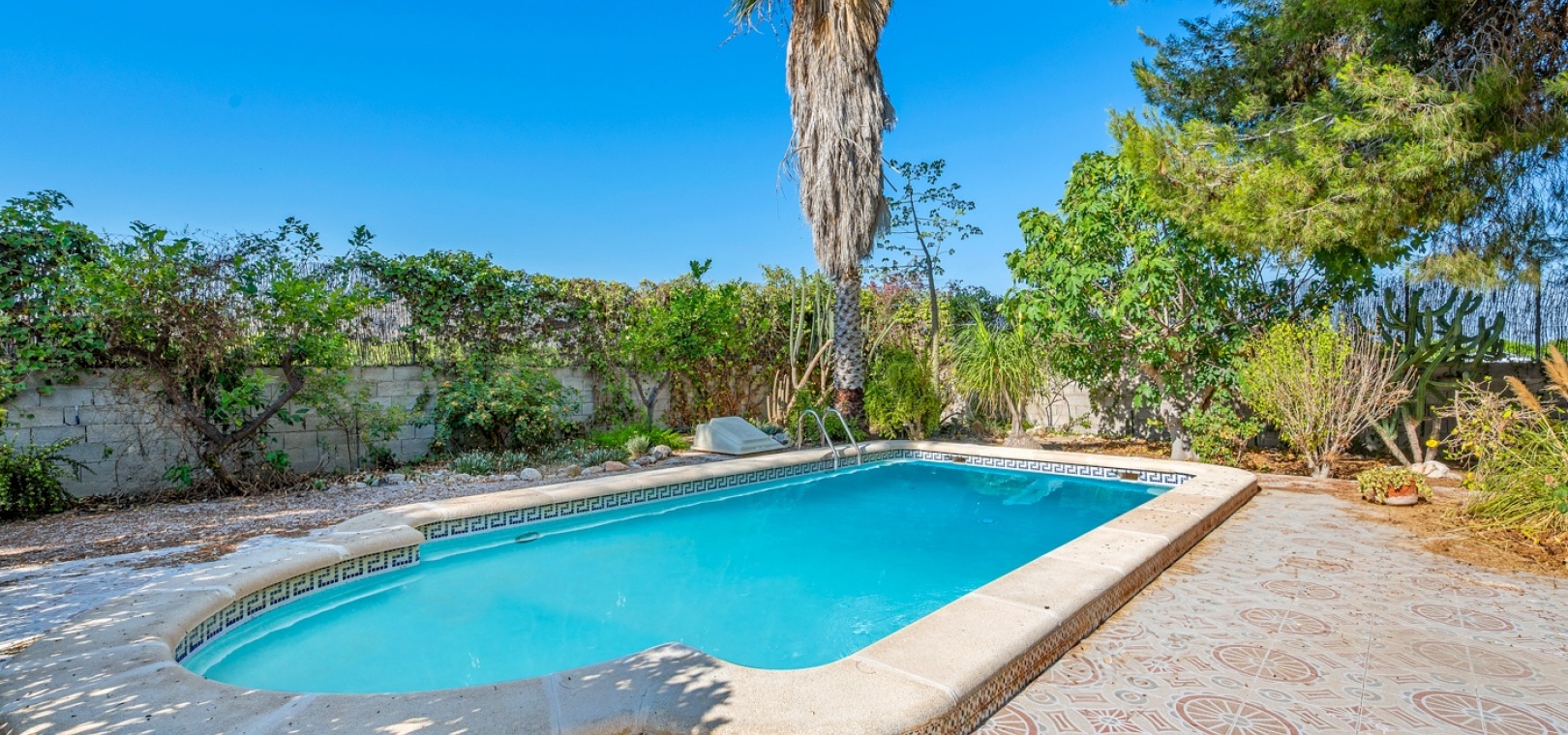 L’entrée principale permet de garer en privé avec accès direct au porche. À l’intérieur, un vaste salon-salle à manger avec cheminée maçonnée. D’un côté se trouve la chambre principale, et de l’autre, la cuisine avec buanderie, plus un petit hall menant à deux chambres supplémentaires séparées par la salle de bains. Une terrasse extérieure est idéale pour admirer le coucher de soleil ou profiter de l’espace piscine en évitant le grand solarium. Depuis cette terrasse, vous accédez au jardin entourant la maison, avec un grand espace comprenant piscine privée, barbecue et jardin naturel — parfait pour profiter du climat et de la tranquillité. Il y a également une petite dépendance qui pourrait être transformée en cuisine d’été ou pool‑bar.