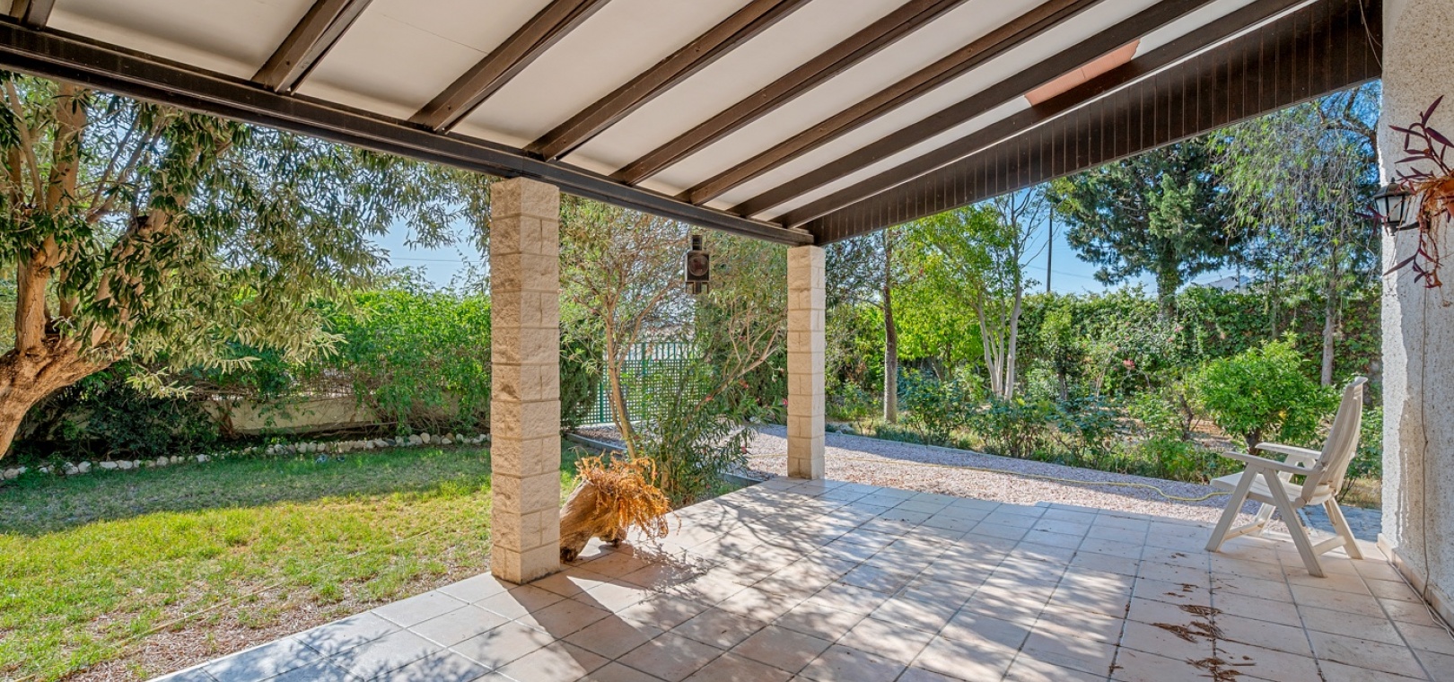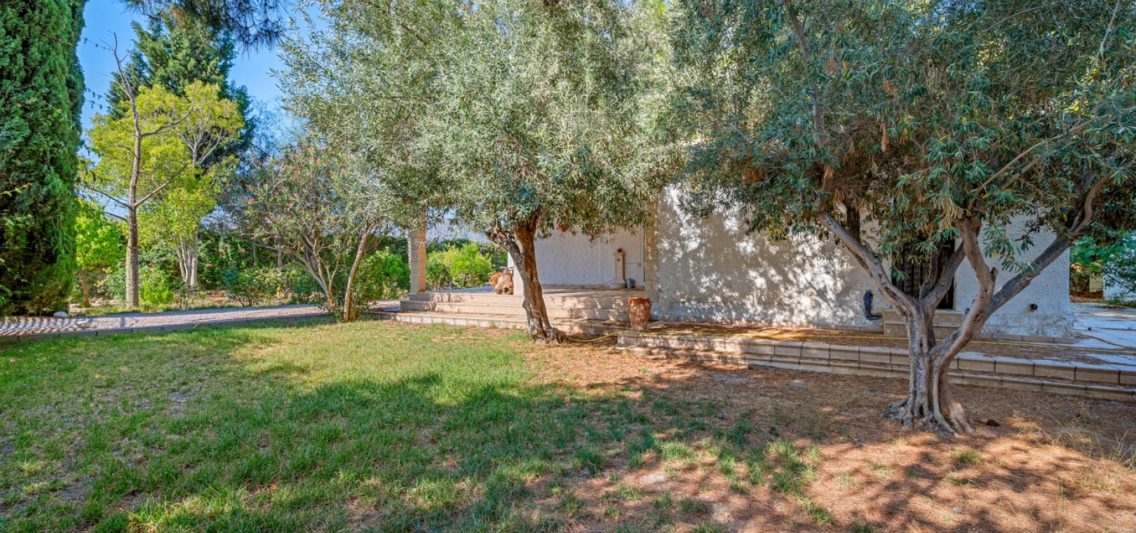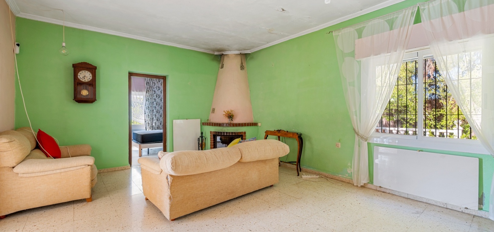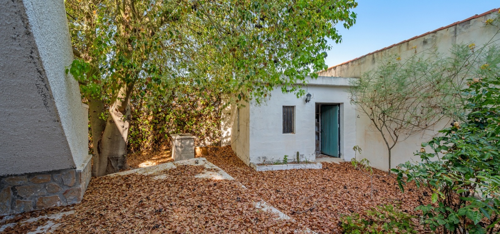 L’entrée principale permet de garer en privé avec accès direct au porche. À l’intérieur, un vaste salon-salle à manger avec cheminée maçonnée. D’un côté se trouve la chambre principale, et de l’autre, la cuisine avec buanderie, plus un petit hall menant à deux chambres supplémentaires séparées par la salle de bains. Une terrasse extérieure est idéale pour admirer le coucher de soleil ou profiter de l’espace piscine en évitant le grand solarium. Depuis cette terrasse, vous accédez au jardin entourant la maison, avec un grand espace comprenant piscine privée, barbecue et jardin naturel — parfait pour profiter du climat et de la tranquillité. Il y a également une petite dépendance qui pourrait être transformée en cuisine d’été ou pool‑bar.