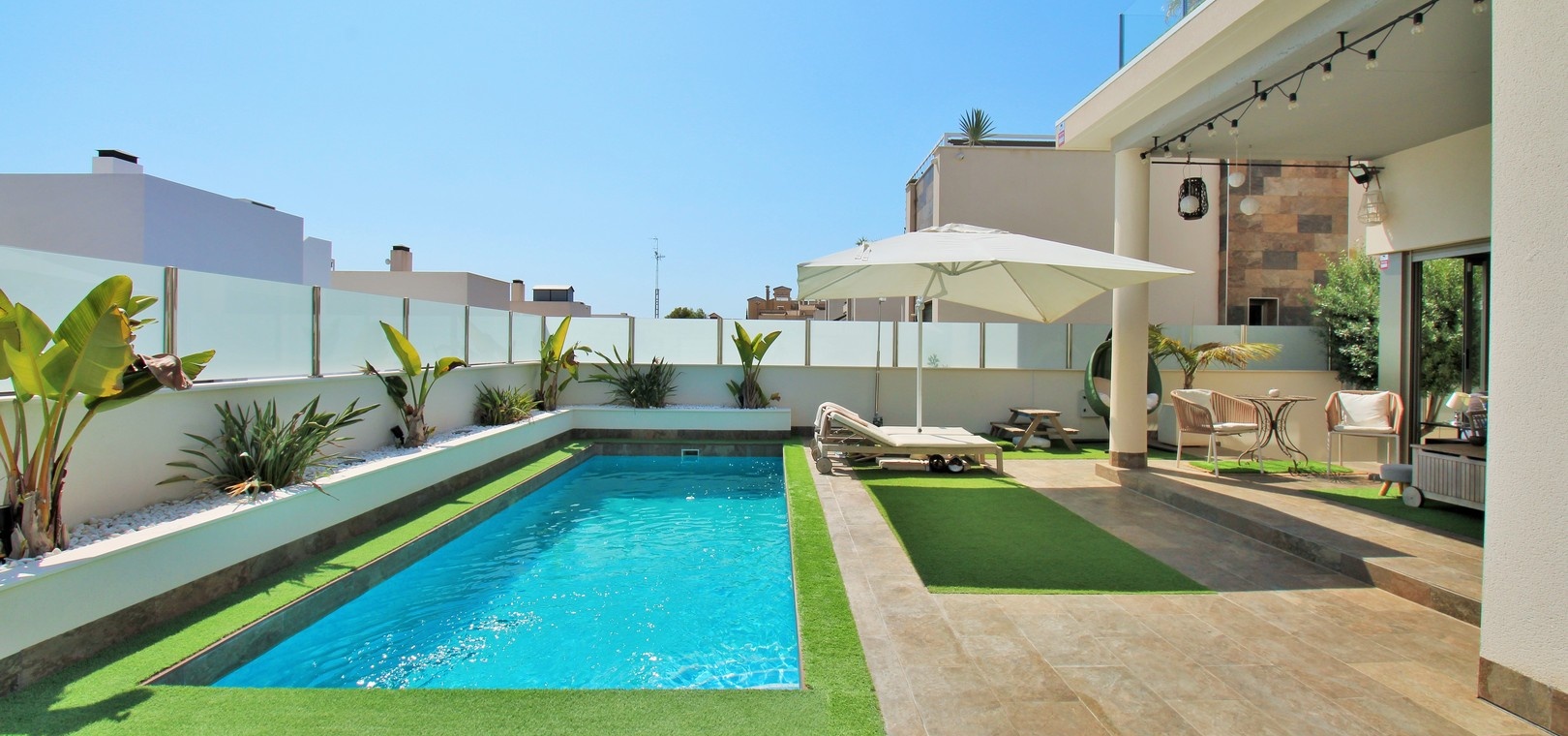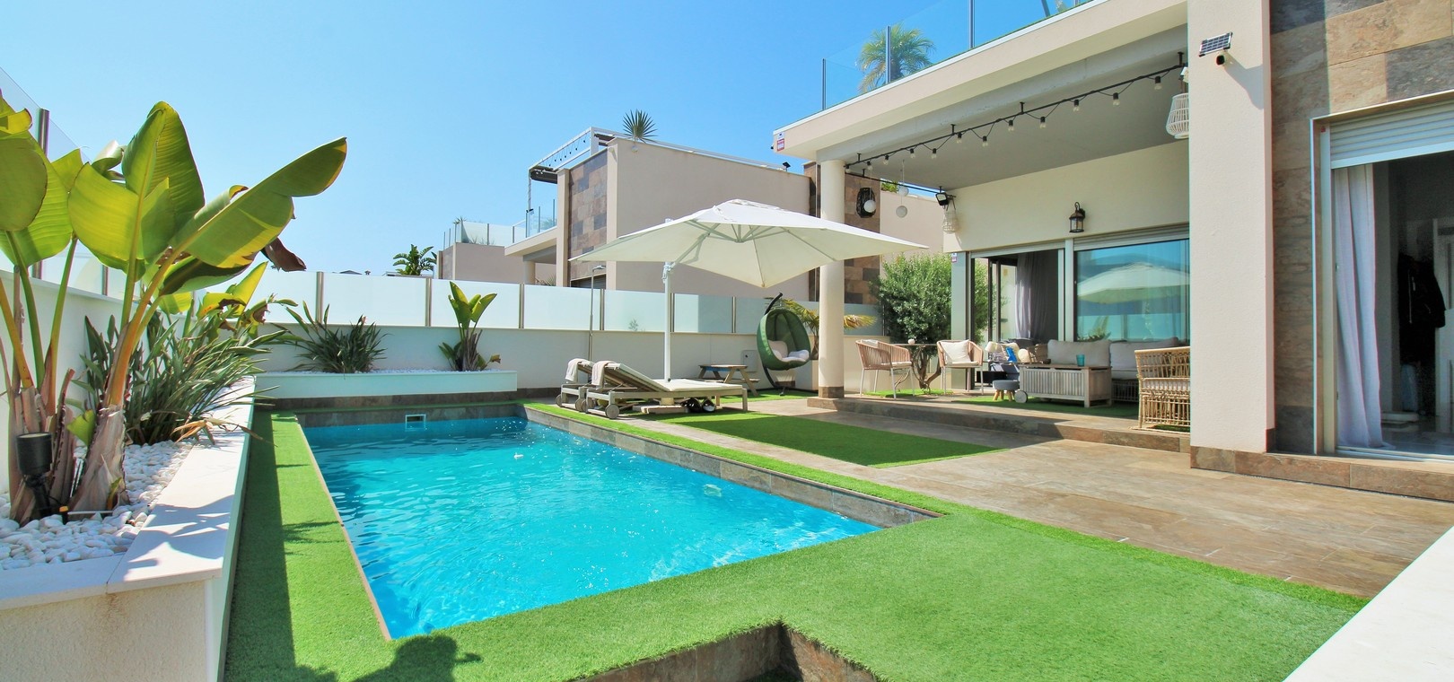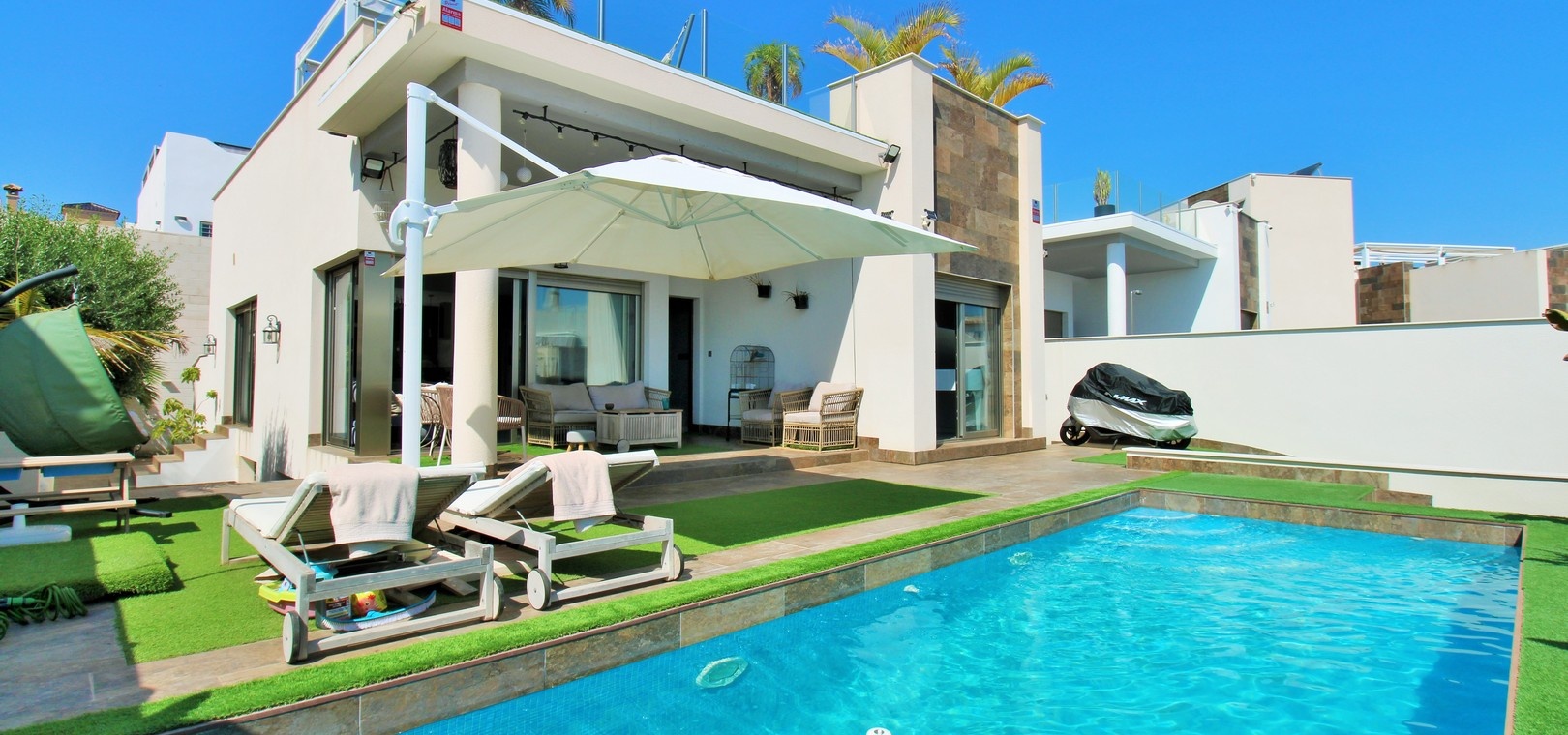 Cette villa Innova de 5 chambres bien aménagée est située dans un quartier très recherché de Villamartin, offrant une vie élégante de plain-pied, une piscine privée, un solarium sur le toit pleine grandeur et un généreux jardin en forme de L avec une terrasse couverte, parfait pour se détendre ou se divertir.