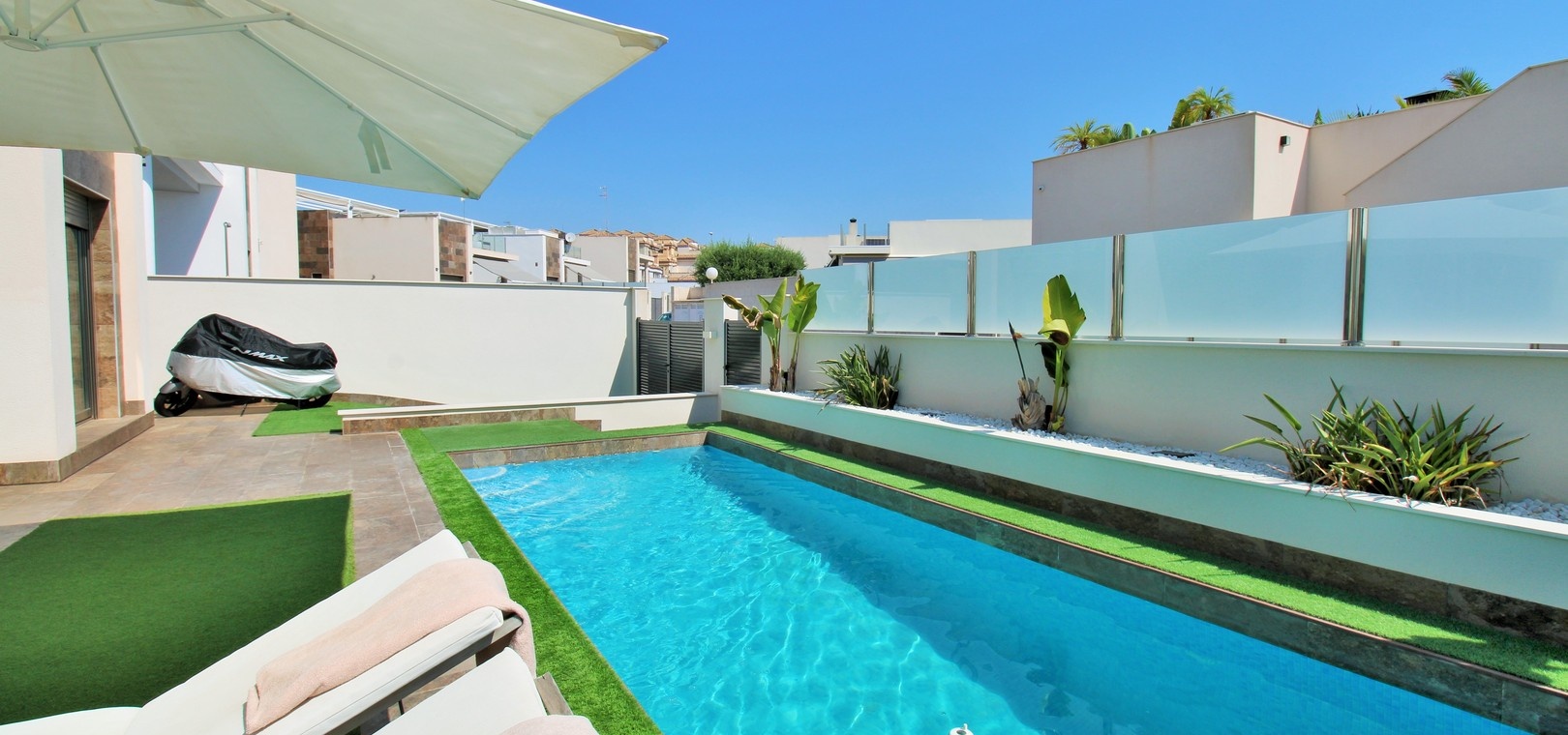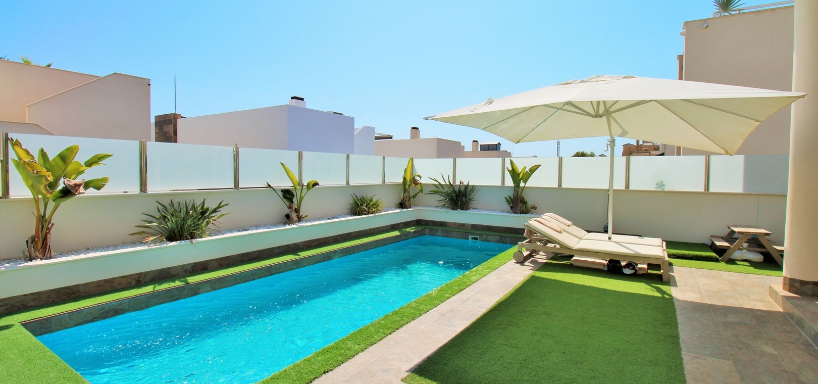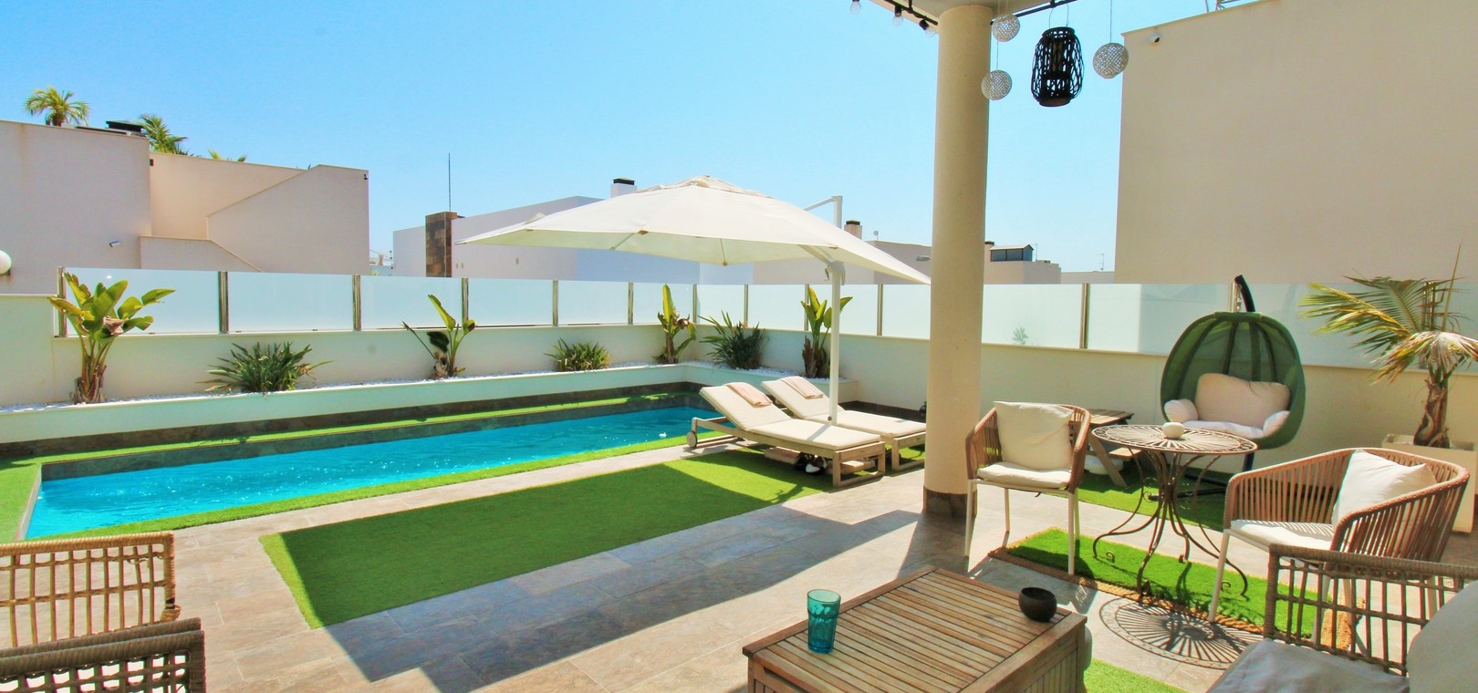 Cette villa Innova de 5 chambres bien aménagée est située dans un quartier très recherché de Villamartin, offrant une vie élégante de plain-pied, une piscine privée, un solarium sur le toit pleine grandeur et un généreux jardin en forme de L avec une terrasse couverte, parfait pour se détendre ou se divertir.