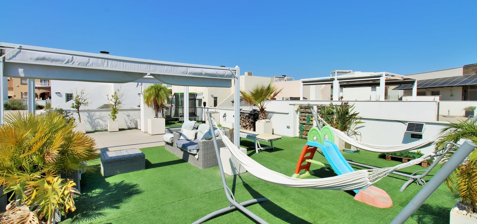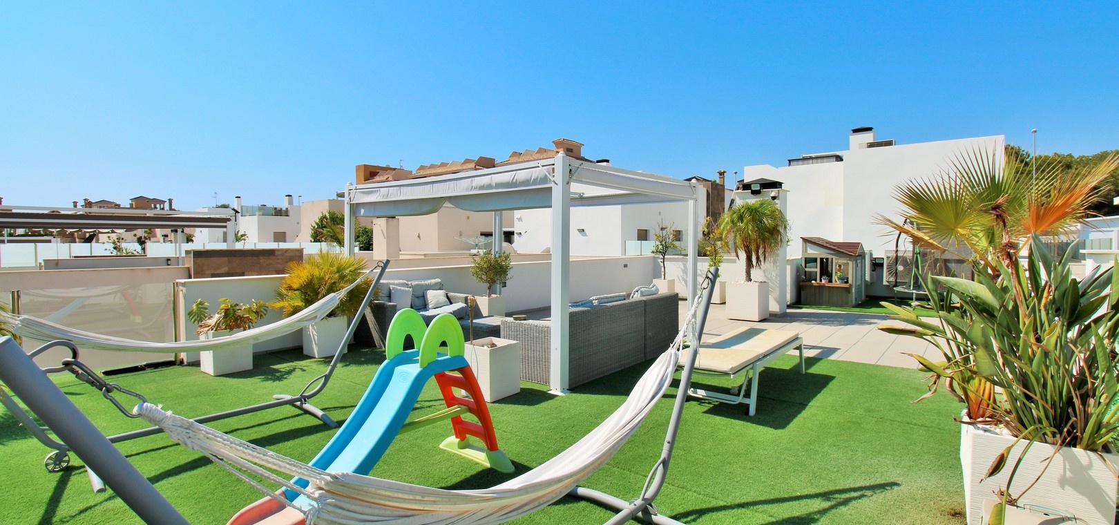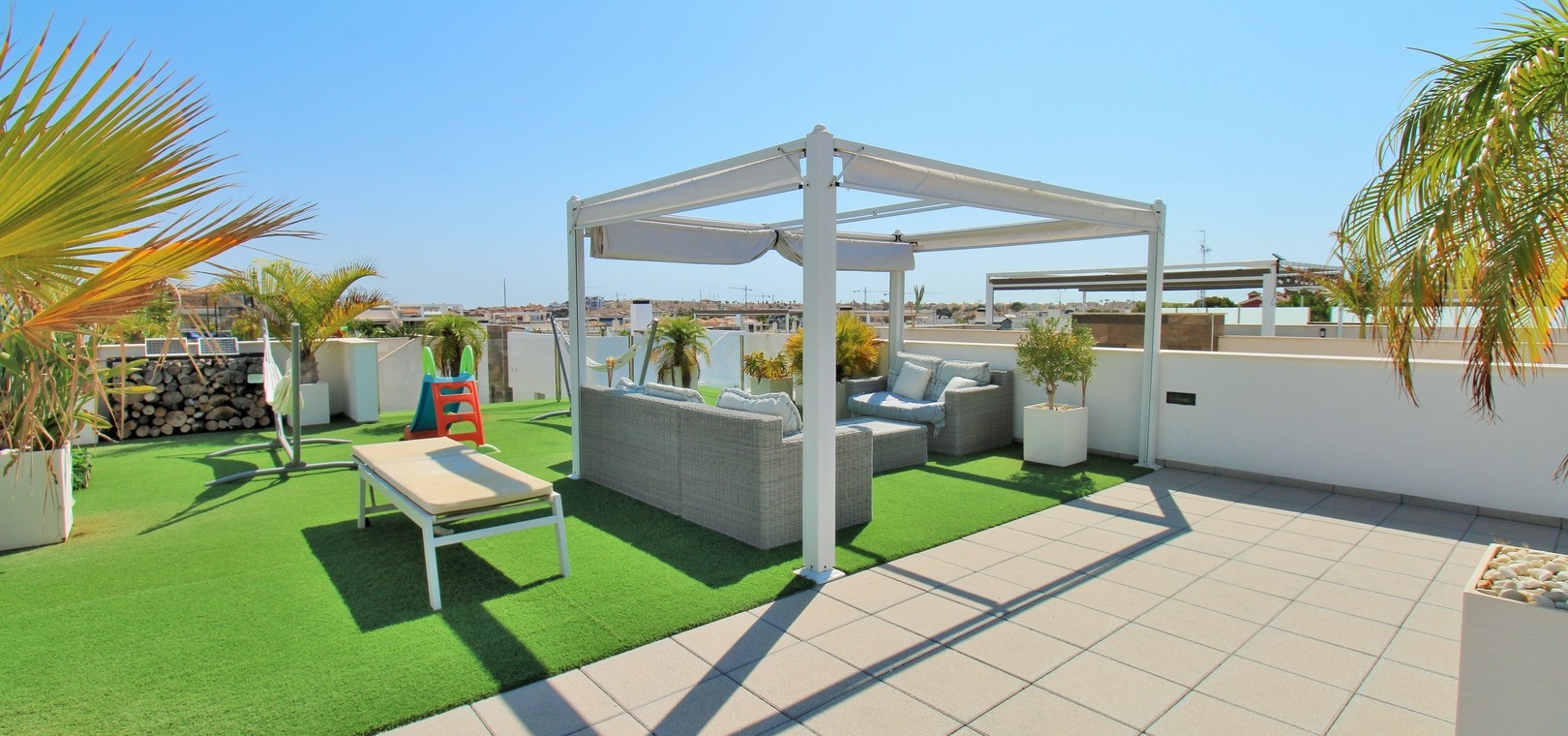 Un escalier extérieur mène au solarium sur le toit, qui s'étend sur toute la surface de la maison. Doté de stores rétractables et d'un vaste espace pour les chaises longues ou les repas, c'est un refuge extérieur exceptionnel.