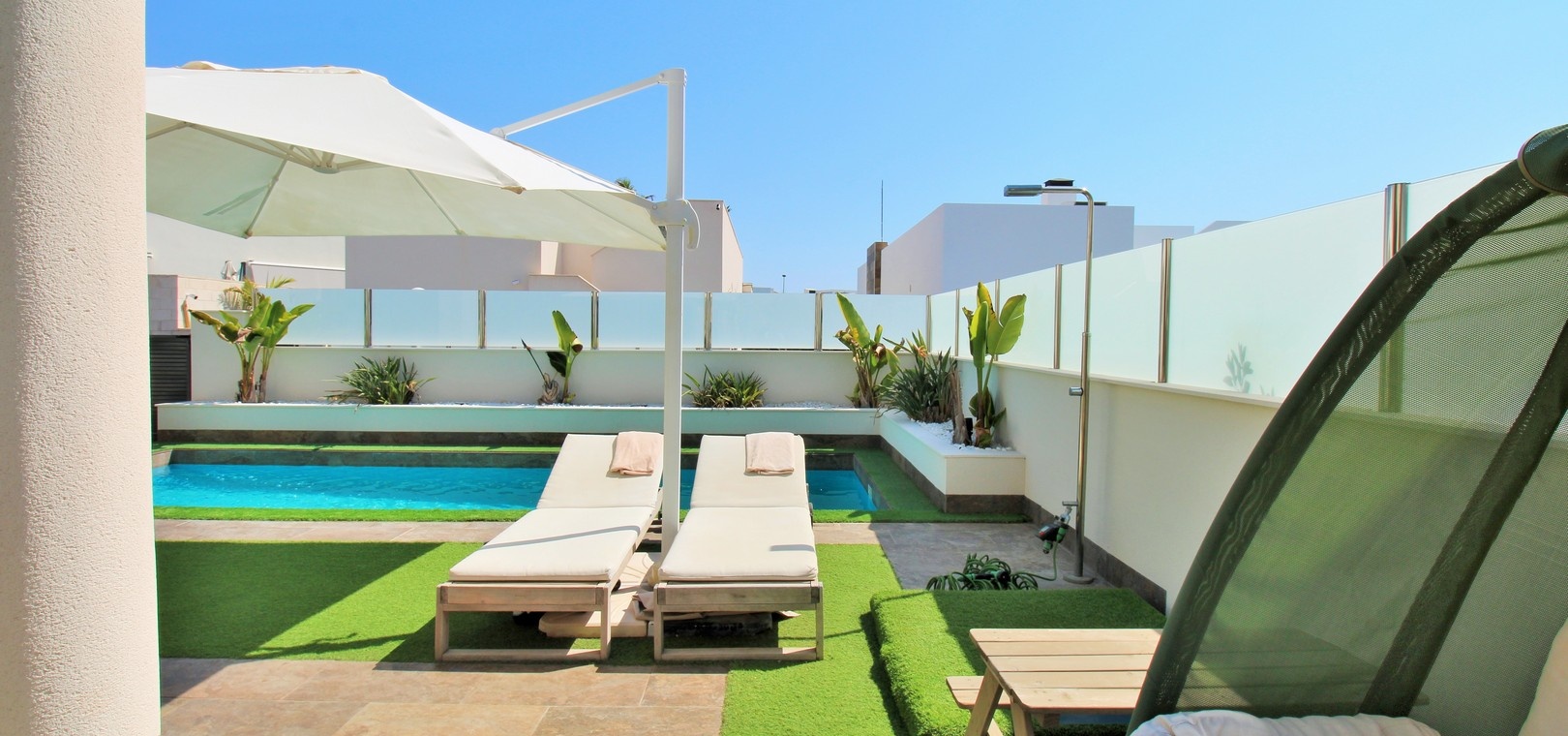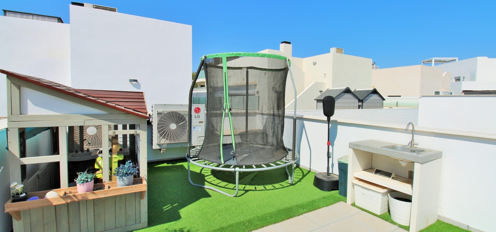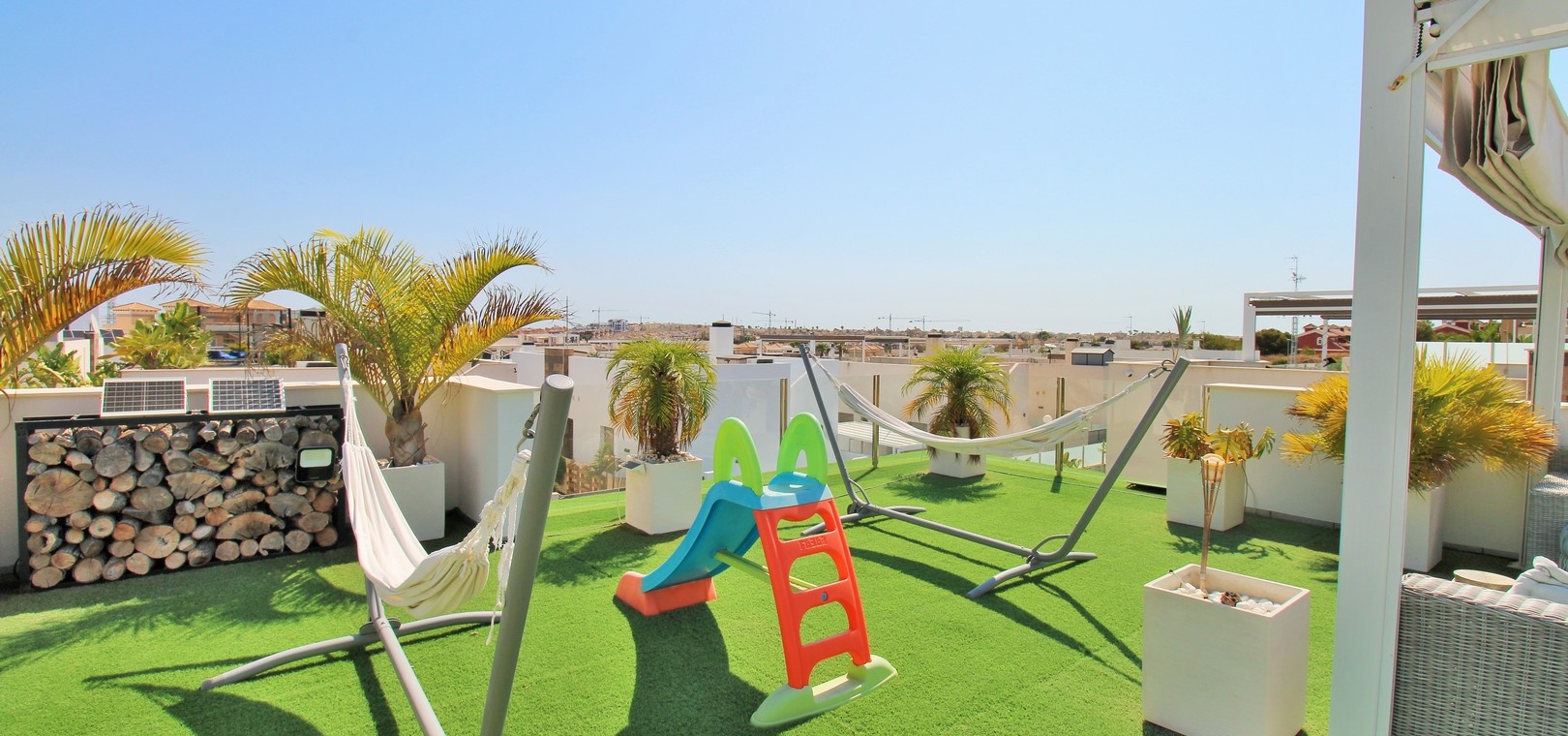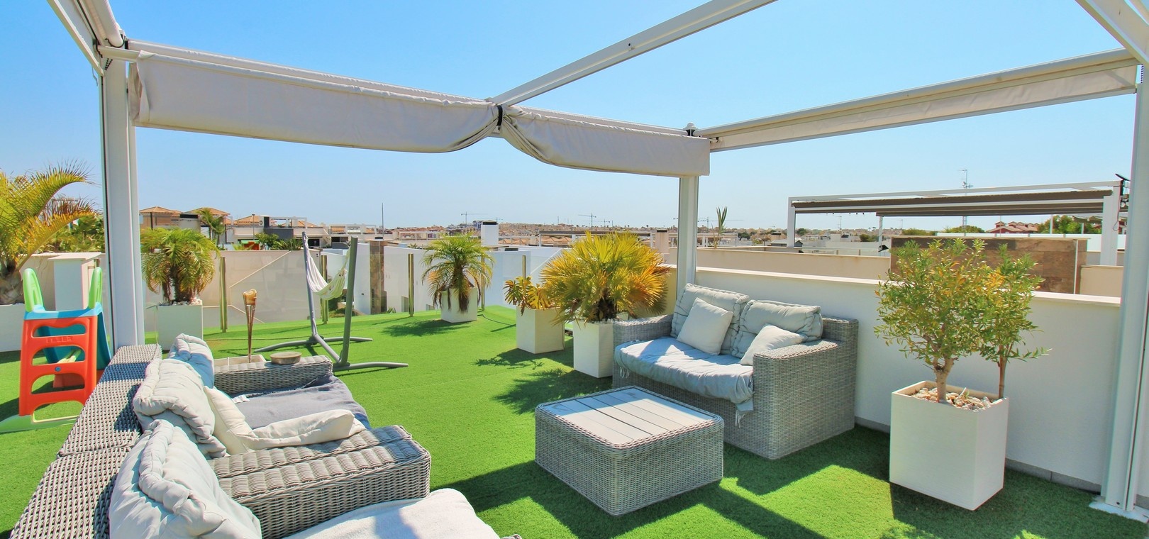 Un escalier extérieur mène au solarium sur le toit, qui s'étend sur toute la surface de la maison. Doté de stores rétractables et d'un vaste espace pour les chaises longues ou les repas, c'est un refuge extérieur exceptionnel.