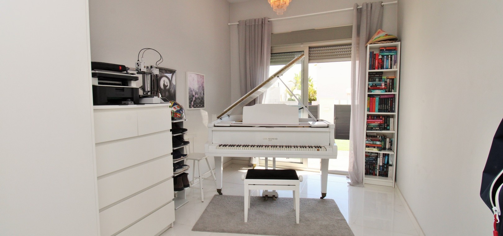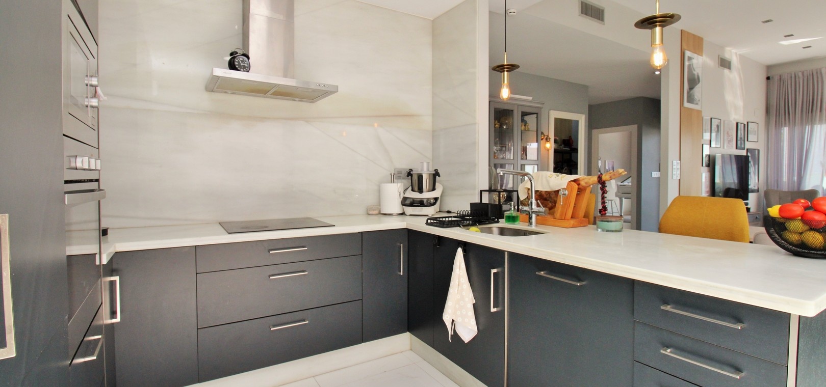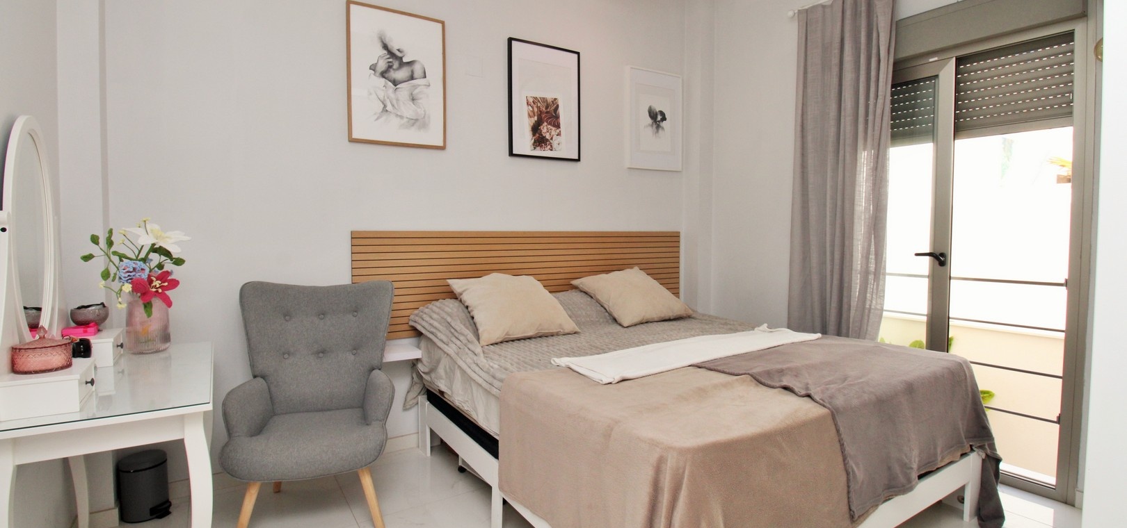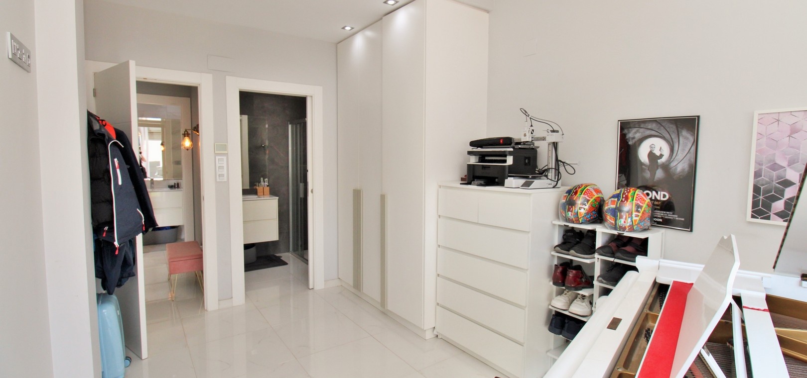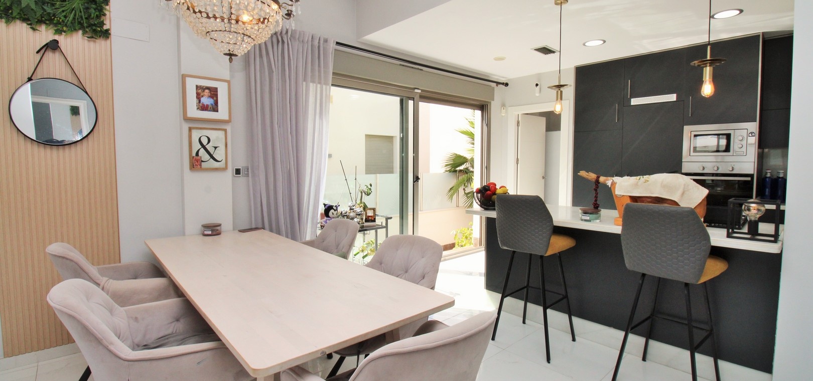 À l'intérieur, le salon et la salle à manger décloisonnés communiquent harmonieusement avec une cuisine américaine moderne équipée d'appareils électroménagers intégrés, dont un réfrigérateur-congélateur et un lave-vaisselle. Une buanderie séparée ajoute à la fonctionnalité. La chambre principale dispose d'une salle de bains attenante, tandis qu'une salle de bains familiale avec douche à l'italienne dessert les autres pièces. De hauts plafonds et de grandes fenêtres inondent la villa de lumière naturelle, tandis que des stores électriques et une climatisation réversible assurent confort et intimité tout au long de l'année.