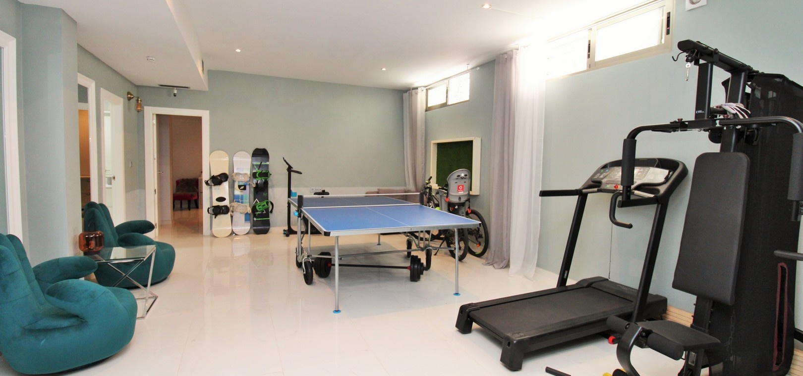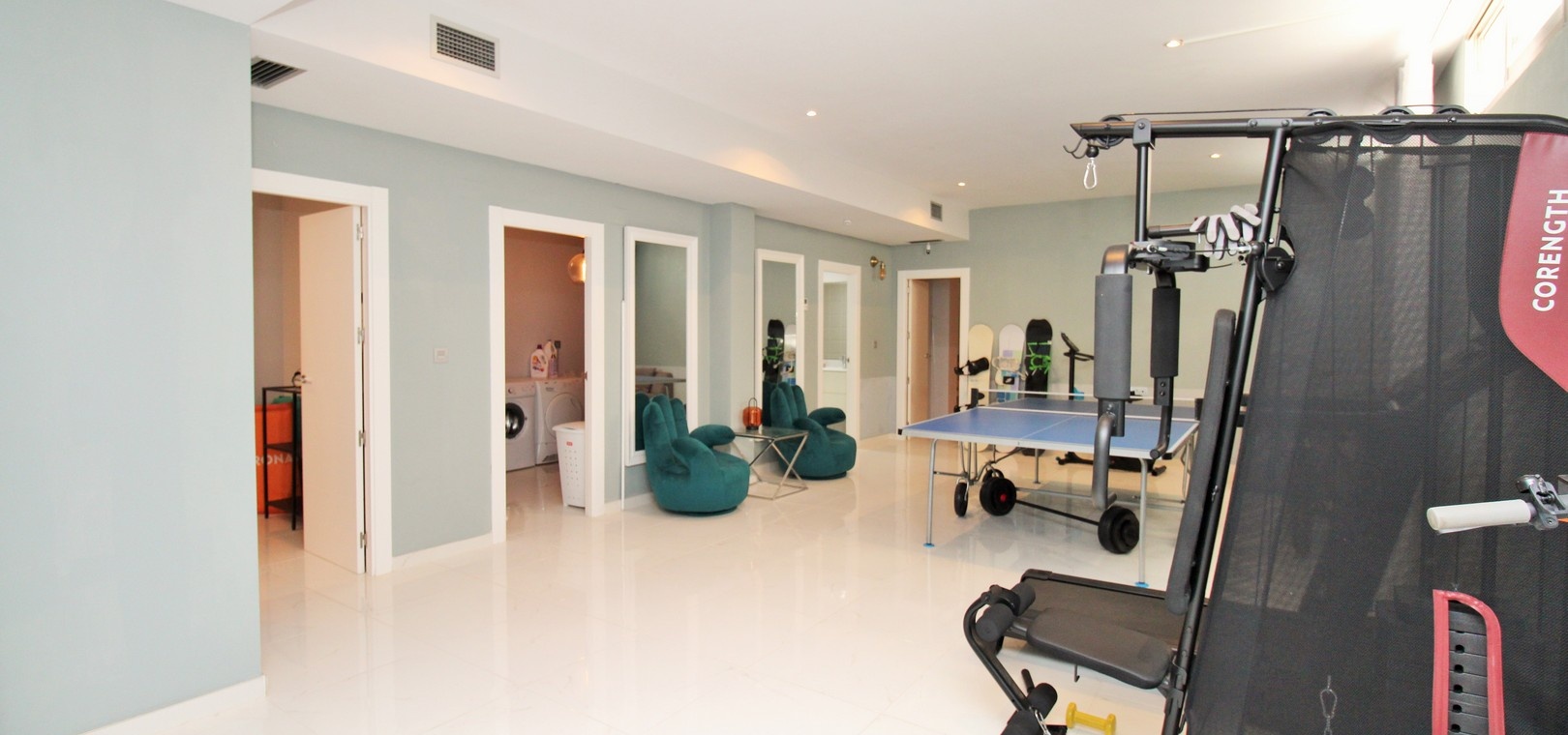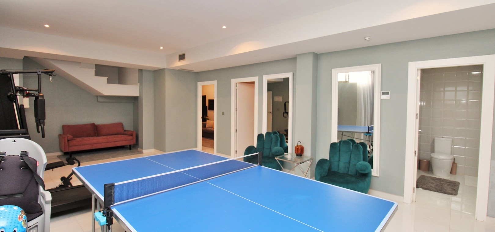 Depuis la cuisine, des escaliers mènent à un sous-sol spacieux offrant deux chambres doubles supplémentaires (une avec salle de bains privative), une buanderie, une salle de bains et une salle de jeux ou une salle de sport polyvalente, idéale pour les invités, la famille élargie ou une utilisation flexible.