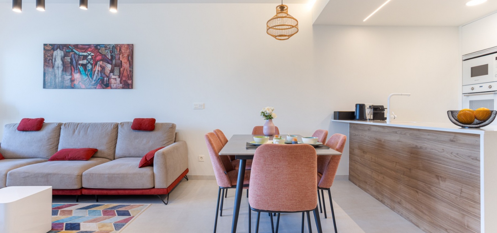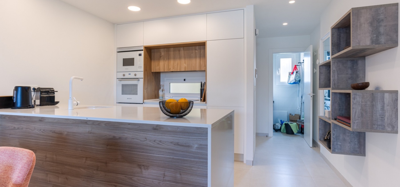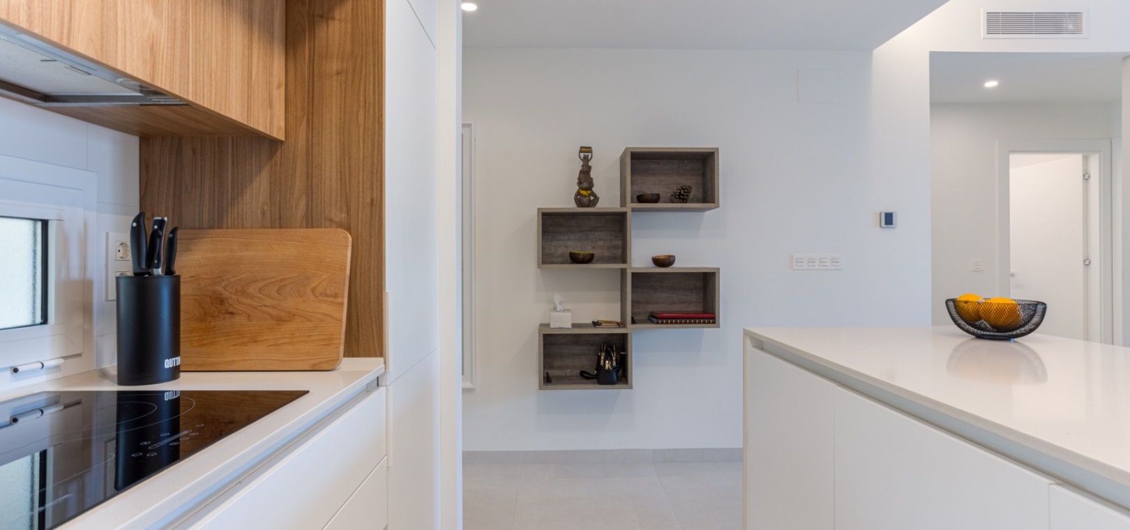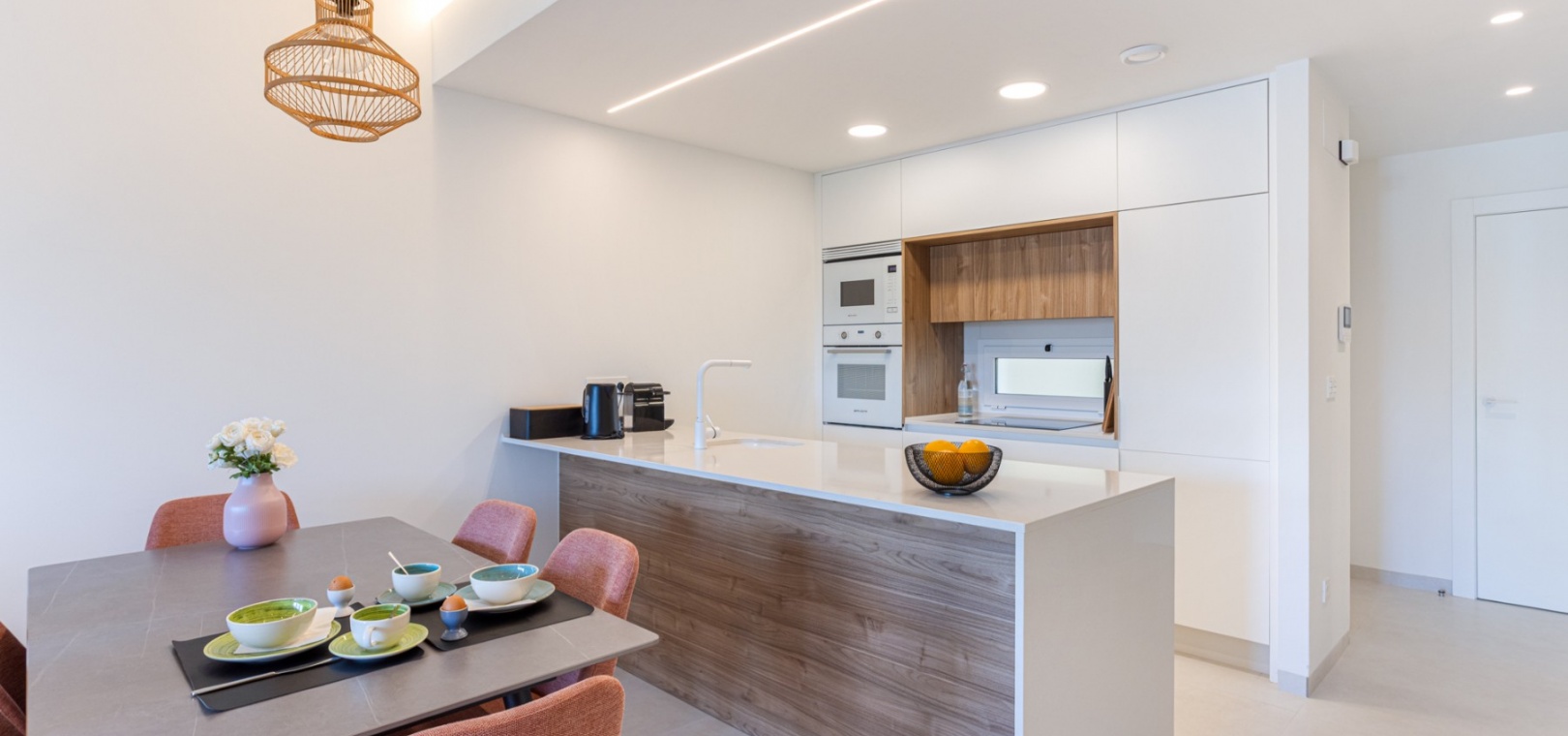 La cuisine ouverte est entièrement équipée d'appareils électroménagers modernes et s'intègre dans un spacieux et chaleureux salon-salle à manger, idéal pour passer des moments en famille ou entre amis. Le salon s'ouvre sur une terrasse privée exposée sud-ouest avec vue sur la piscine, idéale pour se détendre au coucher du soleil et profiter du climat chaud de la Costa Blanca toute l'année.