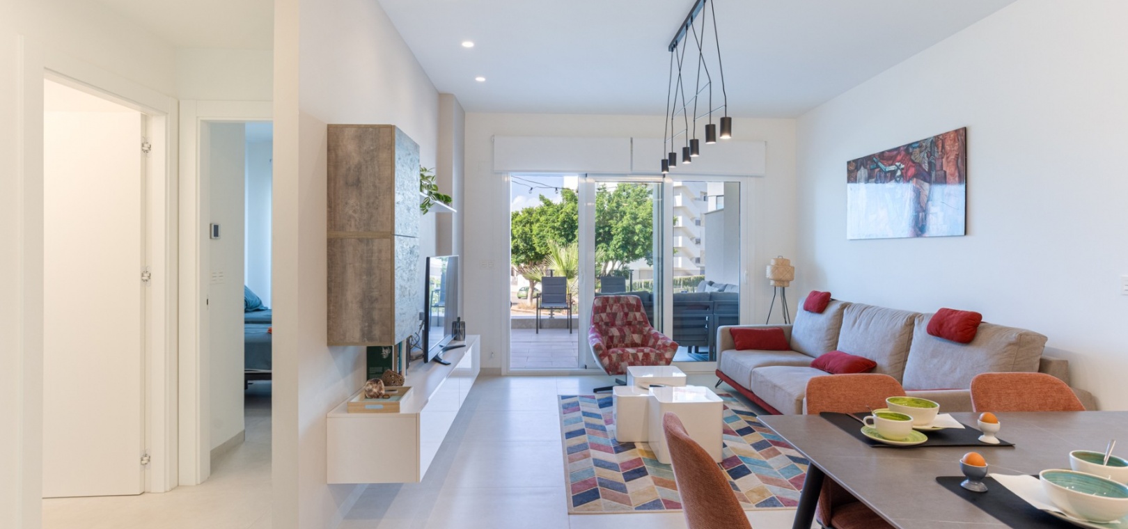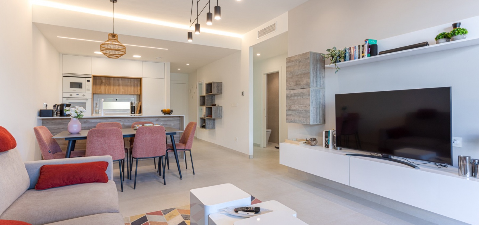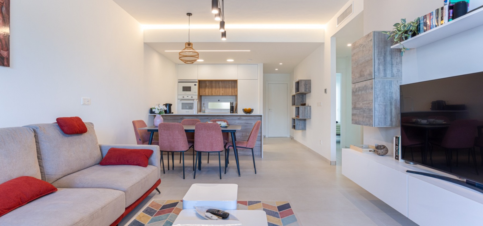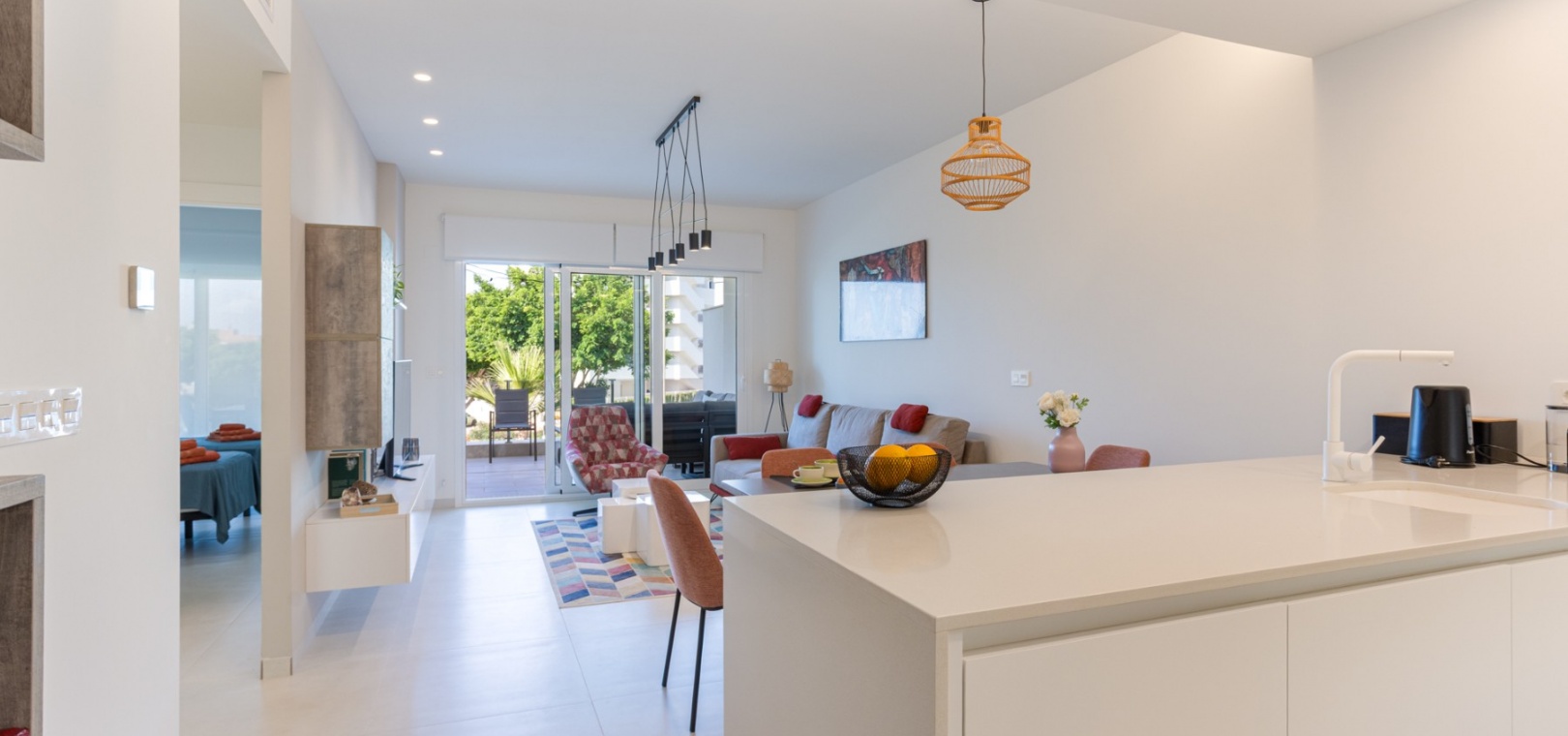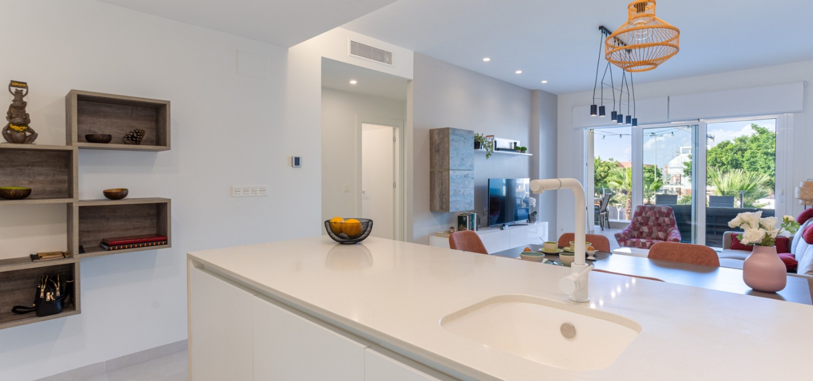 La cuisine ouverte est entièrement équipée d'appareils électroménagers modernes et s'intègre dans un spacieux et chaleureux salon-salle à manger, idéal pour passer des moments en famille ou entre amis. Le salon s'ouvre sur une terrasse privée exposée sud-ouest avec vue sur la piscine, idéale pour se détendre au coucher du soleil et profiter du climat chaud de la Costa Blanca toute l'année.