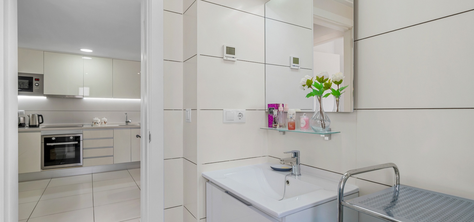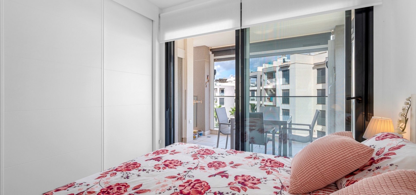 L'appartement est vendu entièrement meublé et comprend un spacieux séjour/salle à manger, une cuisine ouverte moderne entièrement équipée et la climatisation. La chambre principale comprend des placards et une salle de bains attenante, tandis que la deuxième chambre dispose également de placards et d'un accès à une seconde salle de bains avec douche à l'italienne.