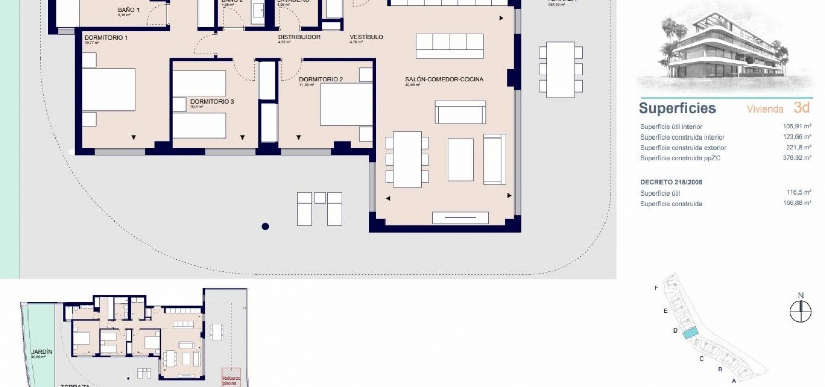 Le complexe résidentiel est conçu avec des lignes douces et élégantes et s'intègre harmonieusement dans son environnement naturel. Il offre un total de 60 appartements dans la phase 1, disponibles avec 2 et 3 chambres à coucher. La distribution comprend