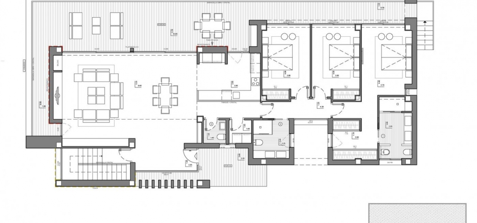 Cette villa est construite sur deux étages, l'entrée principale est au dernier étage, avec deux ailes clairement définies. Sur le côté droit, nous avons l'aire de repos, où se trouvent les 3 chambres. Une des chambres a un grand dressing et une salle de bain attenante; les deux autres chambres ont une salle de bain partagée et de grandes armoires. Toutes les chambres ont un accès direct à la terrasse et à la vue sur la mer. Dans l'autre aile, se trouve la zone jour, avec une cuisine, qui rejoint la salle à manger et le porche extérieur, le salon, des toilettes invités, une salle de lavage, etc.