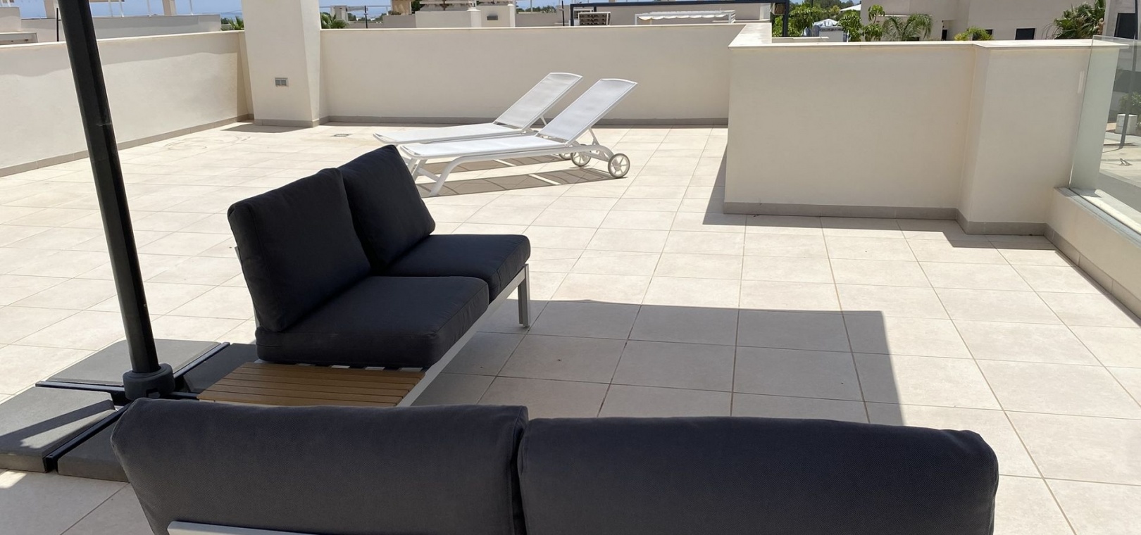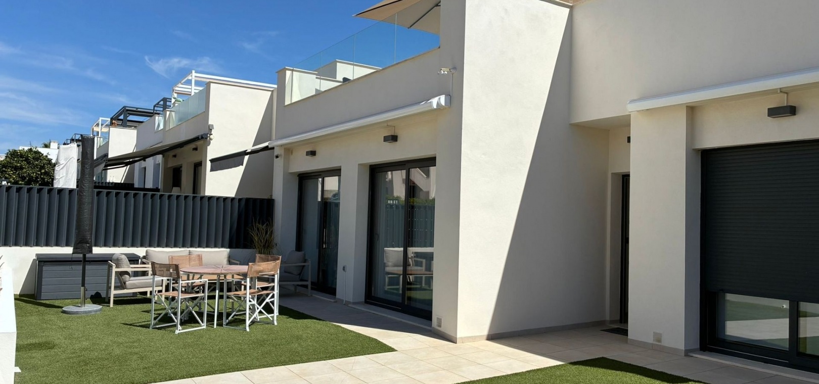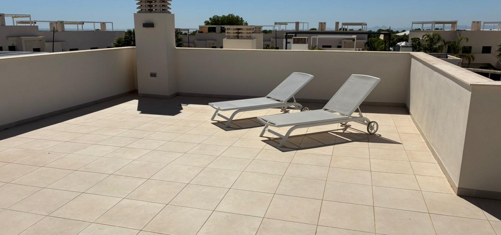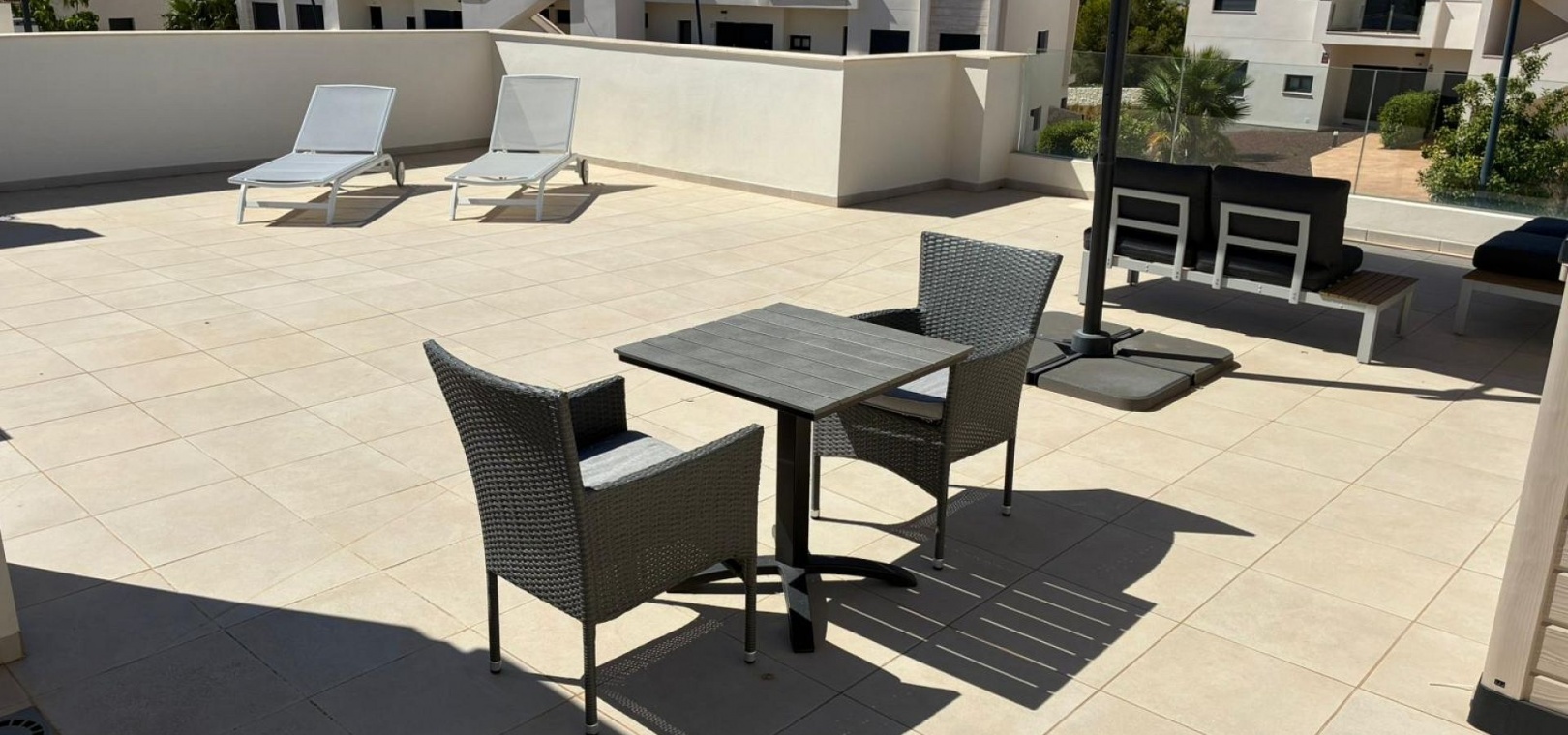 185 m² de surface construite 3 chambres spacieuses et 2 salles de bains élégantes Séjour lumineux avec cuisine ouverte Grande terrasse et solarium de 80 m² avec vue sur la mer Jardin privé nécessitant peu d'entretien Place de parking sur la parcelle Climatisation centrale (chaud et froid), placards intégrés et volets électriques Entièrement meublé et en parfait état Piscine commune à seulement 30 mètres