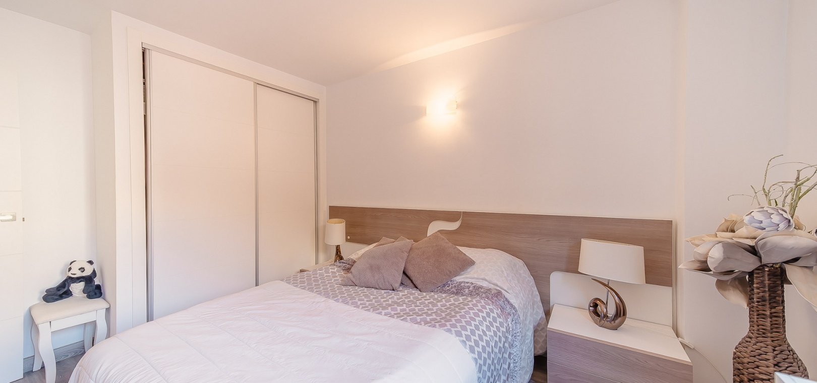 3 chambres et 2 salles de bains Cuisine séparée 92 m² construits Terrasse privée avec vue sur la mer Troisième étage avec ascenseur Orientation Est Entièrement meublé et rénové Climatisation IBI : 280 €/an