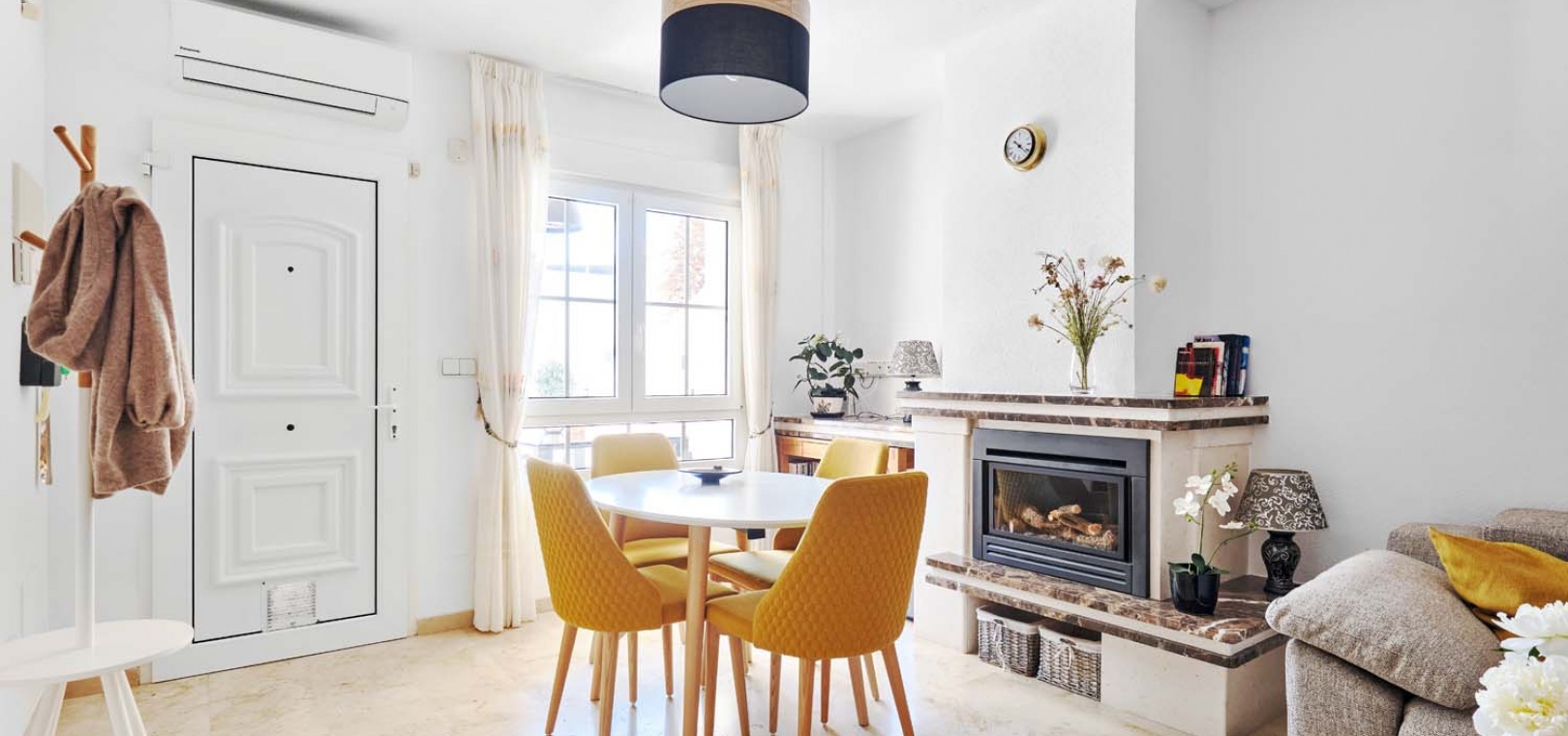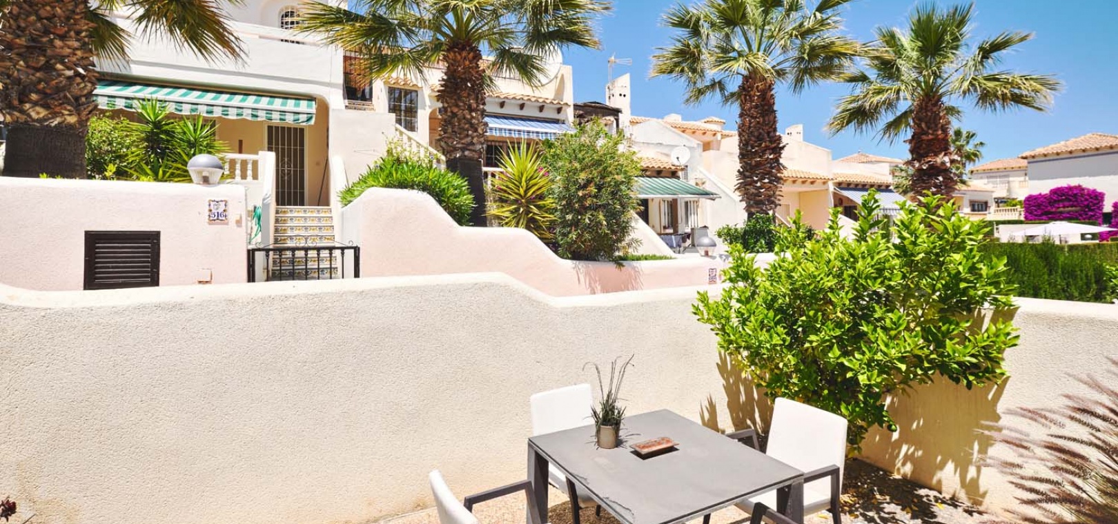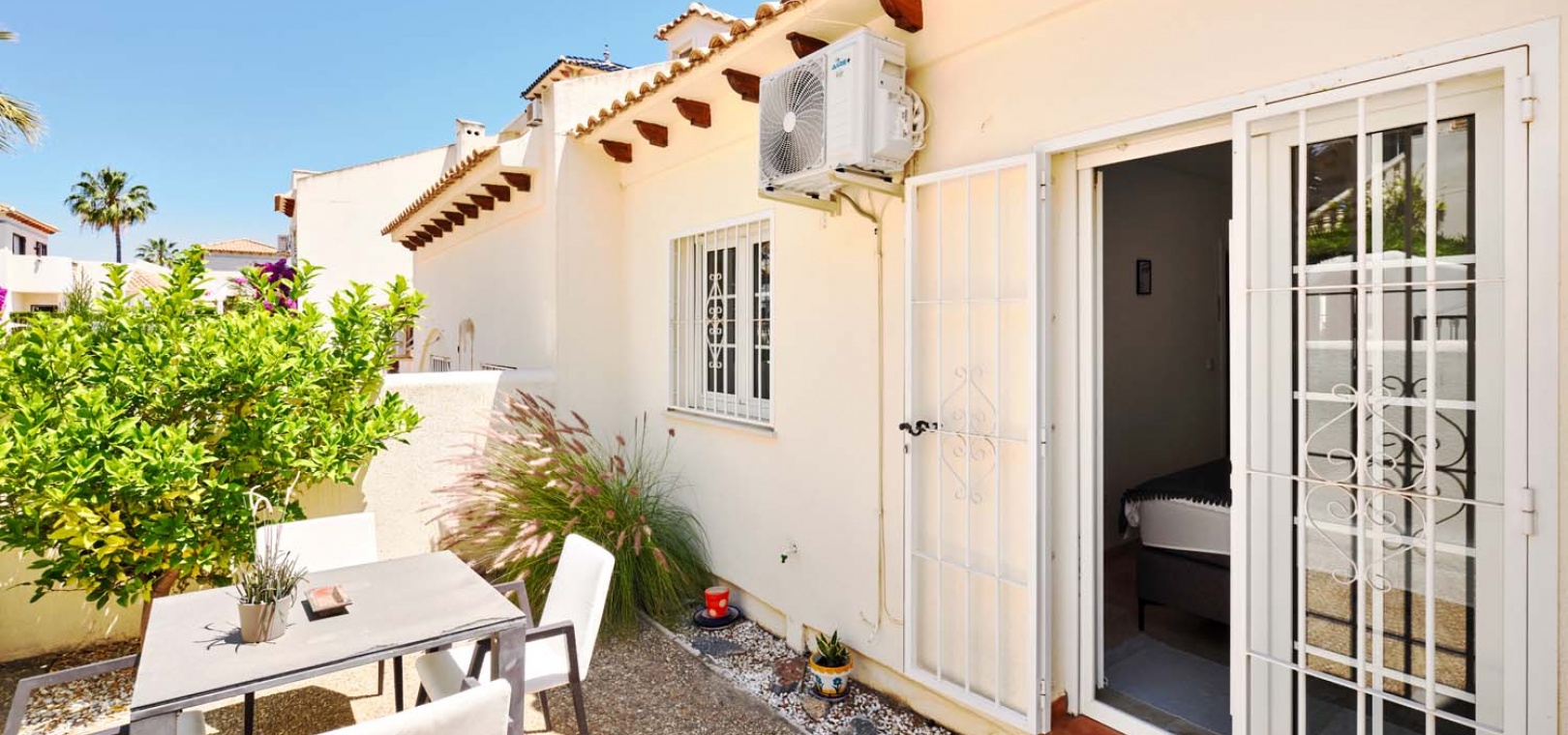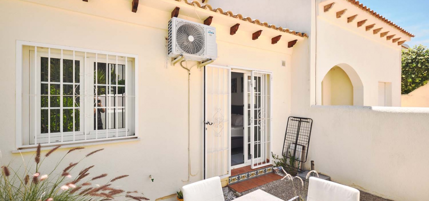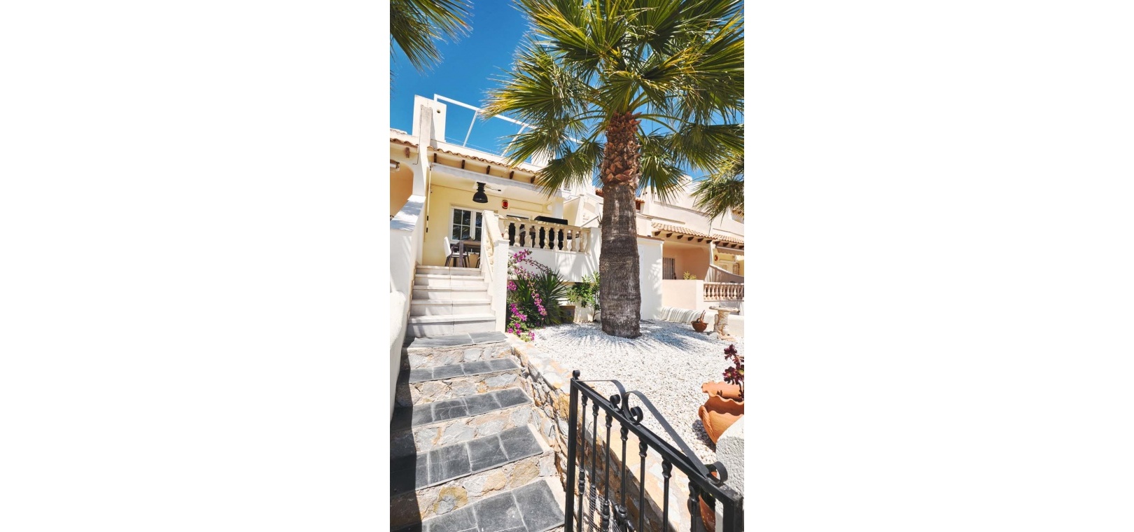 Jardin devant avec quelques marches menant à une terrasse semi-couverte prolongée avec un auvent. Salon et salle à manger lumineux et spacieux à aire ouverte avec foyer au gaz et climatisation, relié à une cuisine bien équipée avec bar à petit-déjeuner. Buanderie arrière avec machine à laver. Deux chambres doubles au rez-de-chaussée, climatisées et équipées de placards intégrés. L'une d'elles comprend une salle de bains privative et des portes-fenêtres donnant sur un jardin arrière privé avec coin salon. Troisième chambre au premier étage avec salle de bain attenante, climatisation et accès à une grande terrasse ensoleillée. Accès à la piscine et aux jardins communs.