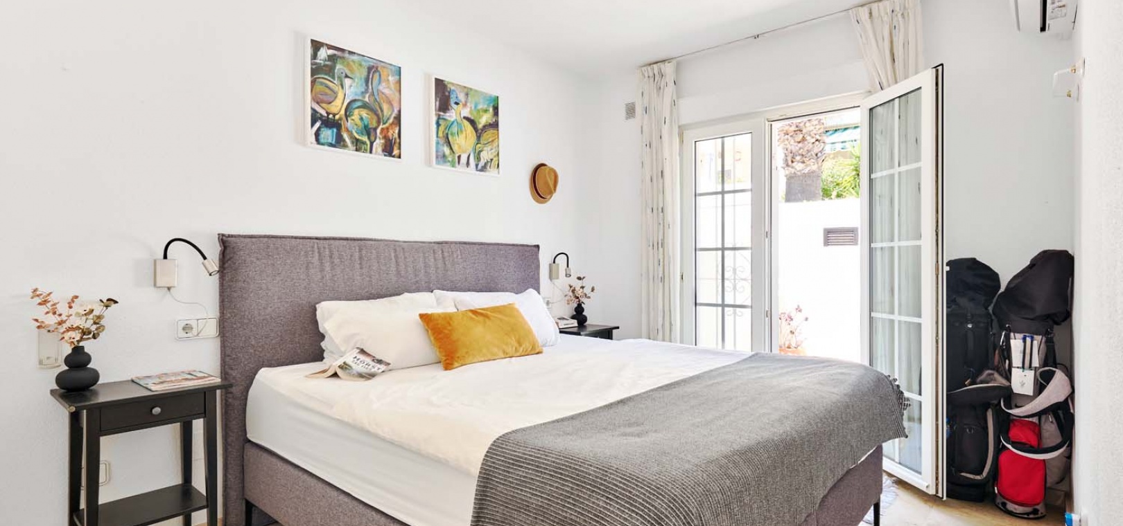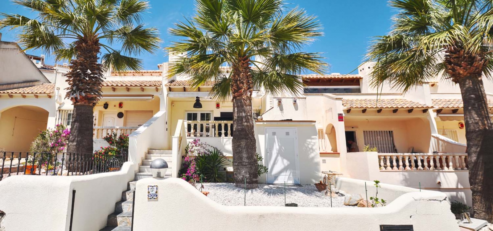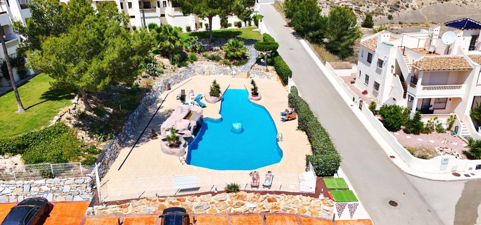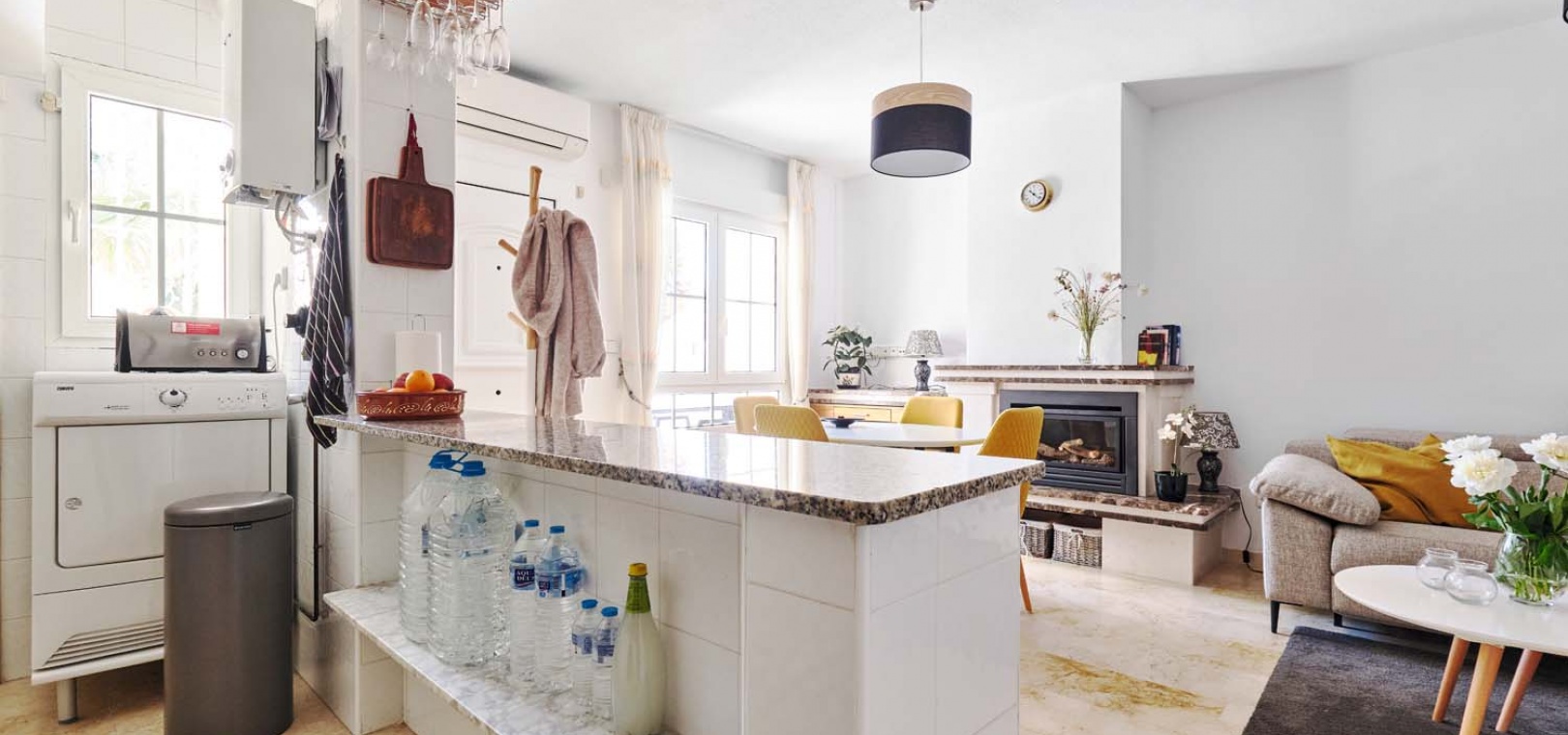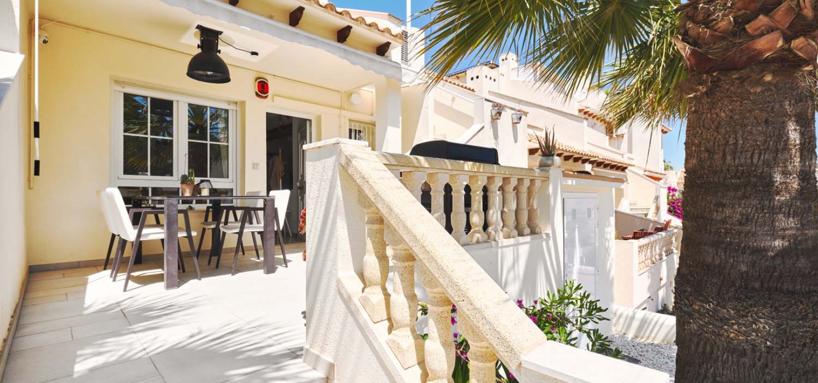Jardin devant avec quelques marches menant à une terrasse semi-couverte prolongée avec un auvent. Salon et salle à manger lumineux et spacieux à aire ouverte avec foyer au gaz et climatisation, relié à une cuisine bien équipée avec bar à petit-déjeuner. Buanderie arrière avec machine à laver. Deux chambres doubles au rez-de-chaussée, climatisées et équipées de placards intégrés. L'une d'elles comprend une salle de bains privative et des portes-fenêtres donnant sur un jardin arrière privé avec coin salon. Troisième chambre au premier étage avec salle de bain attenante, climatisation et accès à une grande terrasse ensoleillée. Accès à la piscine et aux jardins communs.