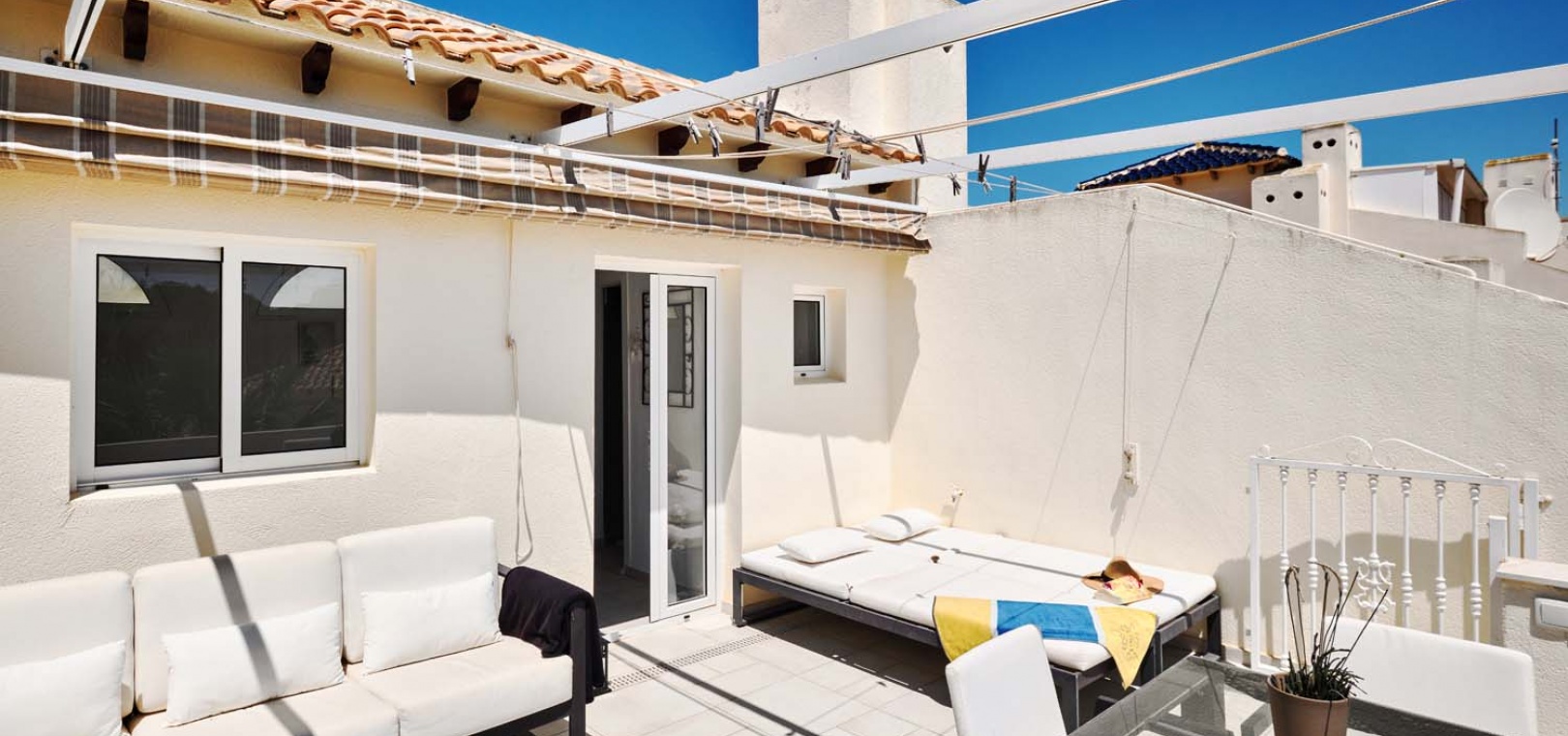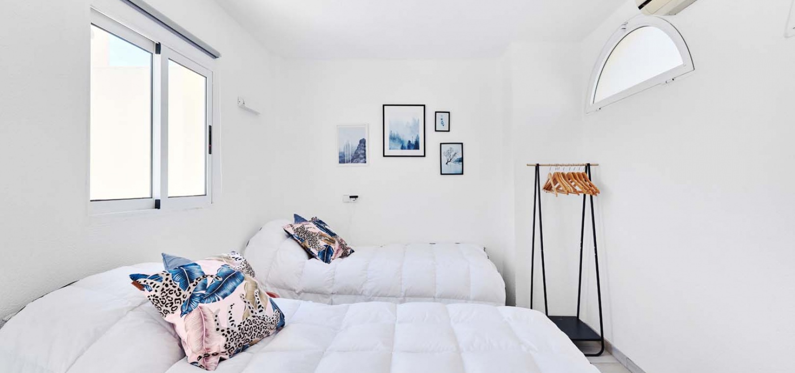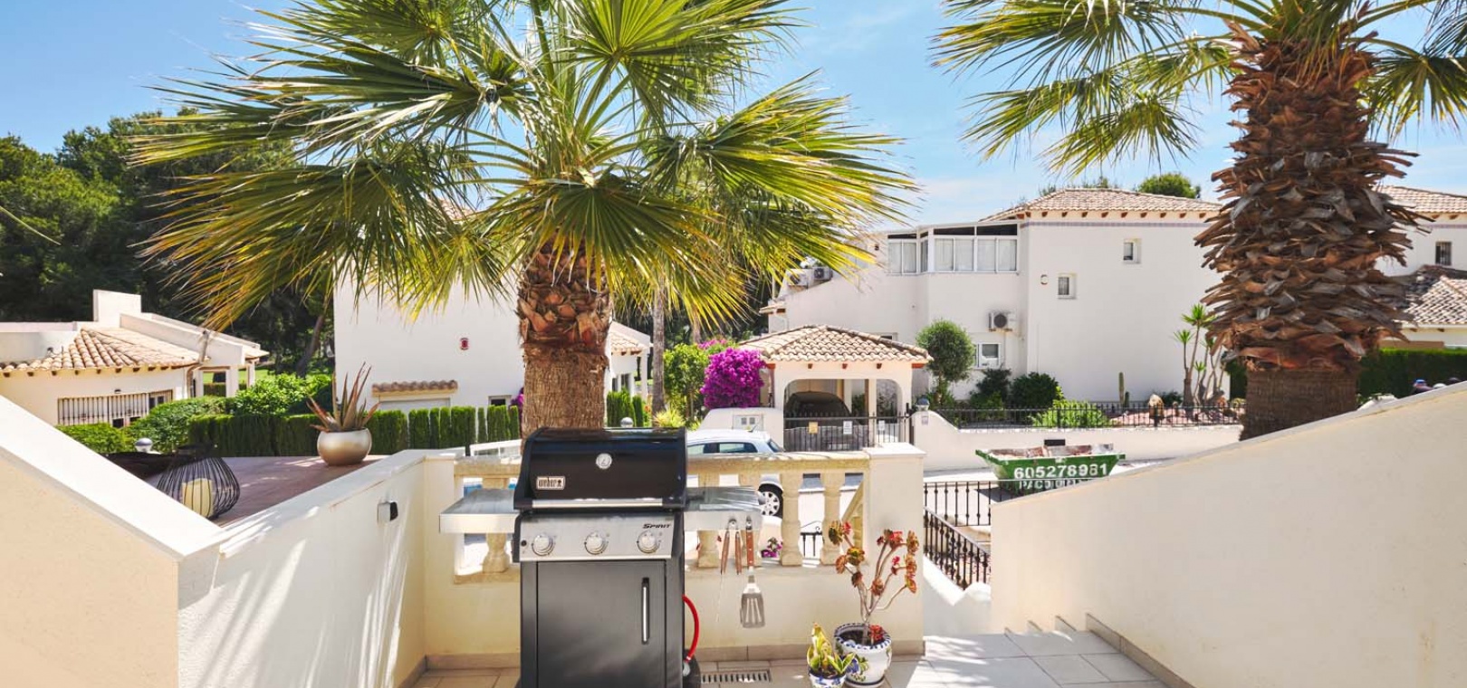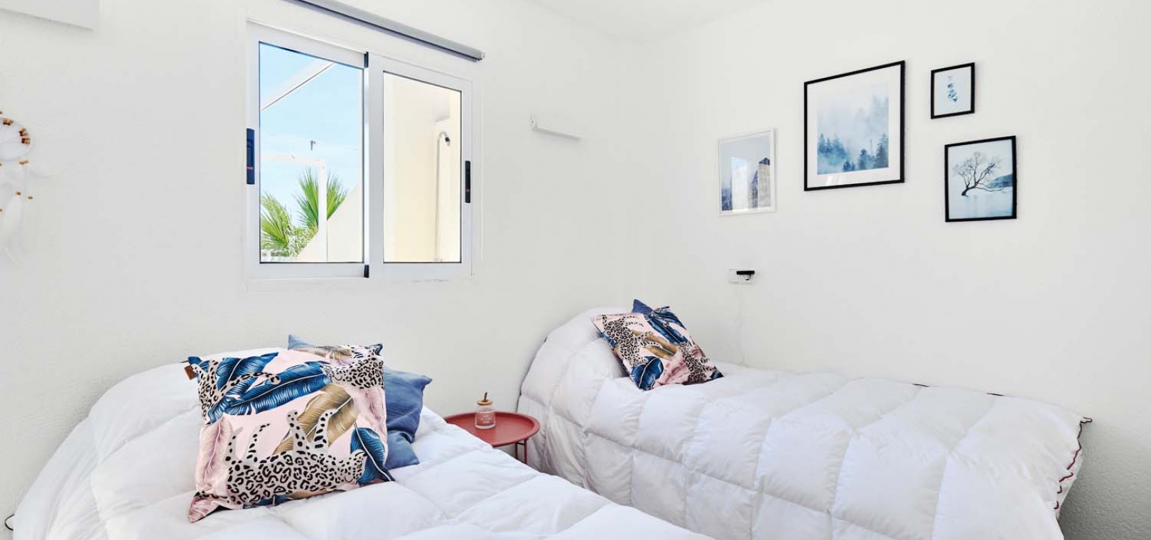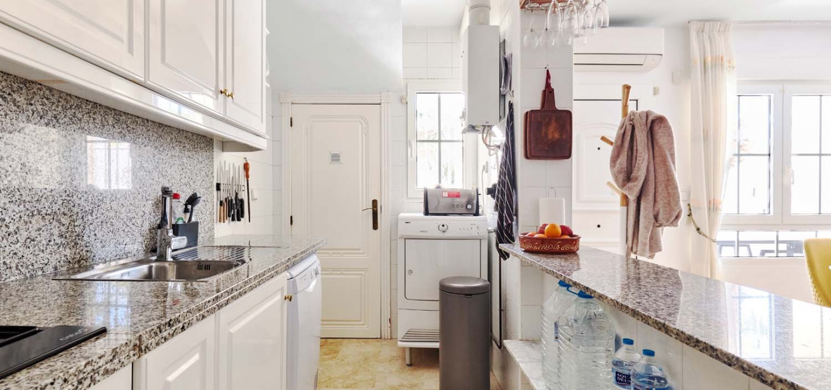 Jardin devant avec quelques marches menant à une terrasse semi-couverte prolongée avec un auvent. Salon et salle à manger lumineux et spacieux à aire ouverte avec foyer au gaz et climatisation, relié à une cuisine bien équipée avec bar à petit-déjeuner. Buanderie arrière avec machine à laver. Deux chambres doubles au rez-de-chaussée, climatisées et équipées de placards intégrés. L'une d'elles comprend une salle de bains privative et des portes-fenêtres donnant sur un jardin arrière privé avec coin salon. Troisième chambre au premier étage avec salle de bain attenante, climatisation et accès à une grande terrasse ensoleillée. Accès à la piscine et aux jardins communs.
