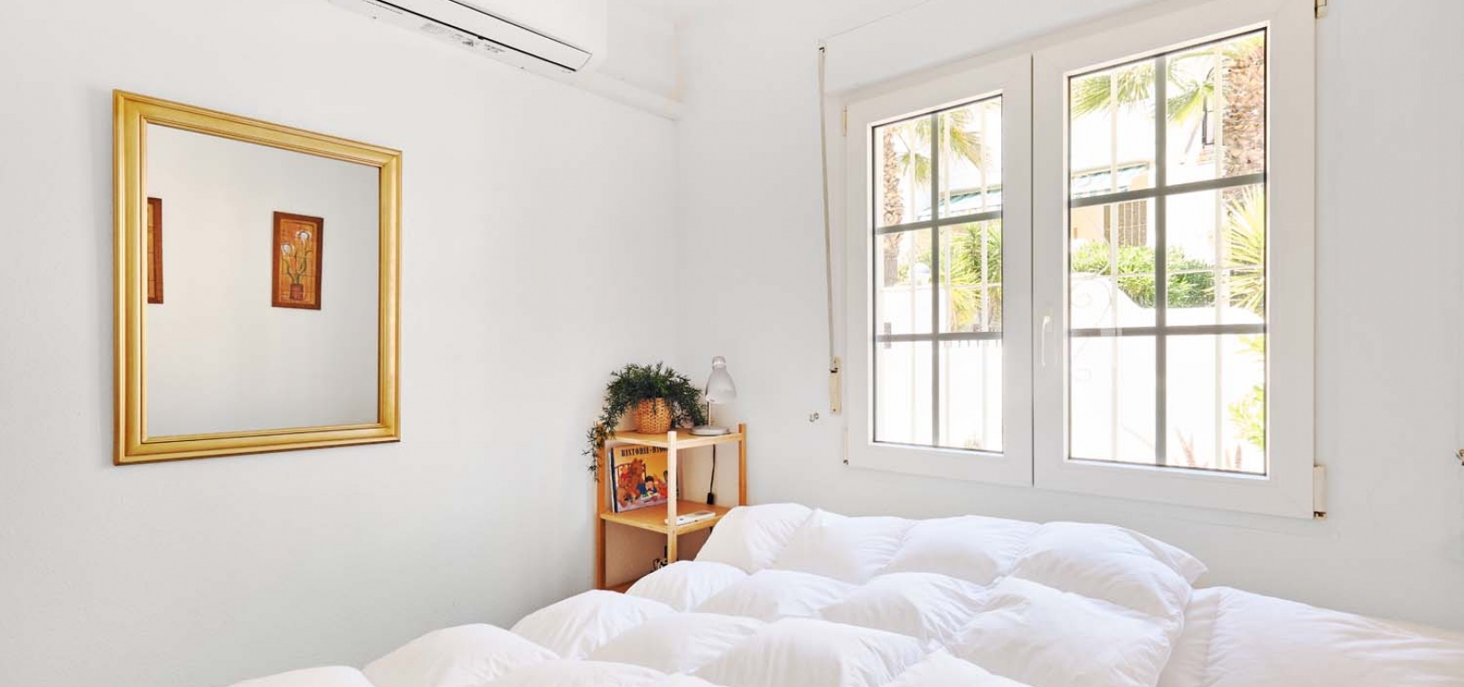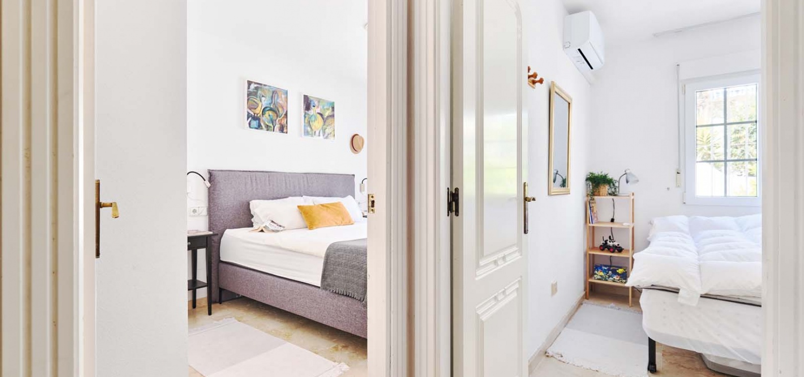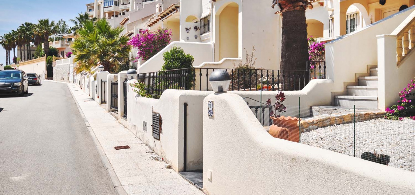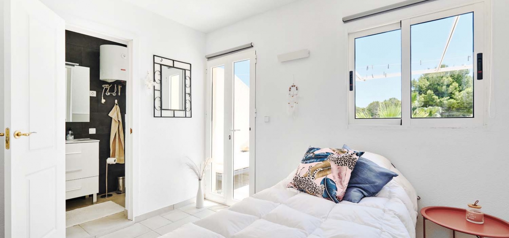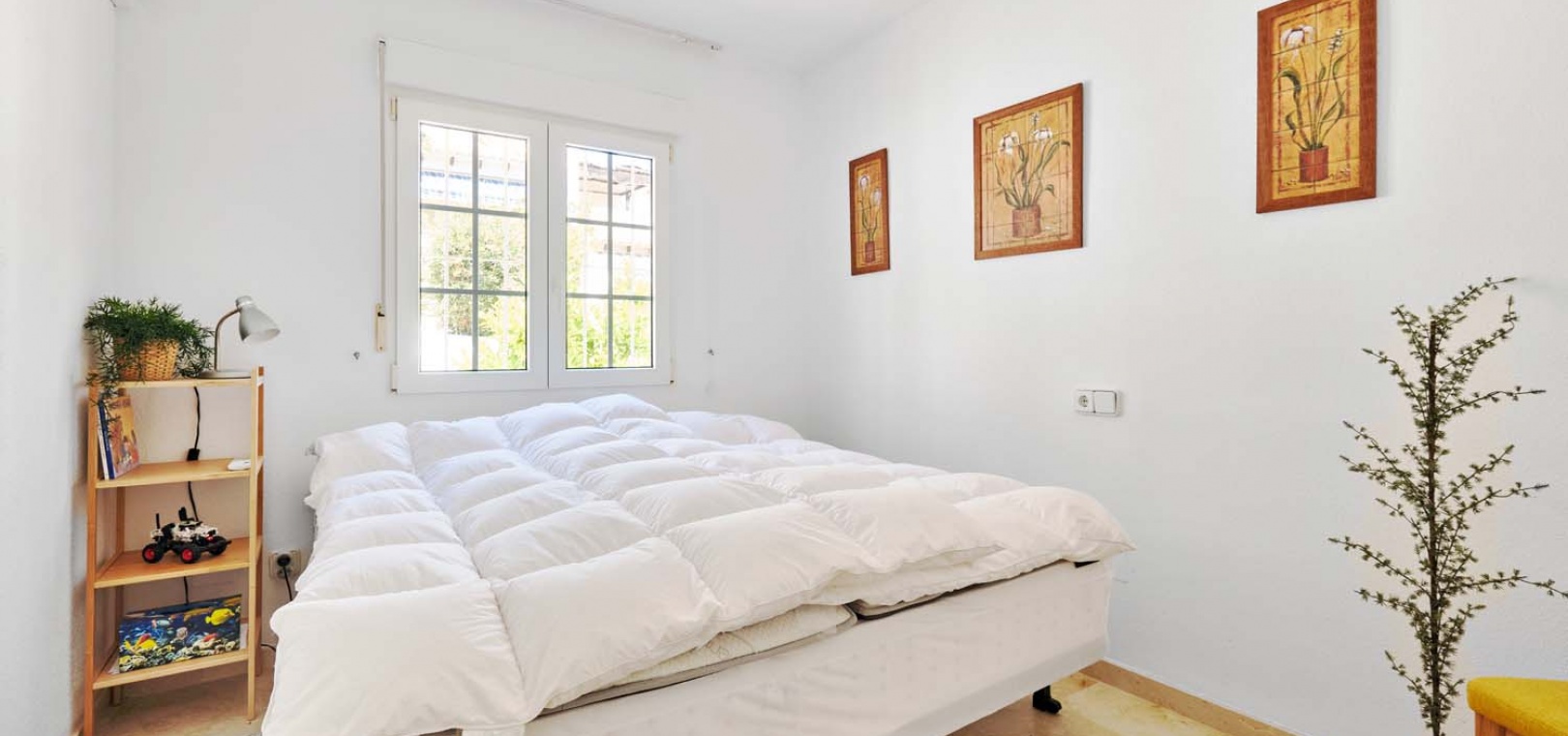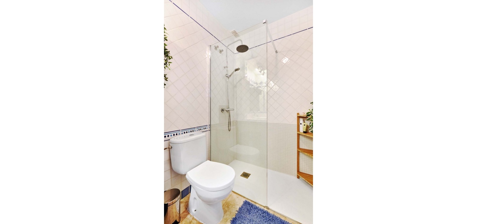 Jardin devant avec quelques marches menant à une terrasse semi-couverte prolongée avec un auvent. Salon et salle à manger lumineux et spacieux à aire ouverte avec foyer au gaz et climatisation, relié à une cuisine bien équipée avec bar à petit-déjeuner. Buanderie arrière avec machine à laver. Deux chambres doubles au rez-de-chaussée, climatisées et équipées de placards intégrés. L'une d'elles comprend une salle de bains privative et des portes-fenêtres donnant sur un jardin arrière privé avec coin salon. Troisième chambre au premier étage avec salle de bain attenante, climatisation et accès à une grande terrasse ensoleillée. Accès à la piscine et aux jardins communs.