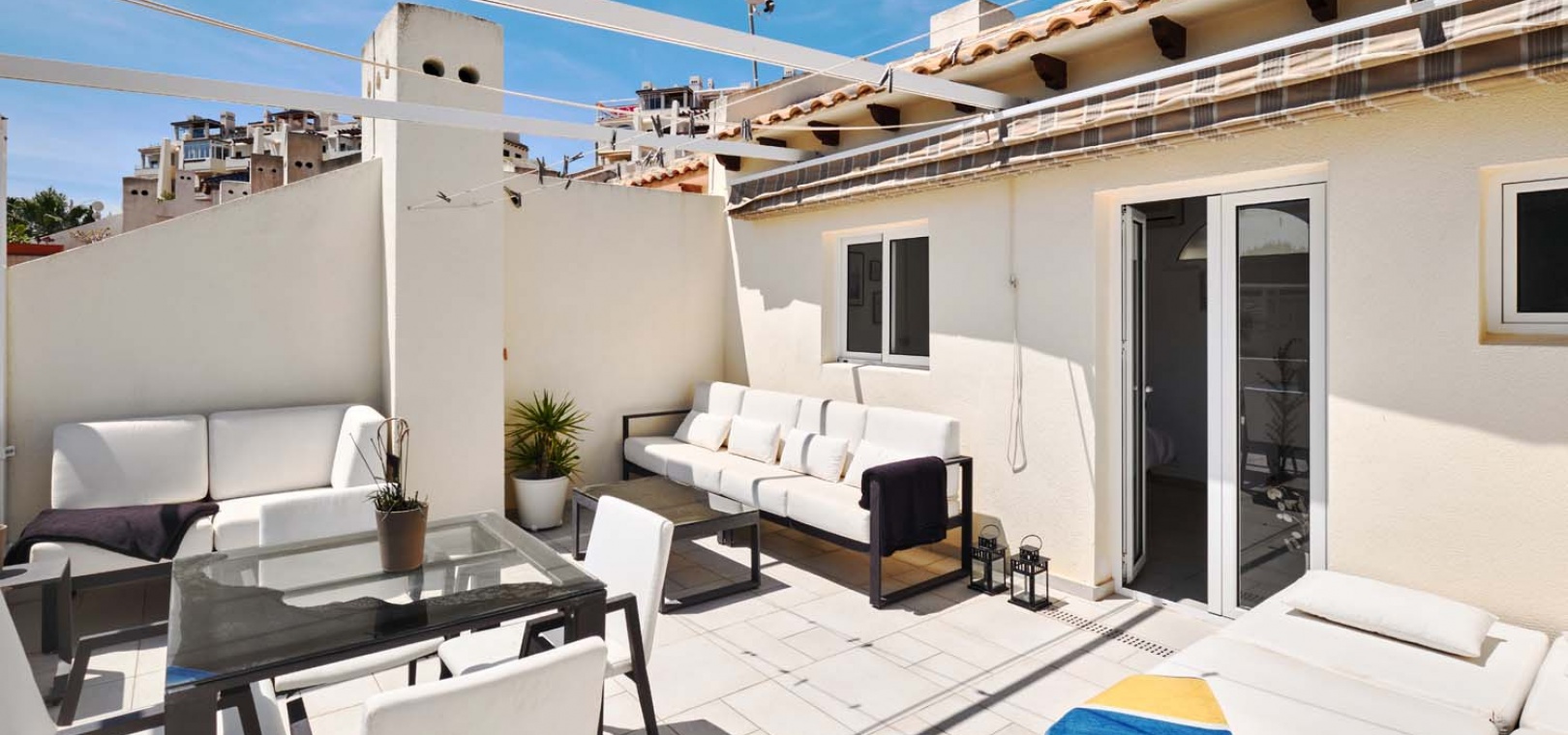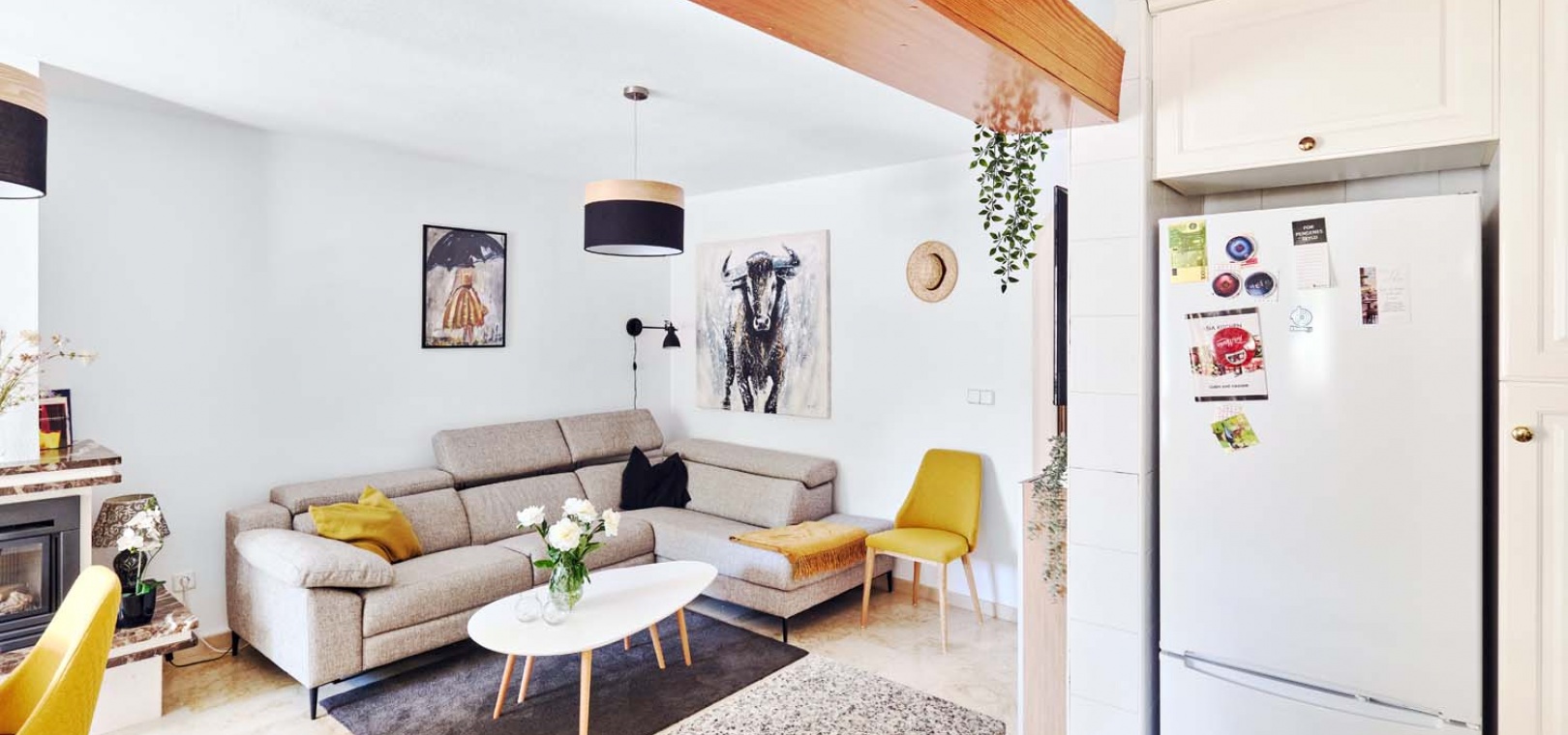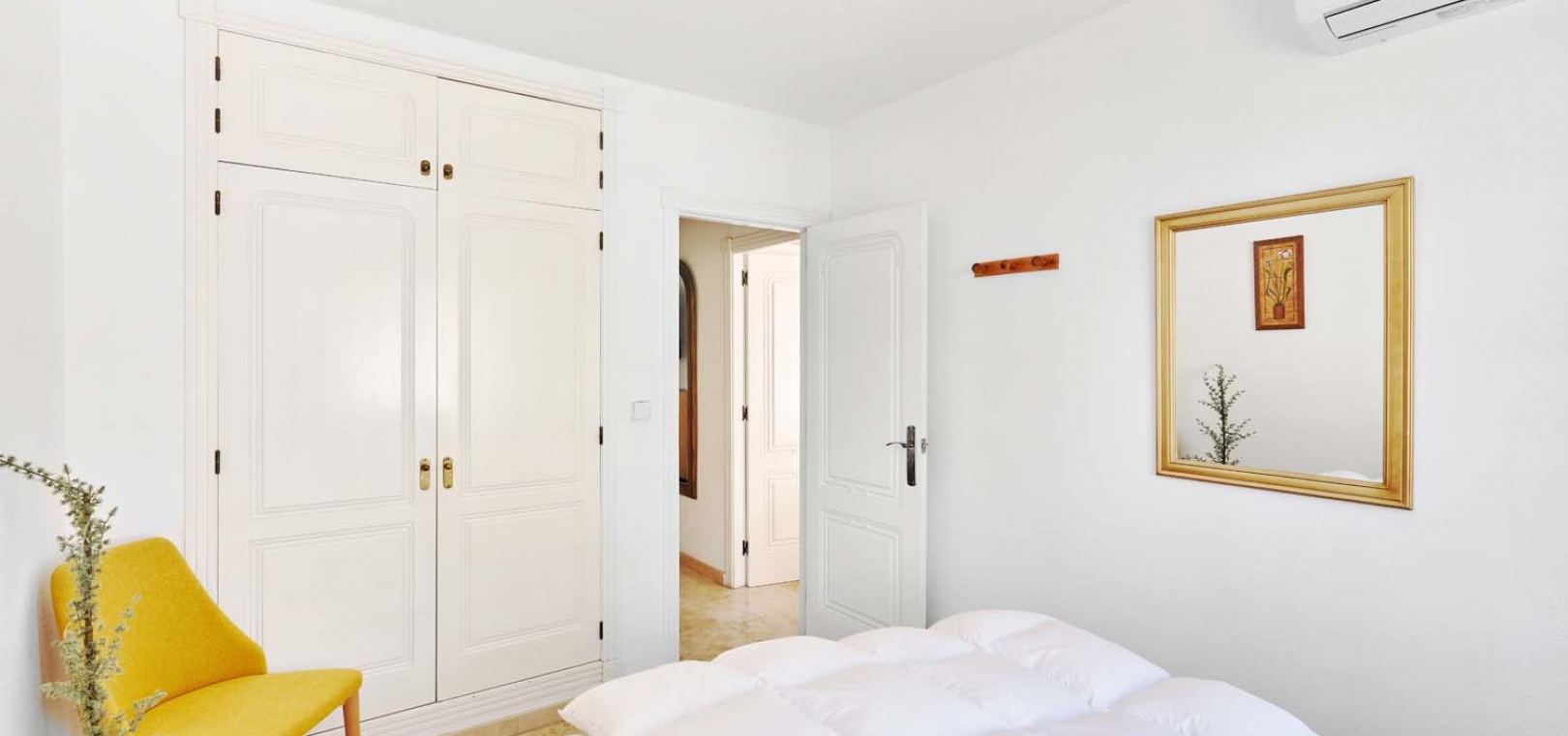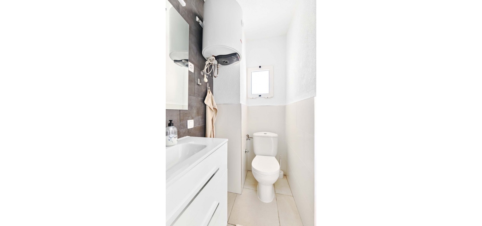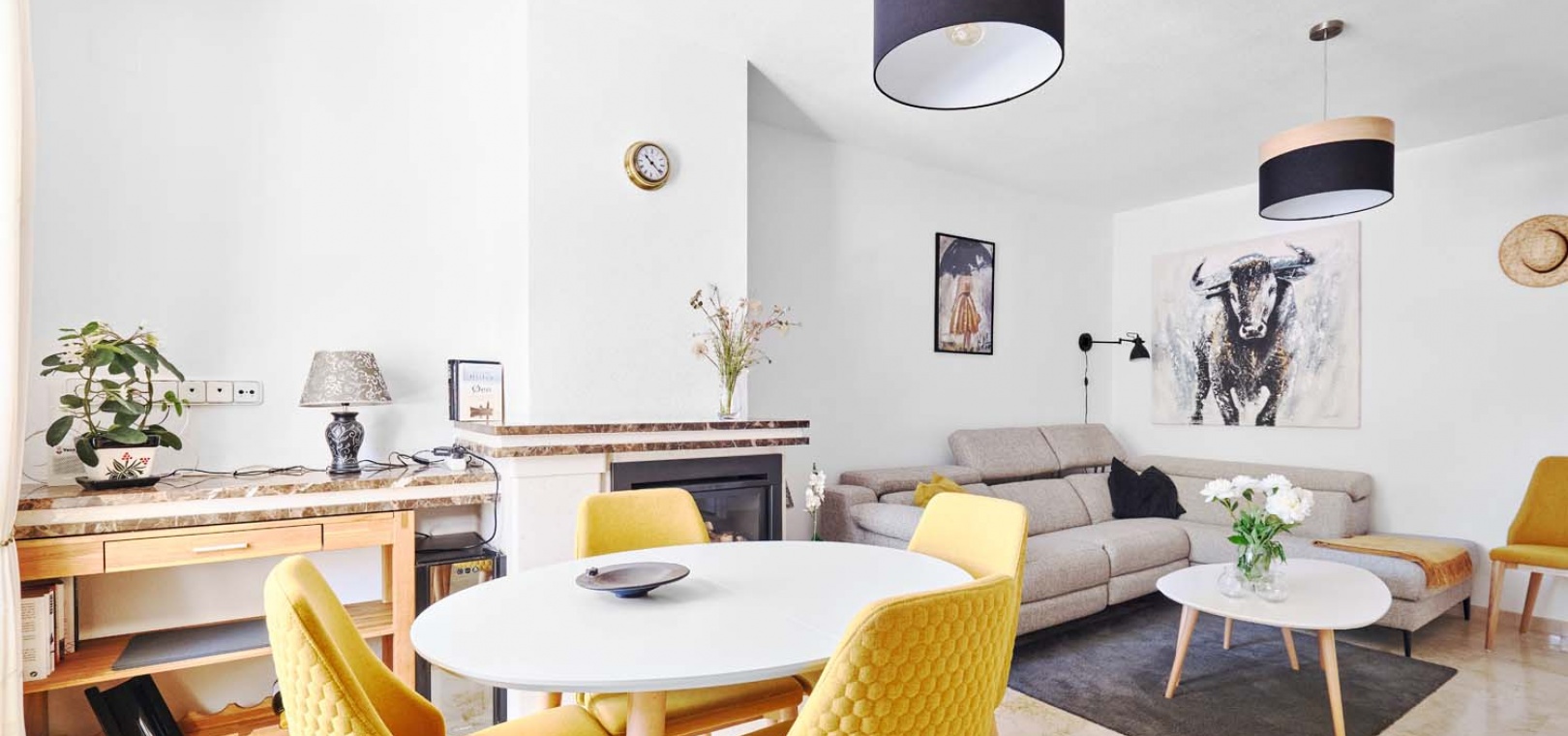 Jardin devant avec quelques marches menant à une terrasse semi-couverte prolongée avec un auvent. Salon et salle à manger lumineux et spacieux à aire ouverte avec foyer au gaz et climatisation, relié à une cuisine bien équipée avec bar à petit-déjeuner. Buanderie arrière avec machine à laver. Deux chambres doubles au rez-de-chaussée, climatisées et équipées de placards intégrés. L'une d'elles comprend une salle de bains privative et des portes-fenêtres donnant sur un jardin arrière privé avec coin salon. Troisième chambre au premier étage avec salle de bain attenante, climatisation et accès à une grande terrasse ensoleillée. Accès à la piscine et aux jardins communs.
