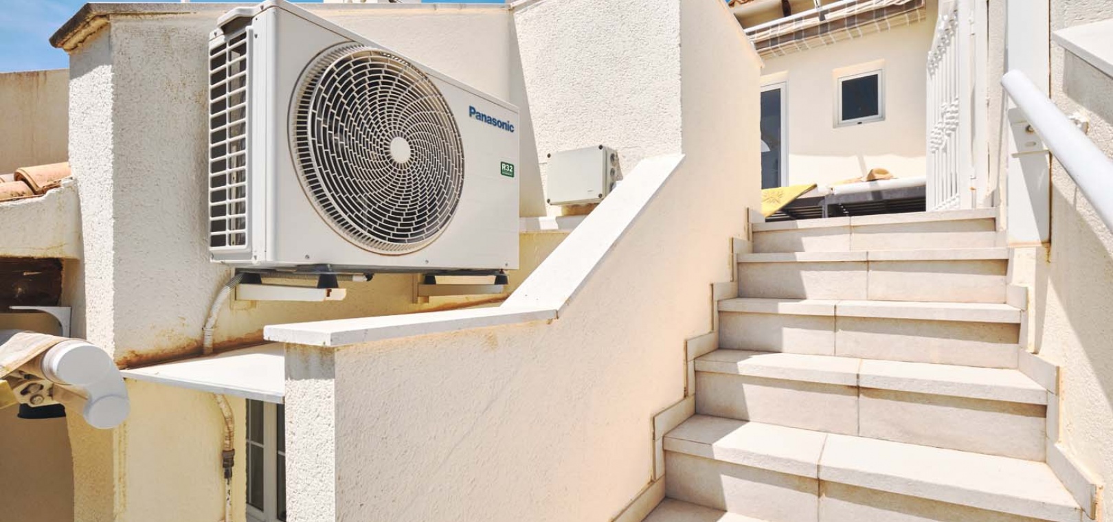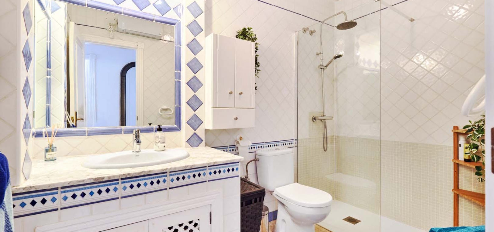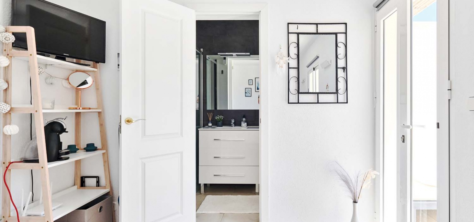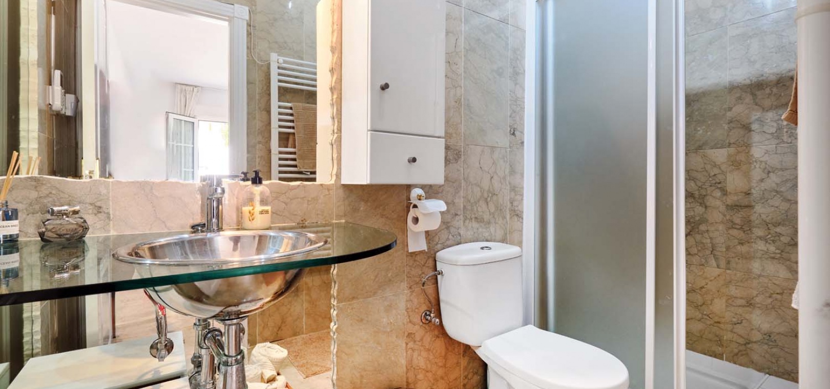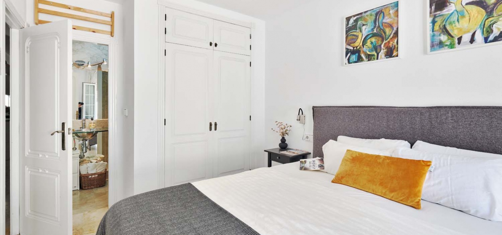 Jardin devant avec quelques marches menant à une terrasse semi-couverte prolongée avec un auvent. Salon et salle à manger lumineux et spacieux à aire ouverte avec foyer au gaz et climatisation, relié à une cuisine bien équipée avec bar à petit-déjeuner. Buanderie arrière avec machine à laver. Deux chambres doubles au rez-de-chaussée, climatisées et équipées de placards intégrés. L'une d'elles comprend une salle de bains privative et des portes-fenêtres donnant sur un jardin arrière privé avec coin salon. Troisième chambre au premier étage avec salle de bain attenante, climatisation et accès à une grande terrasse ensoleillée. Accès à la piscine et aux jardins communs.