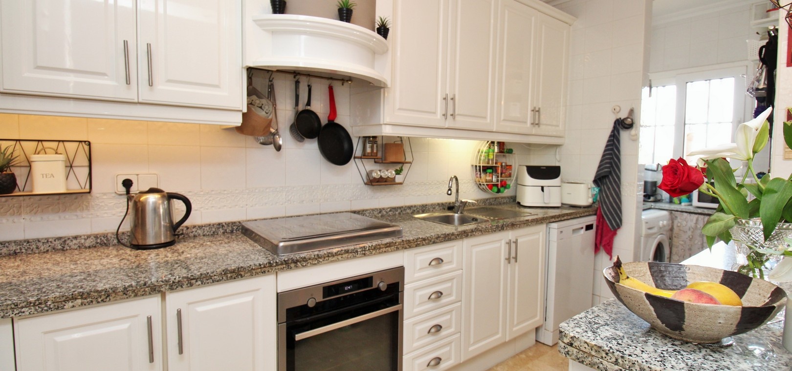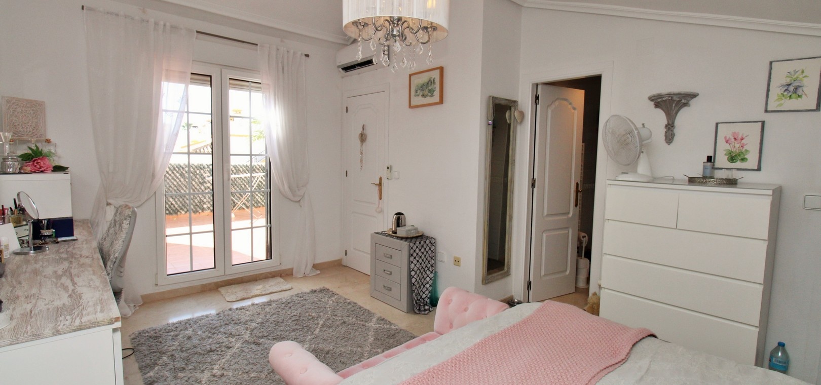Le rez-de-chaussée offre un spacieux et lumineux séjour-salle à manger avec cuisine ouverte et buanderie attenante. À l'arrière se trouvent deux chambres doubles avec placards intégrés et une salle de bains familiale. Une porte-fenêtre d'une chambre donne sur un jardin/terrasse carrelé à l'arrière, agrémenté de stores rétractables pour plus d'ombre et de confort. À l'avant, un autre jardin carrelé avec une terrasse couverte surélevée surplombe la piscine et comprend un espace de rangement pratique.