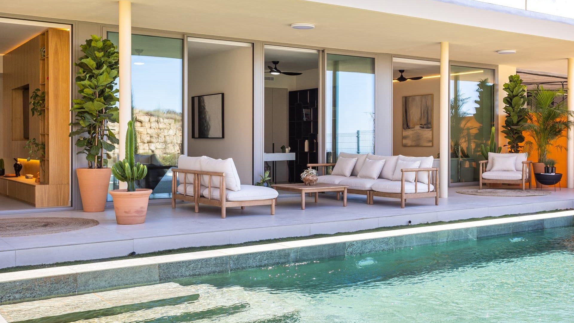 Les résidences offrent des agencements généreux de 130 m² avec 3 chambres, 2 salles de bains (dont une attenante), des toilettes pour invités, une buanderie et une cuisine ouverte reliée au salon. Les espaces extérieurs sont conçus pour profiter au maximum du climat méditerranéen :