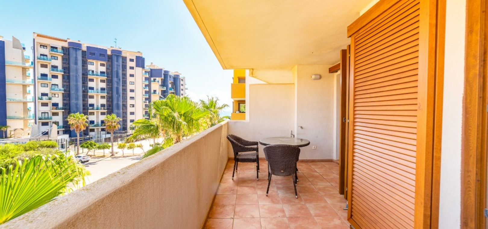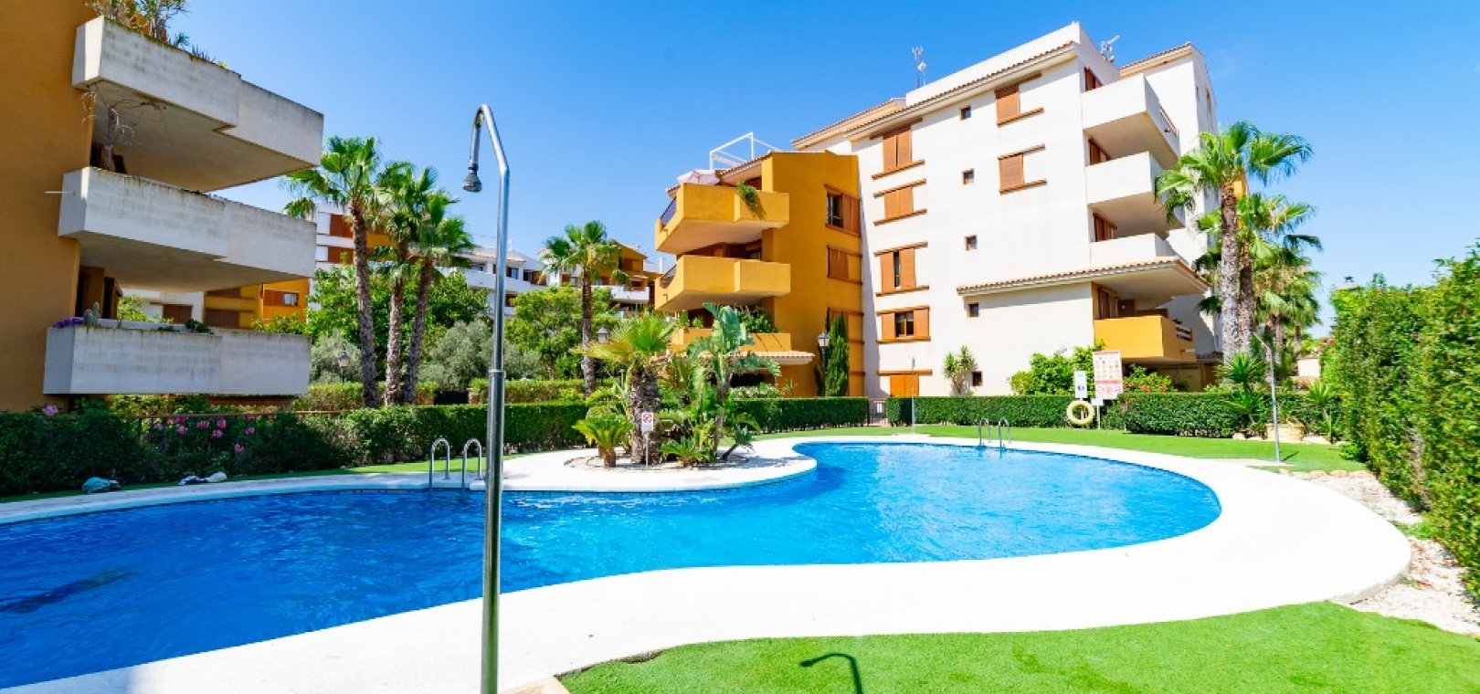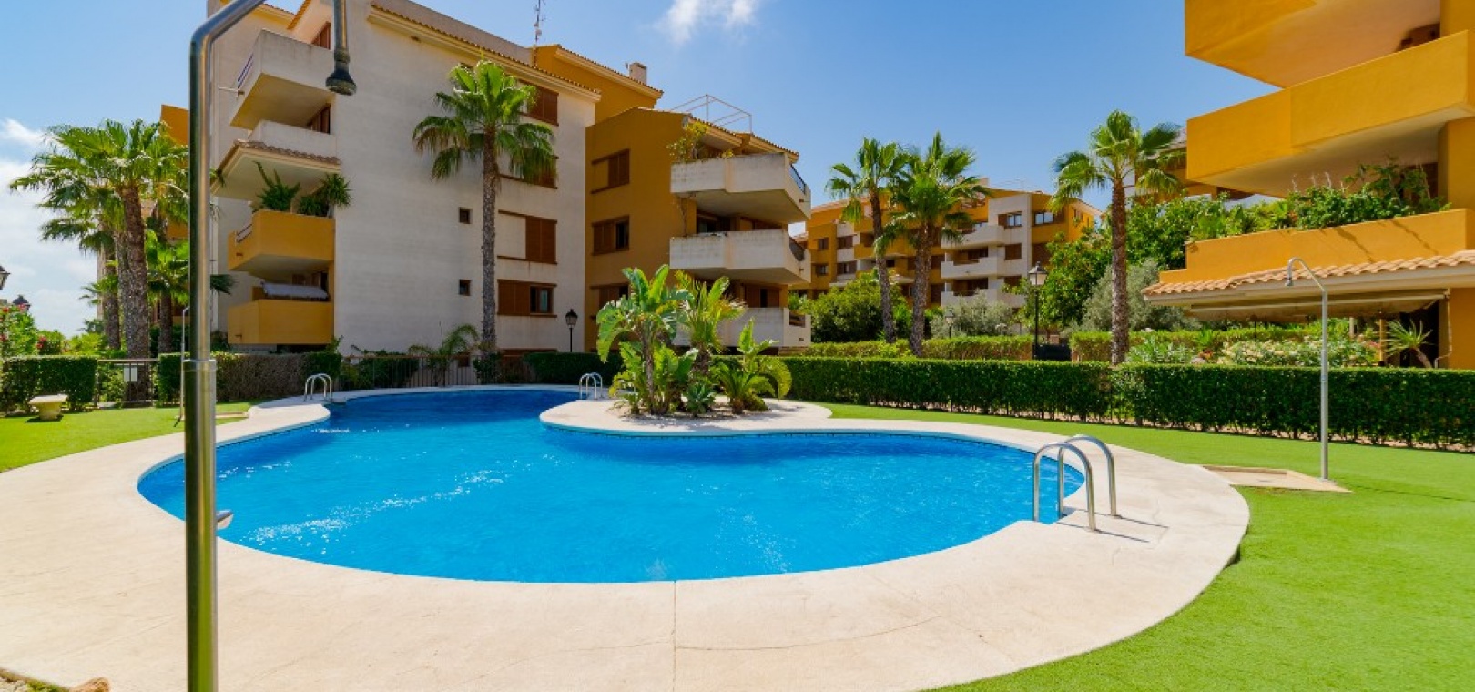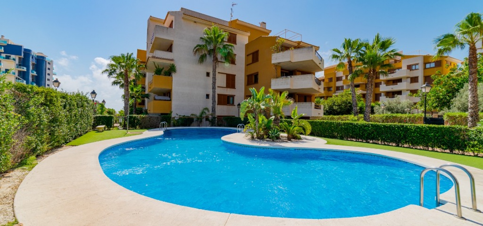Ce confortable appartement de deux chambres et une salle de bain est situé dans la résidence sécurisée de Parque Recoleta à Punta Prima, à quelques pas de la mer Méditerranée . Il dispose d'une cuisine ouverte et d'un salon-salle à manger donnant sur une terrasse avec vue sur la mer et les espaces communs .