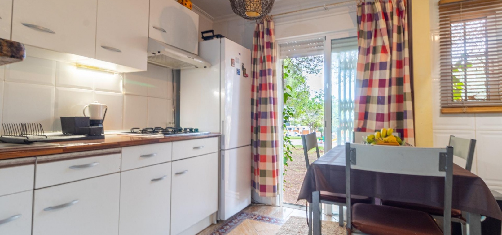 La cuisine américaine entièrement équipée comprend un coin repas pratique et offre un accès direct au parc arrière, un espace vert magnifiquement entretenu, idéal pour profiter du calme en plein air.