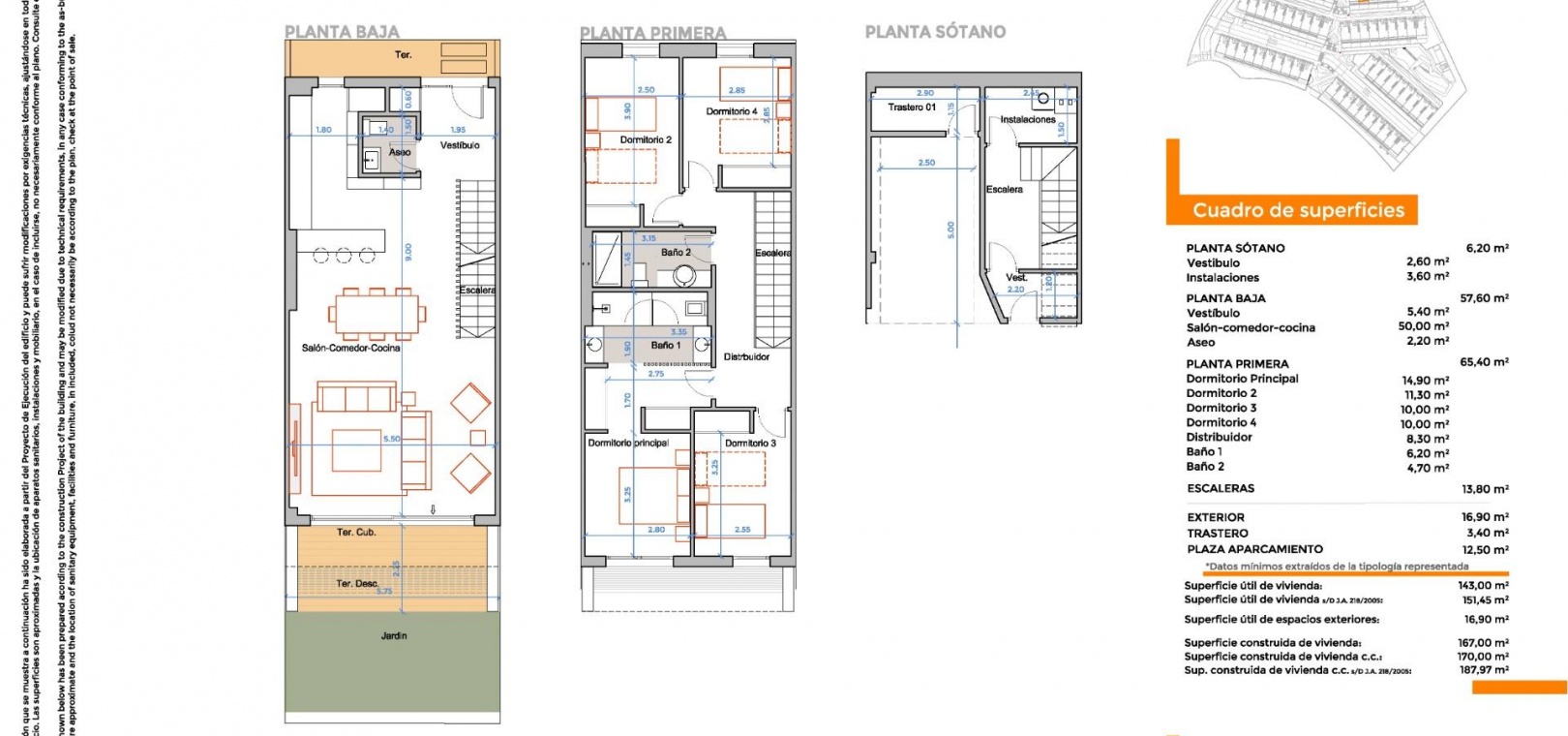 Le projet comprend 68 maisons de ville et maisons jumelées d'angle de haute qualité, avec 3 ou 4 chambres. Les propriétés ont été soigneusement conçues pour offrir des agencements équilibrés, des espaces de vie ouverts et de généreux espaces extérieurs tels que des terrasses, des jardins privés ou des solariums. Certaines maisons comprennent un sous-sol avec parking privé, débarras ou espace de vie, tandis que d'autres offrent un parking en surface pratique. Toutes les maisons bénéficient d'une orientation sud et beaucoup jouissent d'une vue imprenable sur la mer Méditerranée.