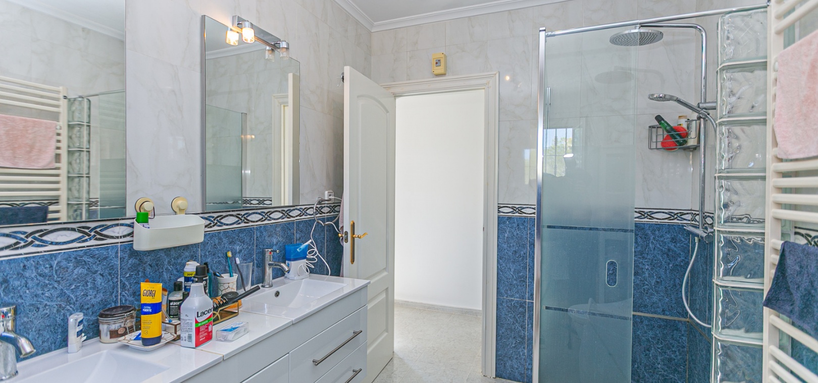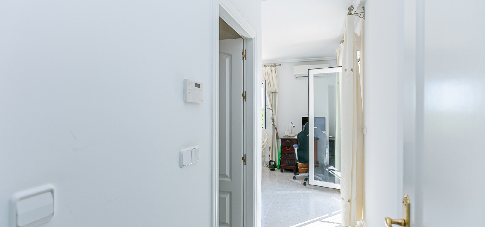 À l'étage, le premier étage comprend trois chambres doubles , toutes équipées de placards intégrés. La chambre principale dispose de deux placards, d'une salle de bains privative avec douche et baignoire jacuzzi, et d'un accès direct à une terrasse commune offrant une vue imprenable sur le golf. Une deuxième chambre double donne également sur cette terrasse, tandis que la troisième bénéficie d'une terrasse privée. Une salle de douche familiale dessert les autres chambres.