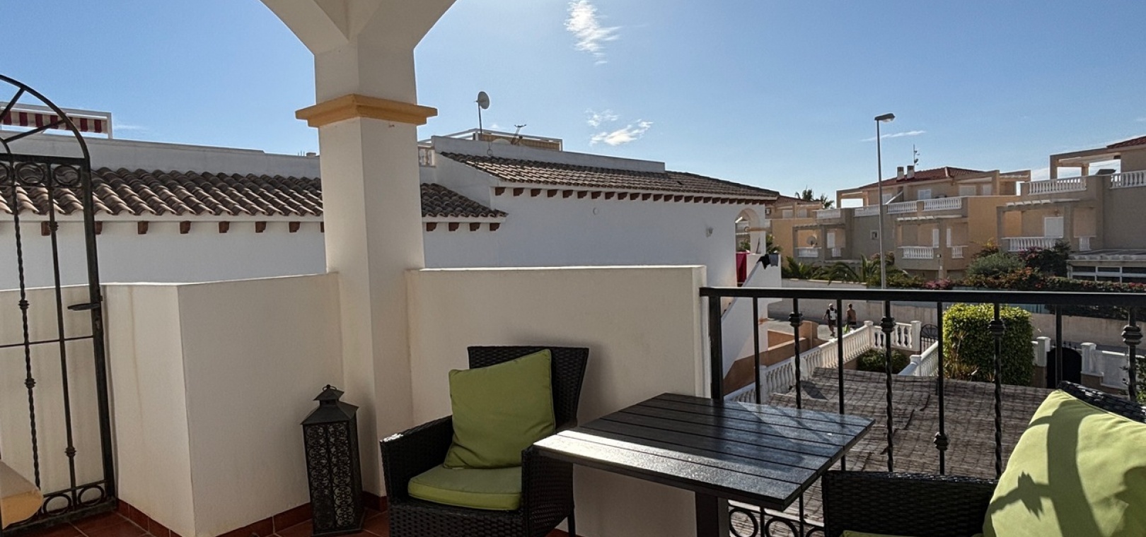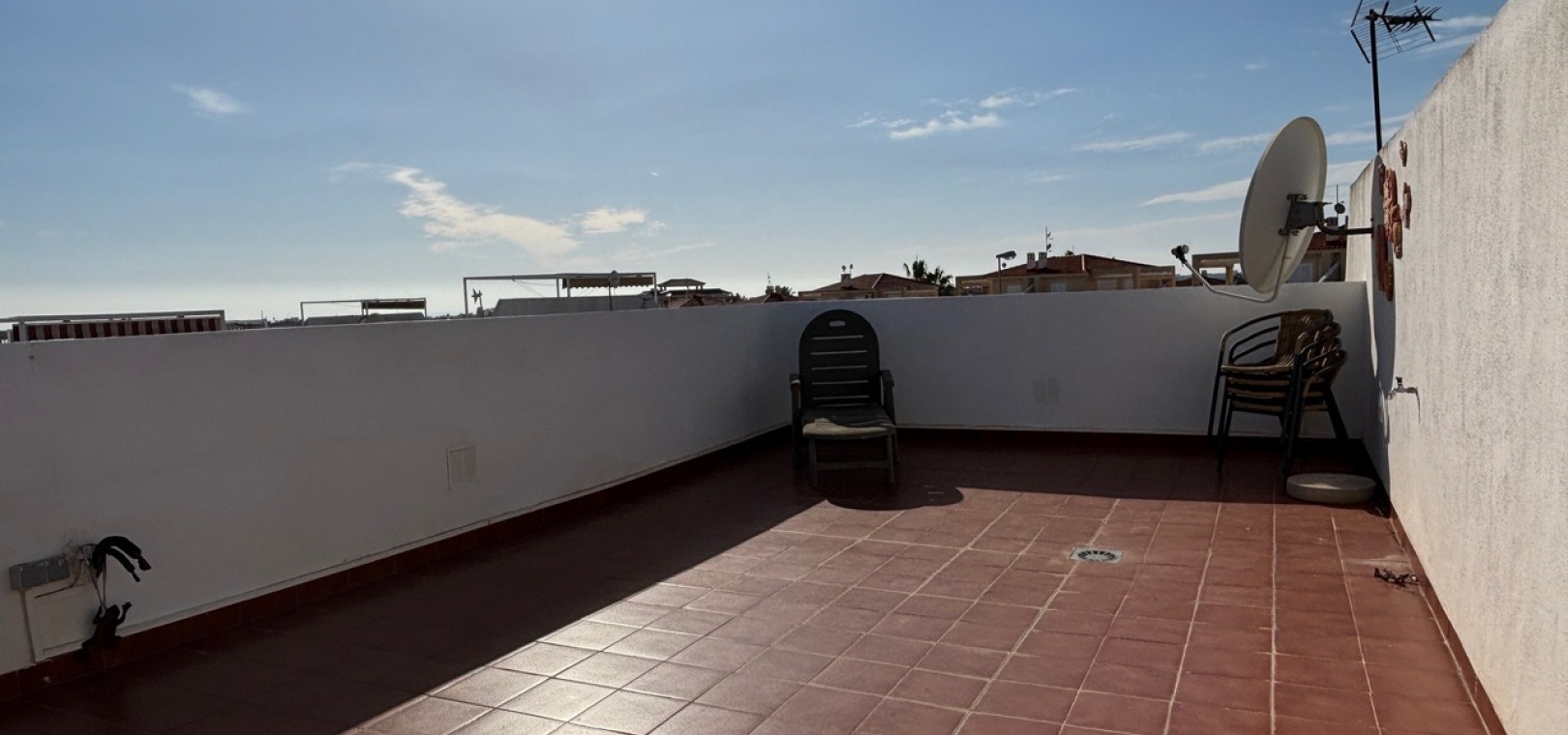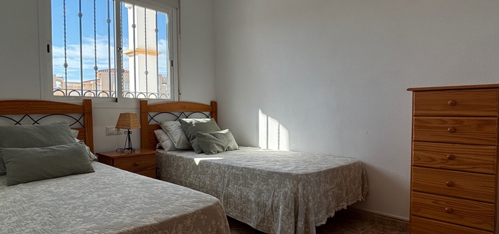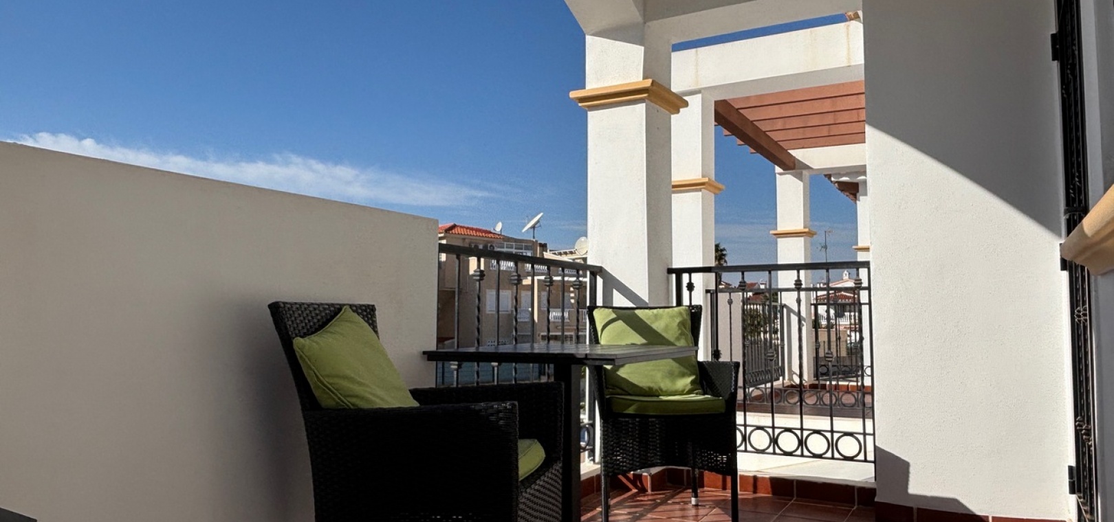 Ce bel appartement de 2 chambres et 2 salles de bains, situé au dernier étage, bénéficie d'un emplacement idéal à La Cinuelica R15, Punta Prima, Costa Blanca . Orienté sud-ouest, il est ensoleillé toute la journée et dispose d'un grand solarium privatif sur le toit offrant une vue sur la mer.