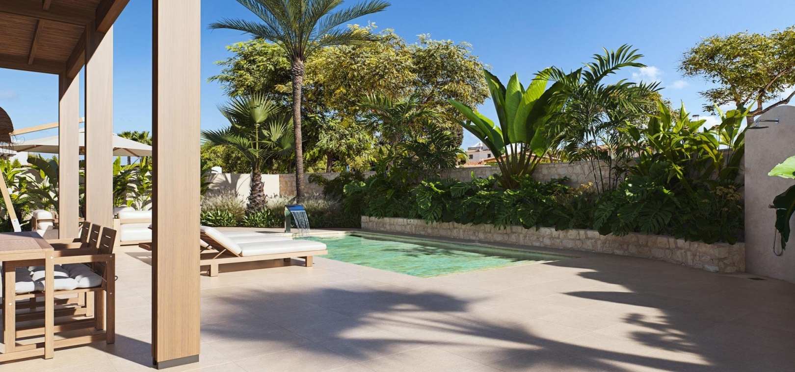 Piscine privée (8x3 m) entourée de jardins paysagers avec irrigation et éclairage