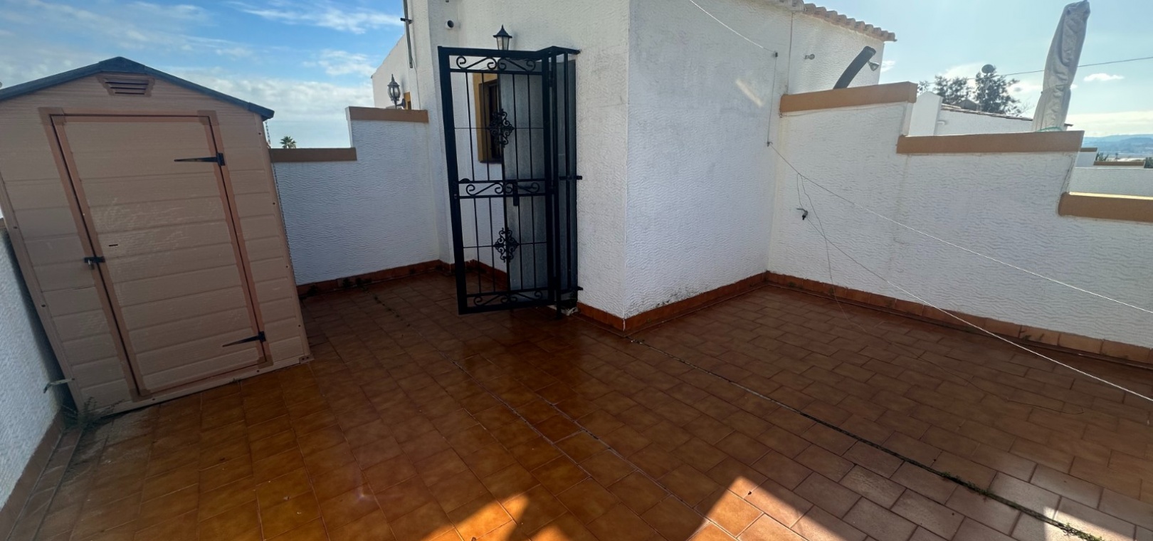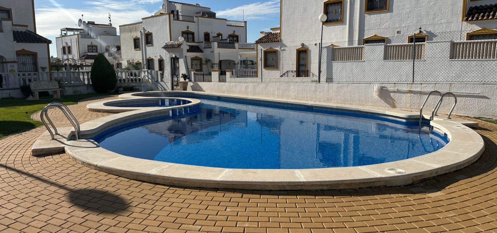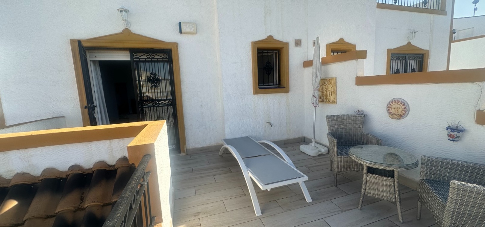 Maison de ville quadrangulaire orientée ouest, située dans l'urbanisation Entre Naranjos, à Orihuela, à proximité du golf de Vistabella. La maison comprend un grand jardin avec rangements, une terrasse vitrée, un séjour/salle à manger ouvert avec poêle à bois et cuisine séparée, une chambre double (actuellement utilisée comme salle à manger) et une salle de bains avec douche au rez-de-chaussée. À l'étage, on trouve deux autres chambres doubles, une salle de bains familiale et une terrasse attenante à la chambre principale. Un escalier mène à un solarium baigné de soleil offrant une belle vue. La piscine commune est à seulement 50 mètres.