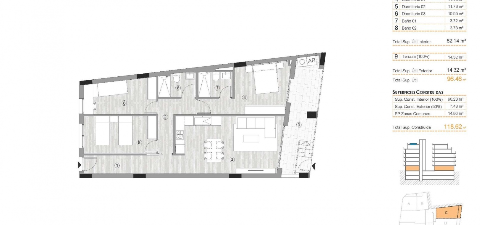 Le complexe propose une sélection d'appartements de 2 et 3 chambres, y compris des penthouses, certains avec solariums privés. Chaque maison est conçue dans un style contemporain, avec des plans d'étage ouverts, de grandes terrasses et des cuisines intégrées de style américain. Les salles de bains sont entièrement équipées avec des meubles, des parois de douche et le chauffage au sol. Les cuisines comprennent des appareils électroménagers et chaque appartement est pré-équipé pour la climatisation centralisée. Un parking souterrain et des débarras sont disponibles en option.