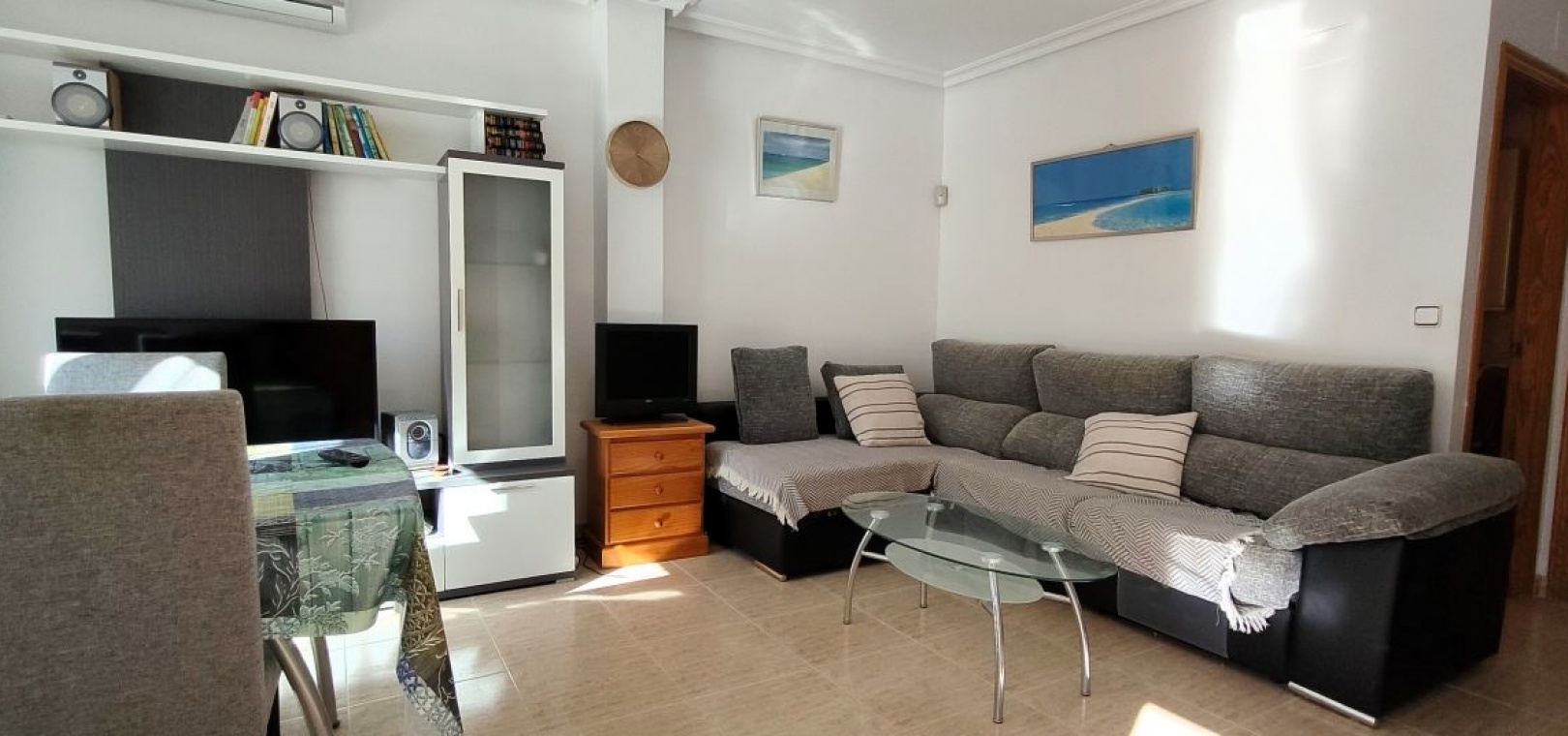 Une opportunité exceptionnelle d'acquérir une spacieuse maison de ville de 3 chambres et 2 salles de bains dans le complexe très prisé de Vistamar, à seulement 200 mètres de la promenade et de la plage de Cabo Roig. Les maisons de cette taille dans ce quartier privilégié sont toujours très recherchées. La propriété offre une excellente intimité, sans voisins au-dessus ni en dessous, lui conférant l'impression d'une maison individuelle. Située dans une résidence sécurisée, elle est accessible par un jardin ensoleillé exposé plein sud. Au rez-de-chaussée, vous trouverez un salon lumineux, une cuisine séparée avec accès à une terrasse/buanderie, et une salle d'eau. Le premier étage comprend deux chambres doubles avec placards intégrés, un petit balcon et une salle de bains familiale. Le dernier étage offre une troisième chambre avec placards intégrés et un accès direct à une terrasse privative ensoleillée sur le toit. La maison est équipée d'une climatisation réversible neuve dans le salon et les trois chambres. Quelques travaux de rafraîchissement permettraient de la transformer facilement en une charmante et élégante maison de plage. Le complexe dispose d'une belle piscine commune et d'espaces verts aménagés, idéaux pour profiter du climat méditerranéen. Avec bars, restaurants, boutiques, supermarchés, centre médical, transports en commun et vie nocturne accessibles à pied, cet emplacement est idéal et ne nécessite pas de voiture. Un excellent choix comme résidence secondaire, résidence principale ou investissement locatif avec un fort potentiel, dans l'un des quartiers balnéaires les plus prisés de Cabo Roig.