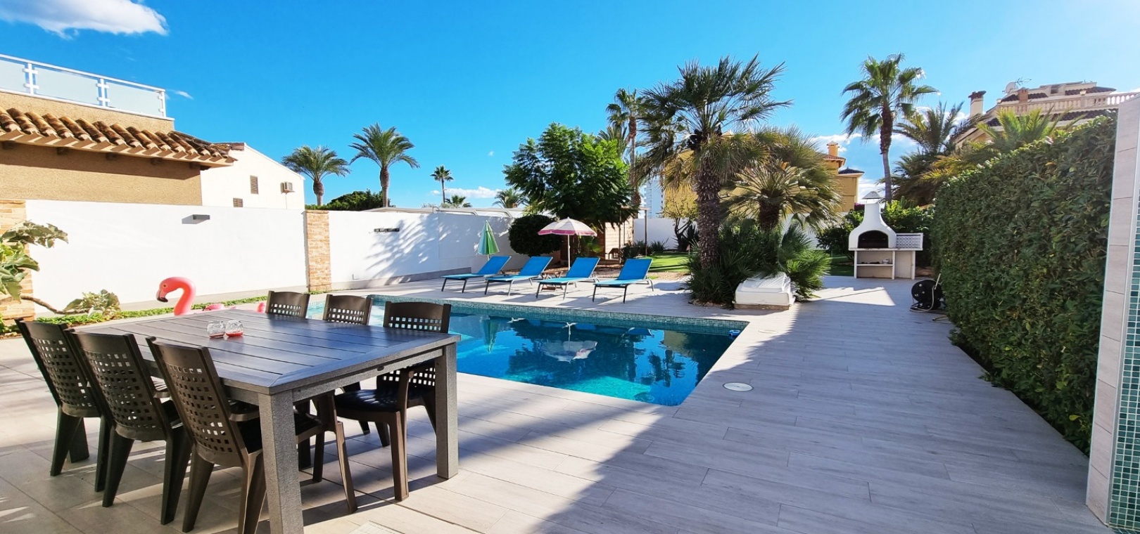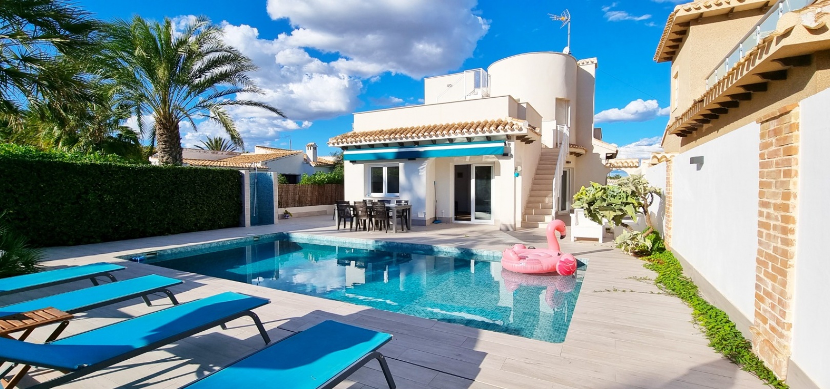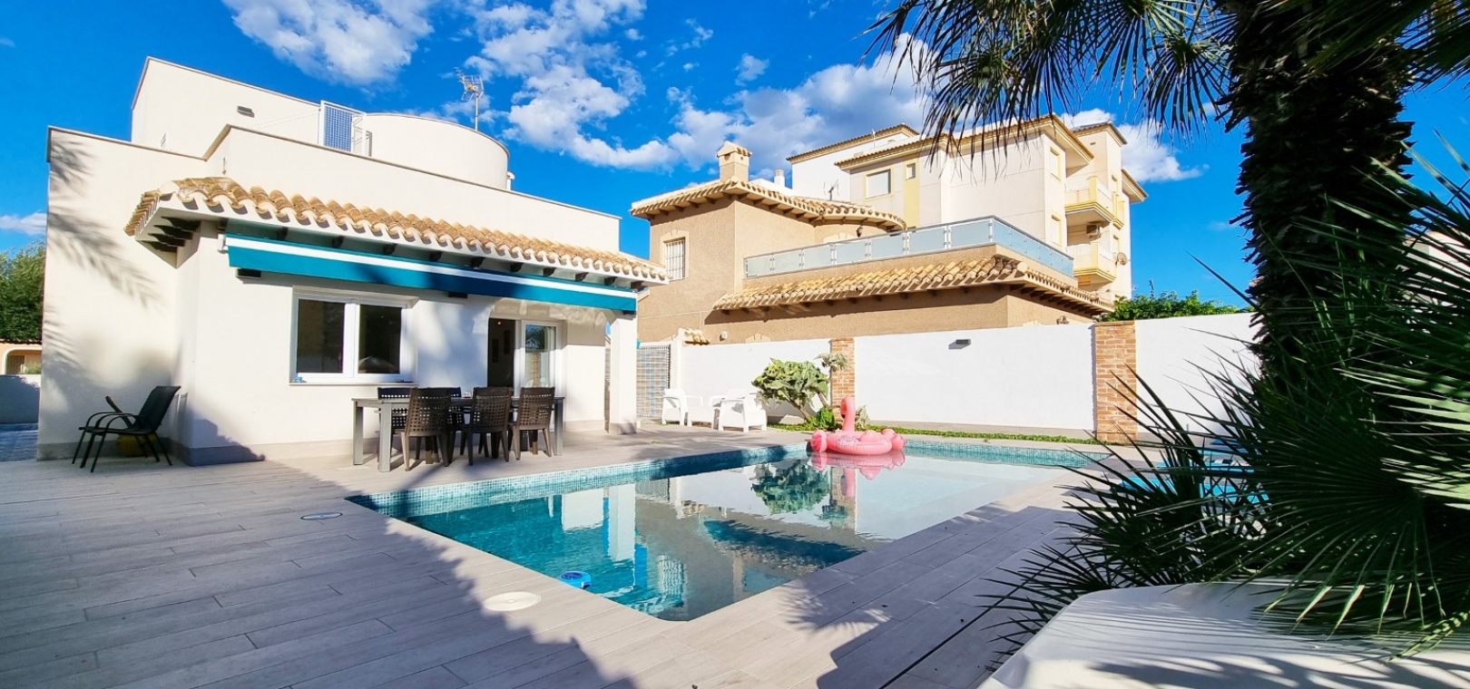 Une villa individuelle récemment rénovée de 4 chambres et 3 salles de bains avec piscine privée située à seulement 100 m de la plage de Playa Flamenca, Costa Blanca Sud.