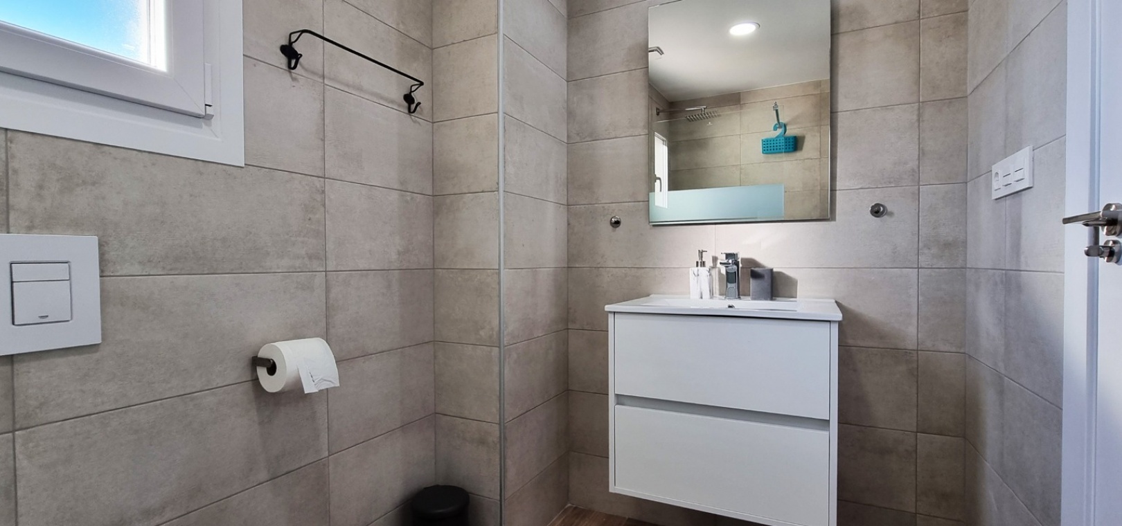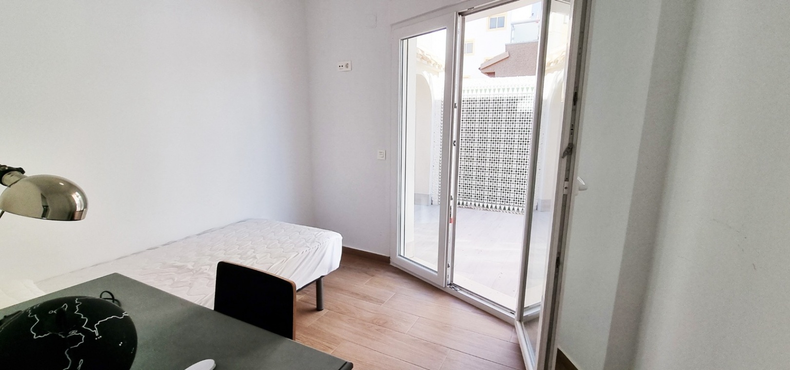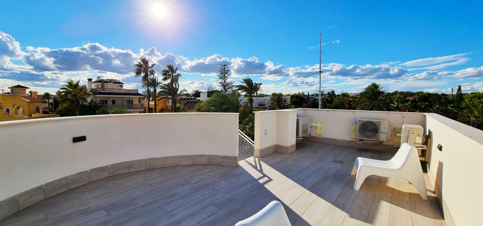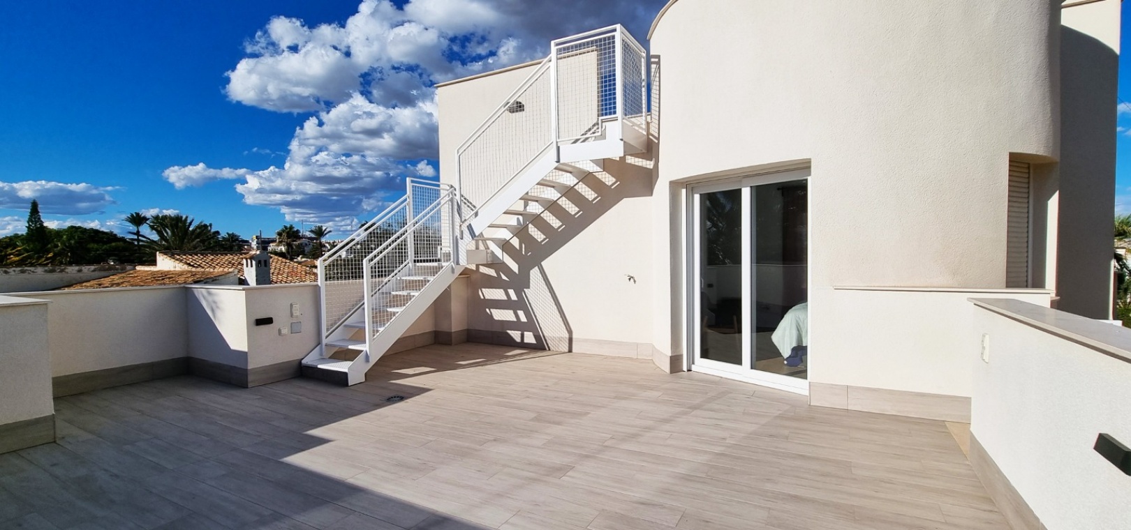 Au 1er étage se trouve la grande chambre double principale, la salle de douche, le grand balcon et un solarium privé sur le toit.