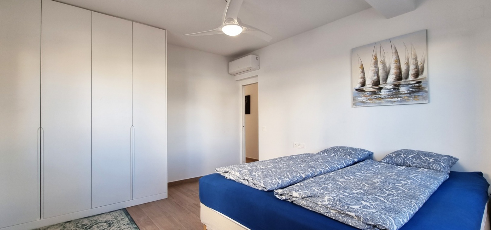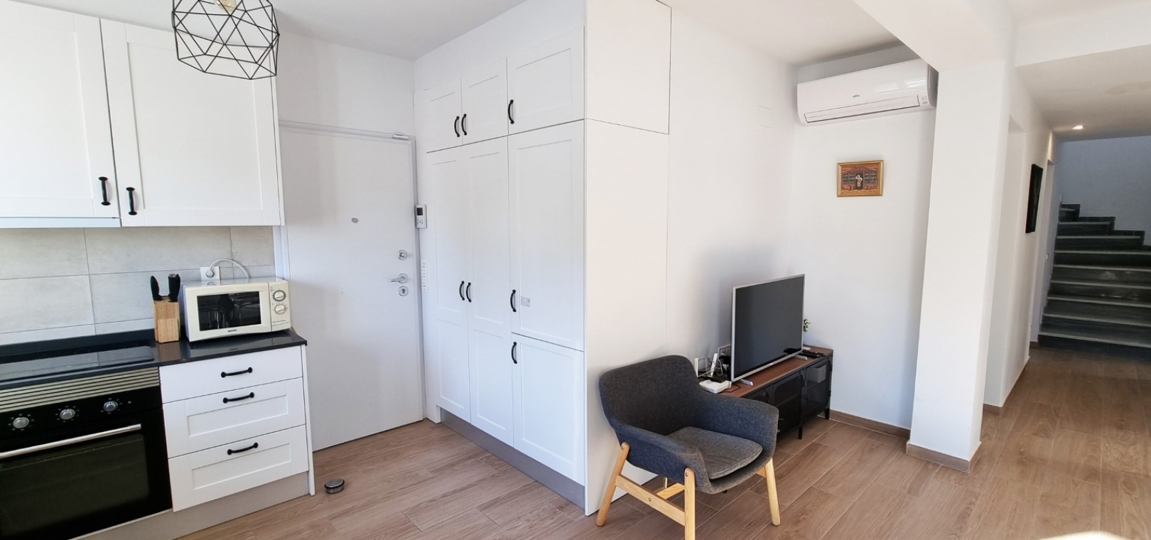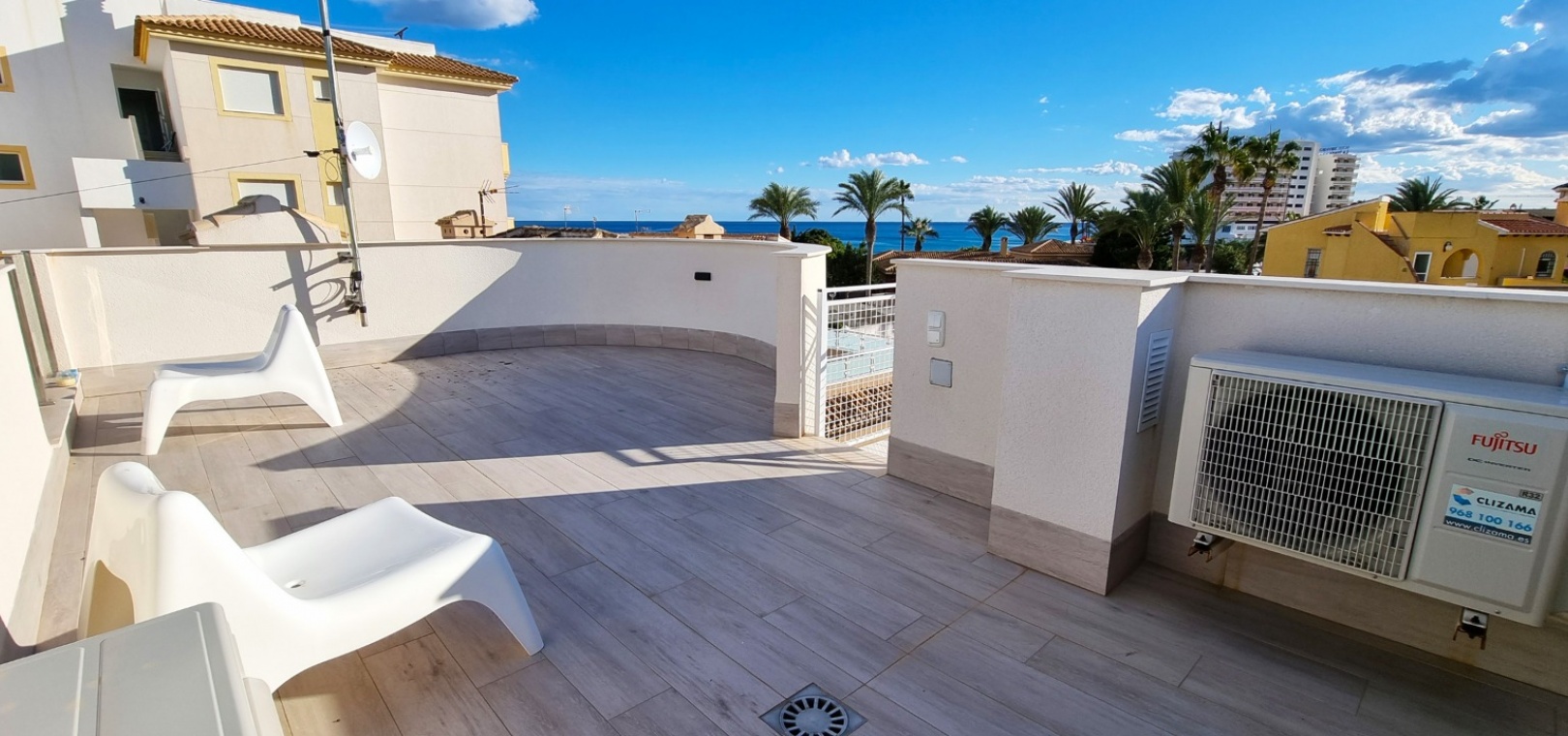 Au premier étage il y a un salon/salle à manger avec climatisation chaude et froide, une cuisine ouverte, 3 chambres et 2 salles de douche.