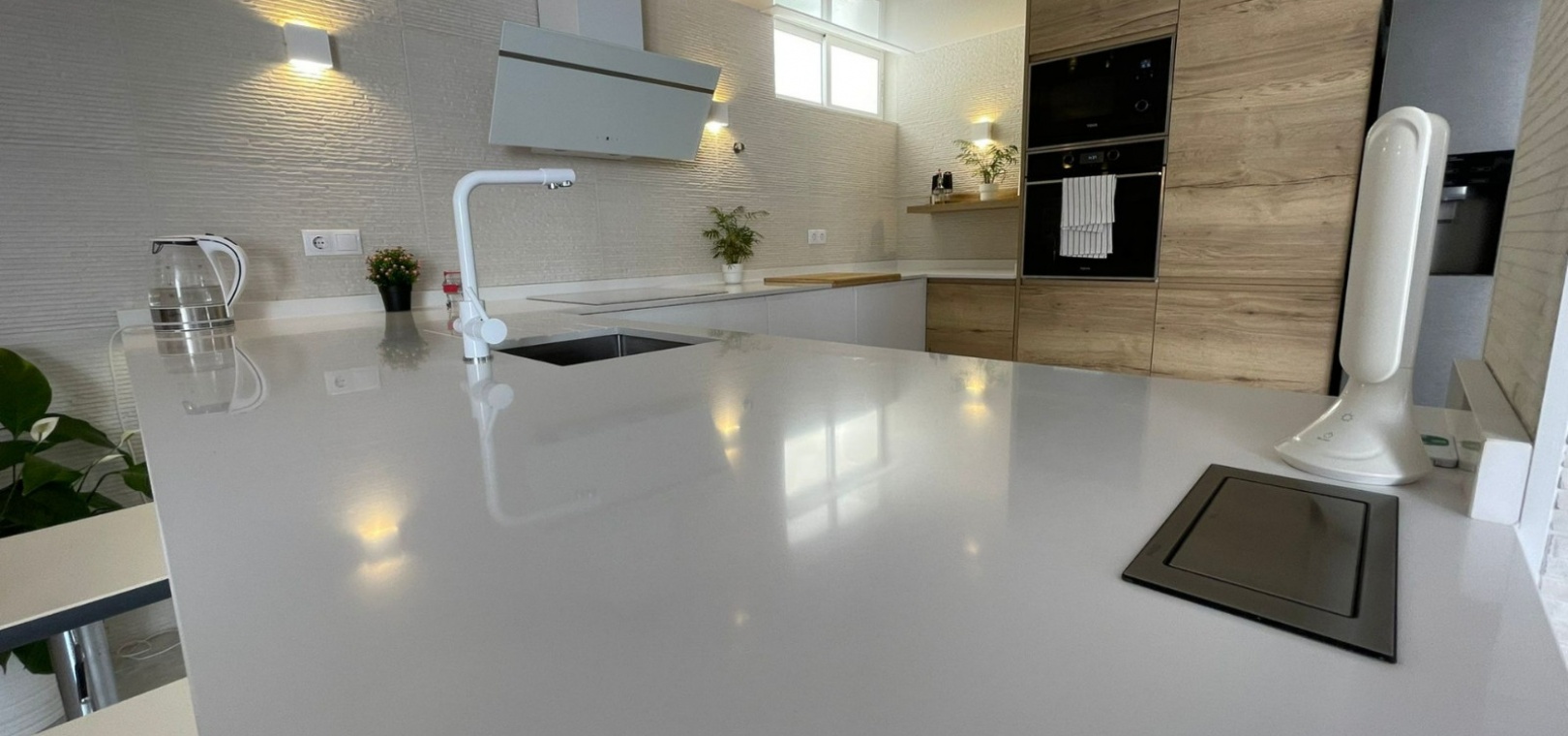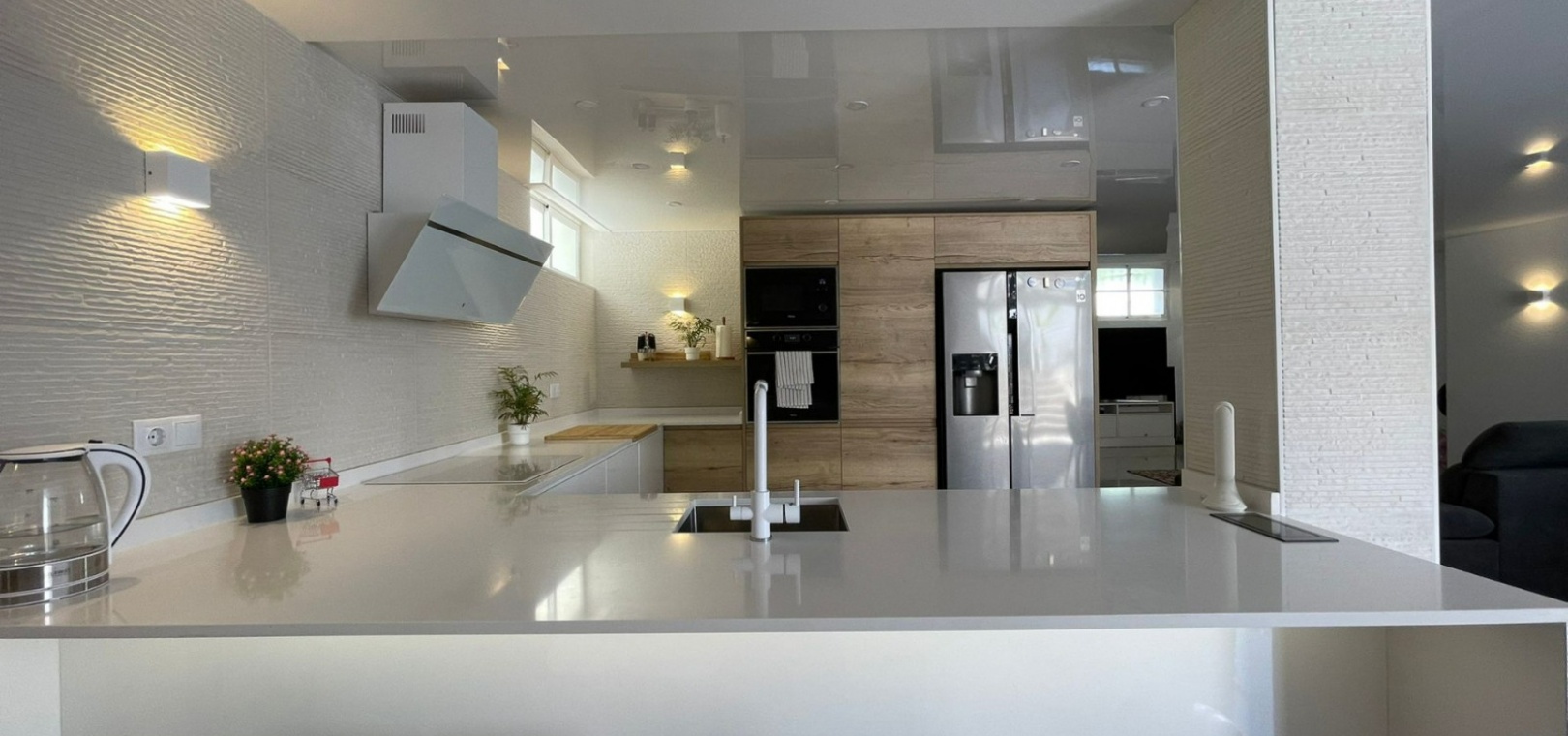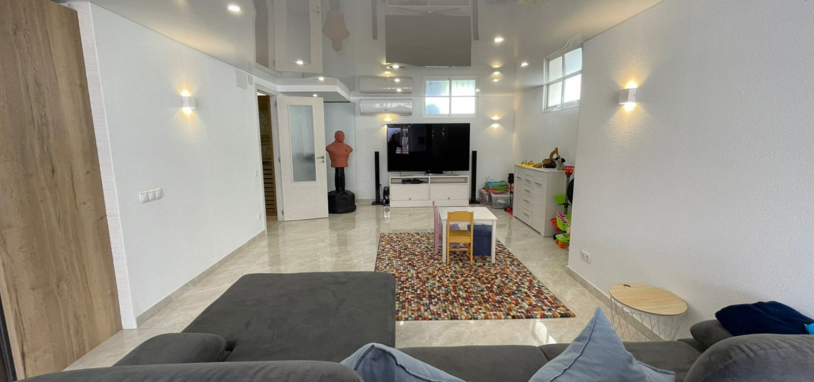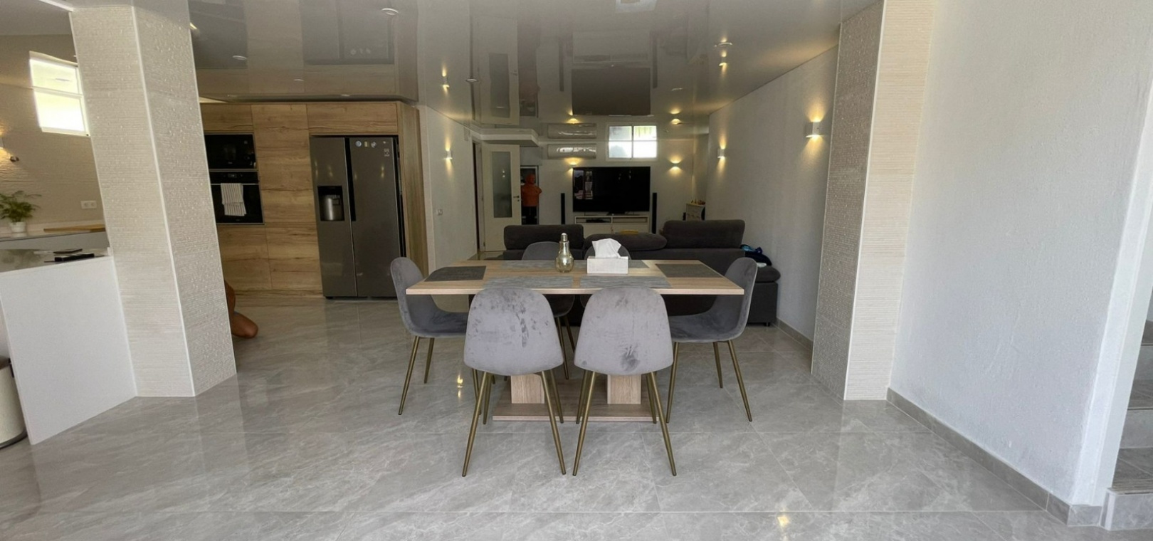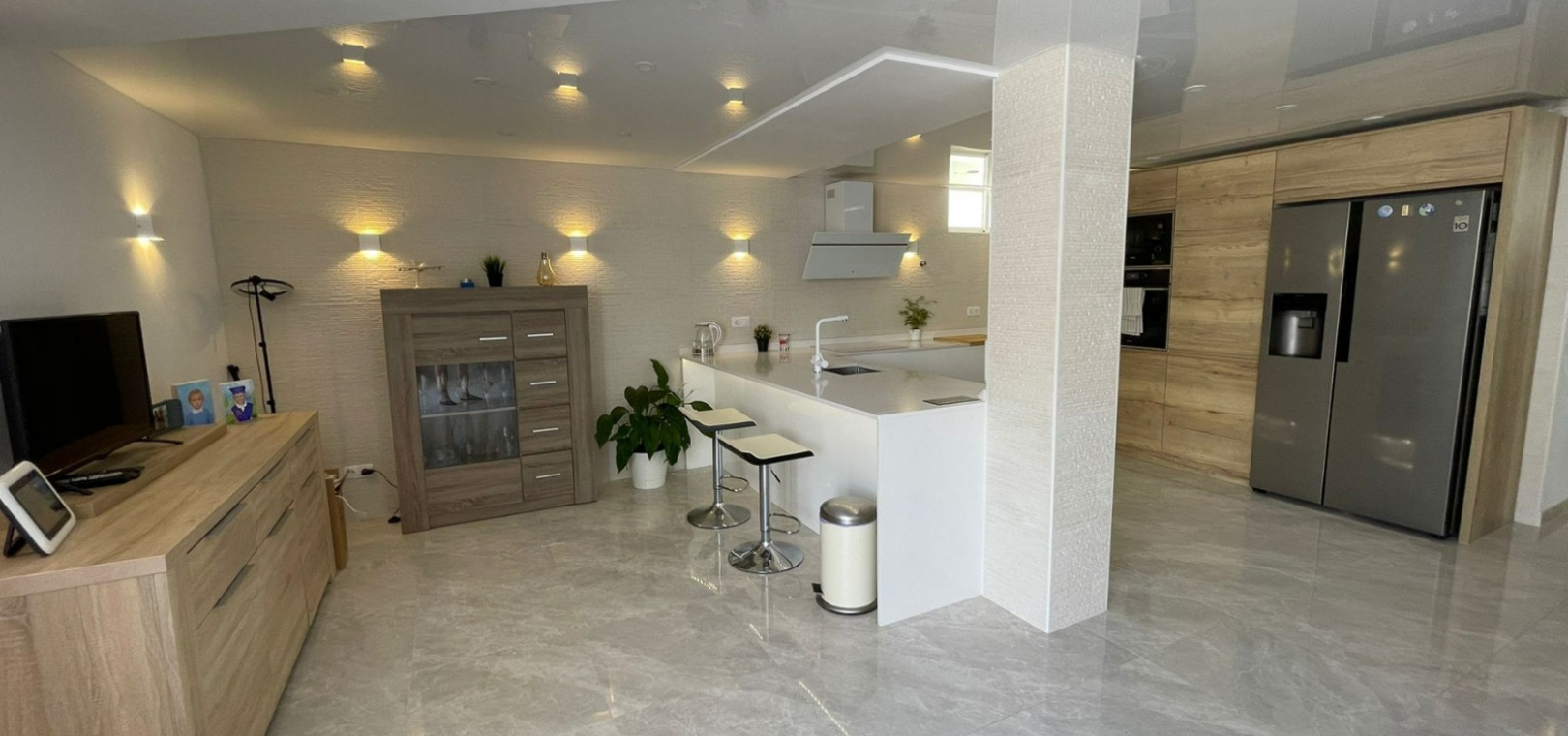 Salon/salle à manger avec climatisation chaude et froide et cheminée, cuisine séparée, 2 chambres doubles avec placards, 1 chambre simple et 2 salles de douche.