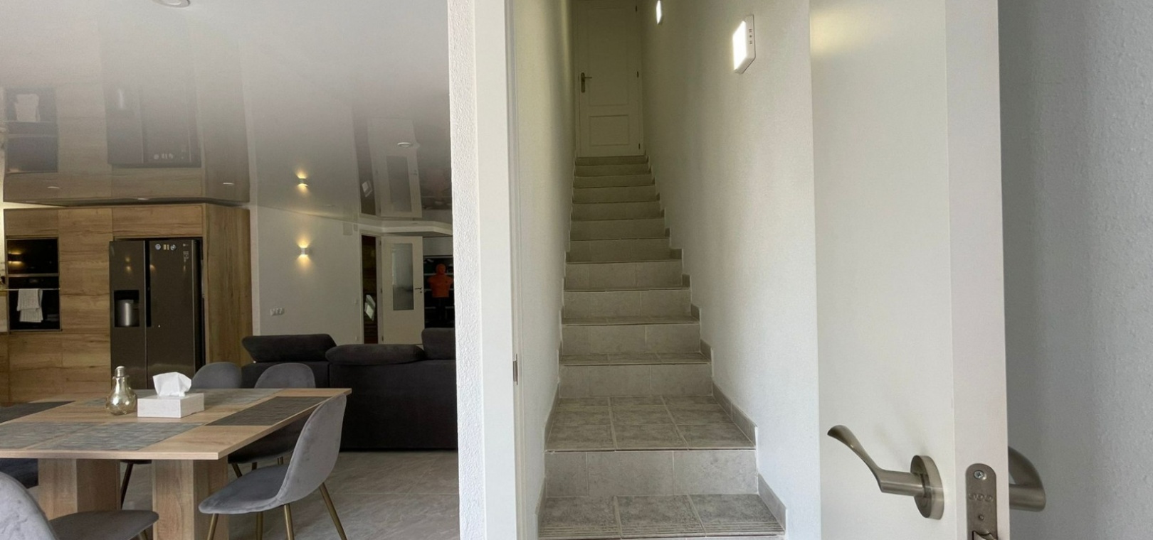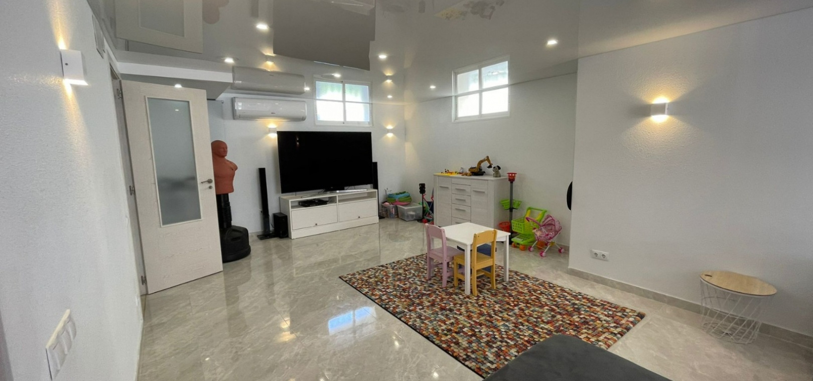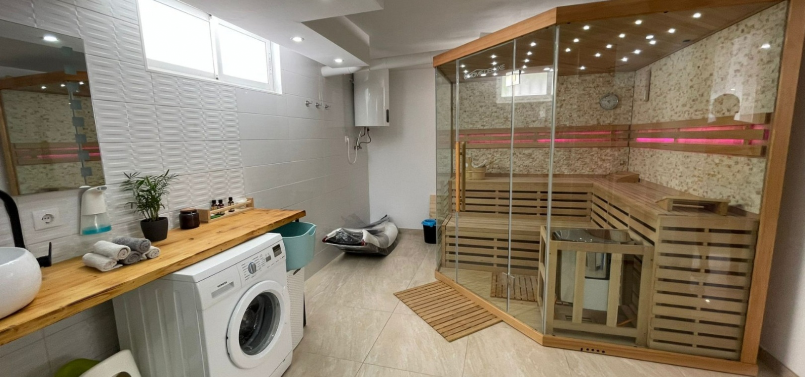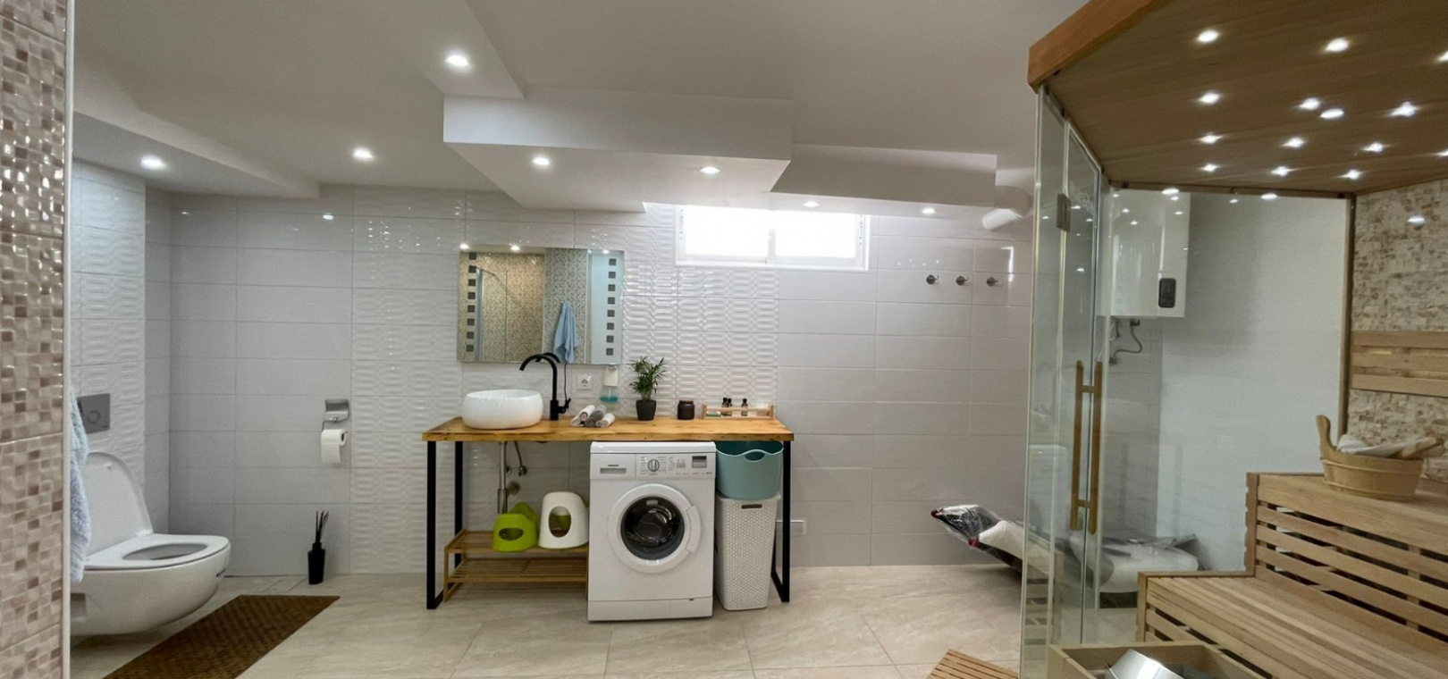 Il y a un grand sous-sol entièrement rénové avec un grand salon/salle à manger, une cuisine ouverte entièrement équipée, un débarras, une grande salle de douche avec sauna.