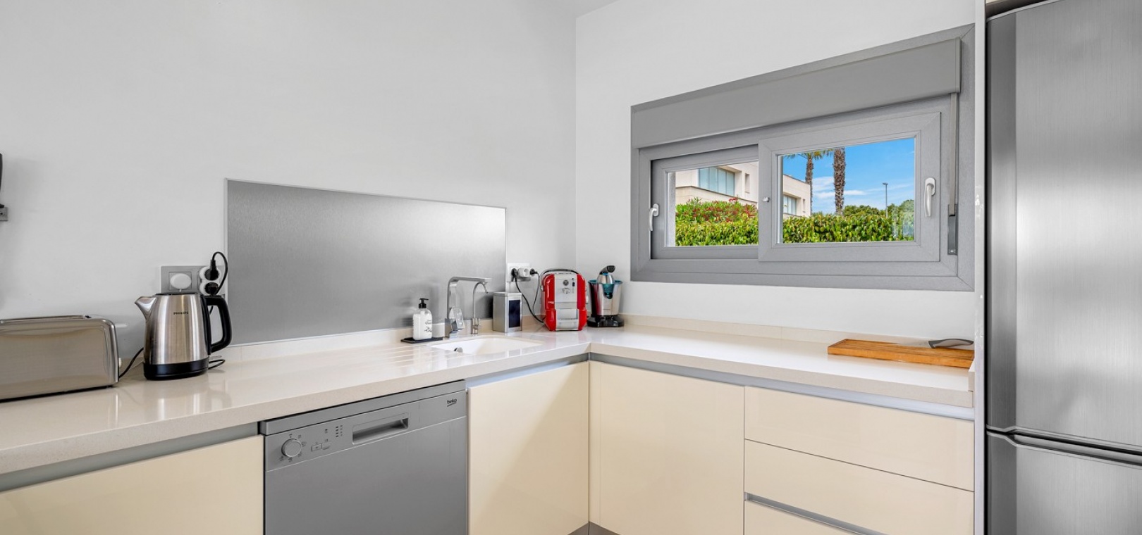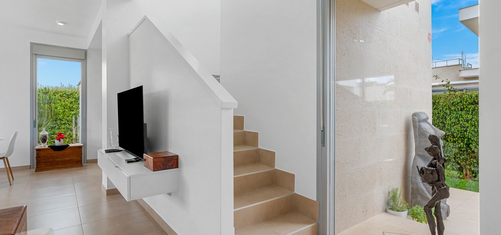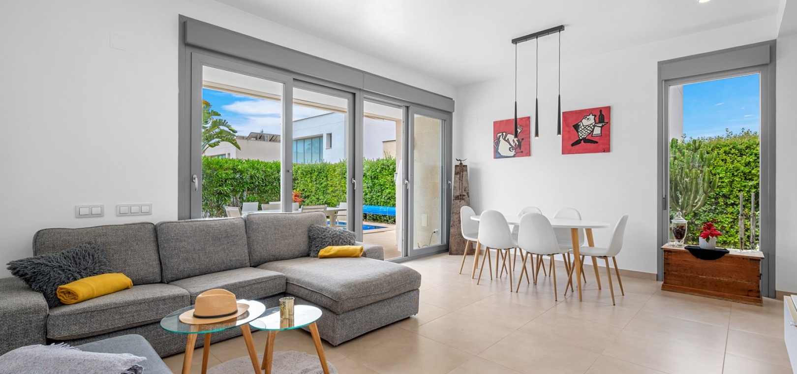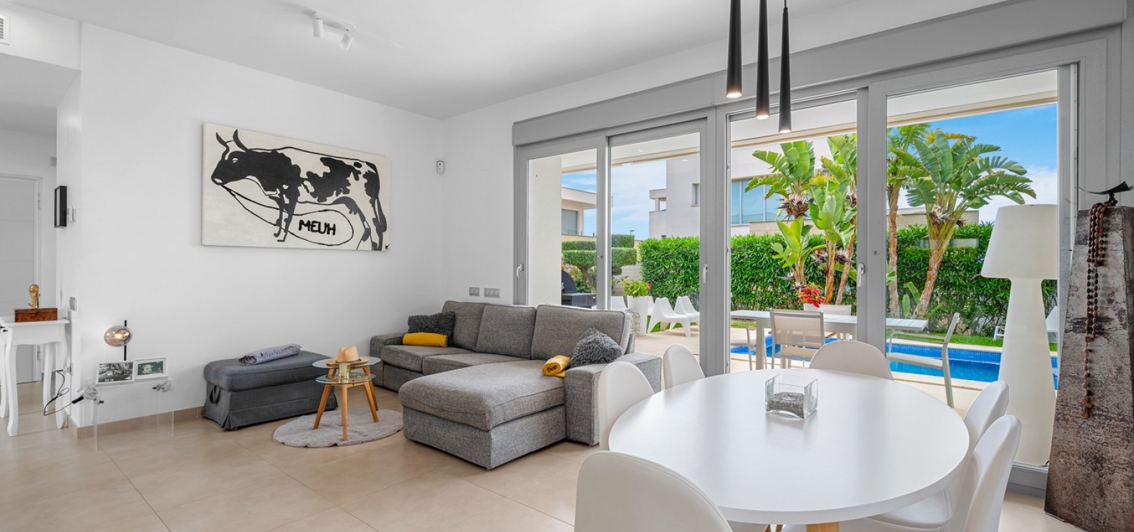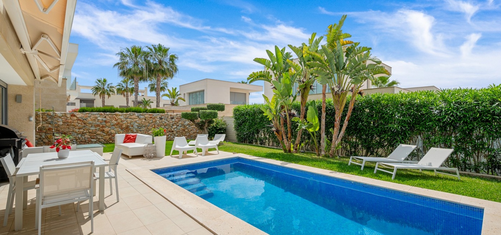 Cette villa récemment rénovée offre tout le confort et l'élégance d'une maison ensoleillée. Elle comprend trois chambres spacieuses et deux salles de bains modernes, dont une avec buanderie séparée.