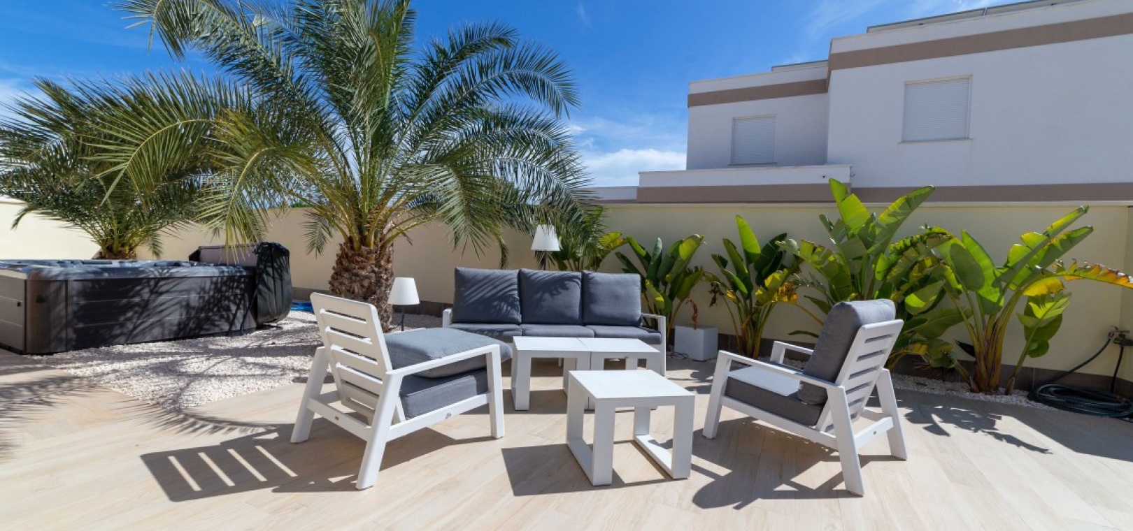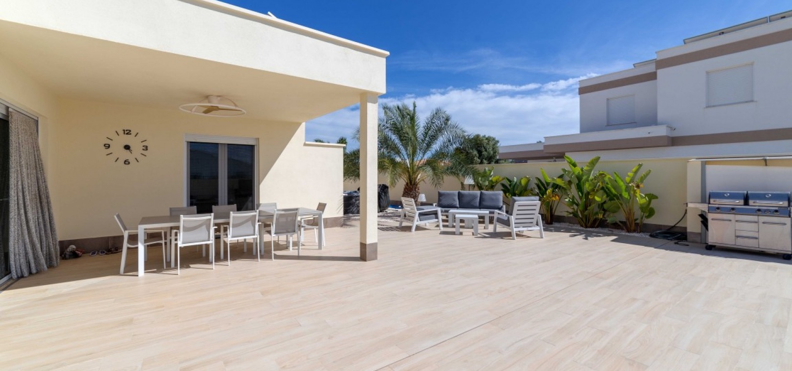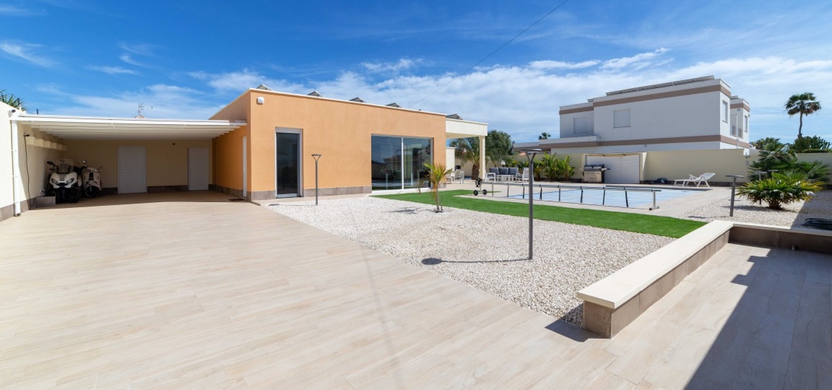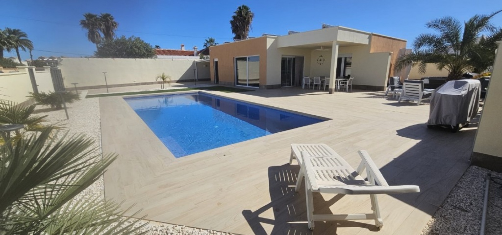 Villa individuelle avec 4 chambres et maison d'amis indépendante. Magnifique villa individuelle sur un terrain de 800 m² dans le quartier recherché de Torreta Florida à Torrevieja ! Cette propriété comprend un salon, une salle à manger, une cuisine ouverte, quatre chambres, deux salles de bains et une spacieuse buanderie. La cuisine est adjacente à la grande terrasse de 150 m². Deux grandes terrasses entourent une grande piscine de 10 x 4,5 m. À côté, vous trouverez un jacuzzi et une douche extérieure avec eau chaude. Pour les chaudes journées d'été, il y a un grand abri voiture où vous pourrez garer votre voiture à l'abri du soleil. Une maison d'amis indépendante de 63 m², actuellement utilisée comme débarras, comprenait auparavant un salon, une salle à manger, une cuisine, une chambre et une salle de bain. Toutes les installations sont à disposition pour un retour à la maison, sous réserve de rénovation. La villa est équipée de la climatisation centrale dans chaque pièce, vous permettant de profiter d'une température agréable toute l'année. 30 panneaux solaires sont installés sur le toit et une batterie de 15 kW est installée. La facture d'électricité est de 0 euro. C'est la maison idéale pour une famille recherchant le confort, la tranquillité et une connexion incomparable avec la nature. À quelques pas, vous trouverez des restaurants et des bars. À seulement 2 km, vous trouverez des supermarchés, une pharmacie, des banques et tous les autres services dont vous pourriez avoir besoin, ainsi que le centre commercial Habaneras de Torrevieja. Torrevieja est une ville animée toute l'année et vous y trouverez des divertissements pour toute la famille et tous les âges. Les amateurs de plage trouveront un large choix de plages dans la région.
