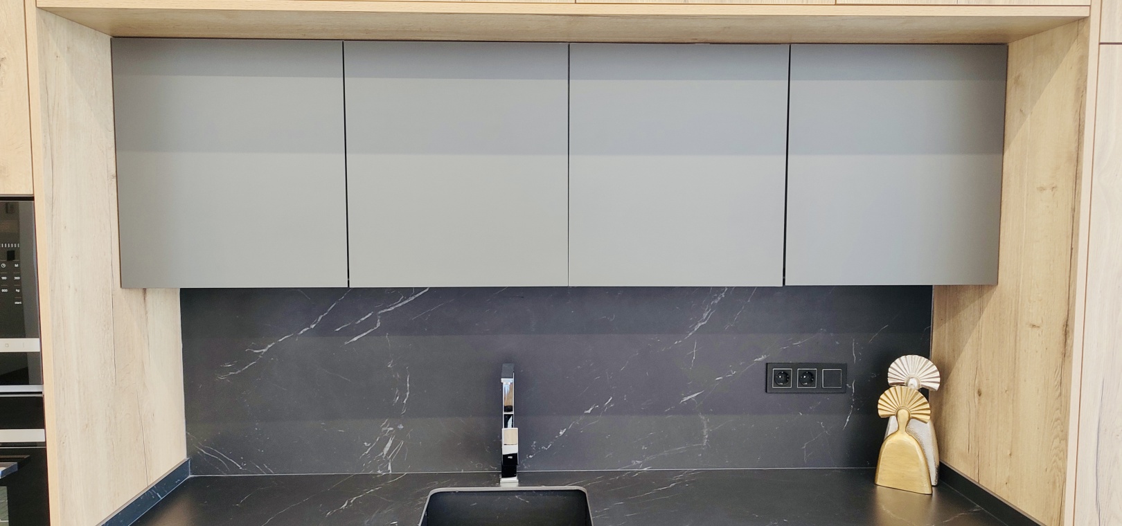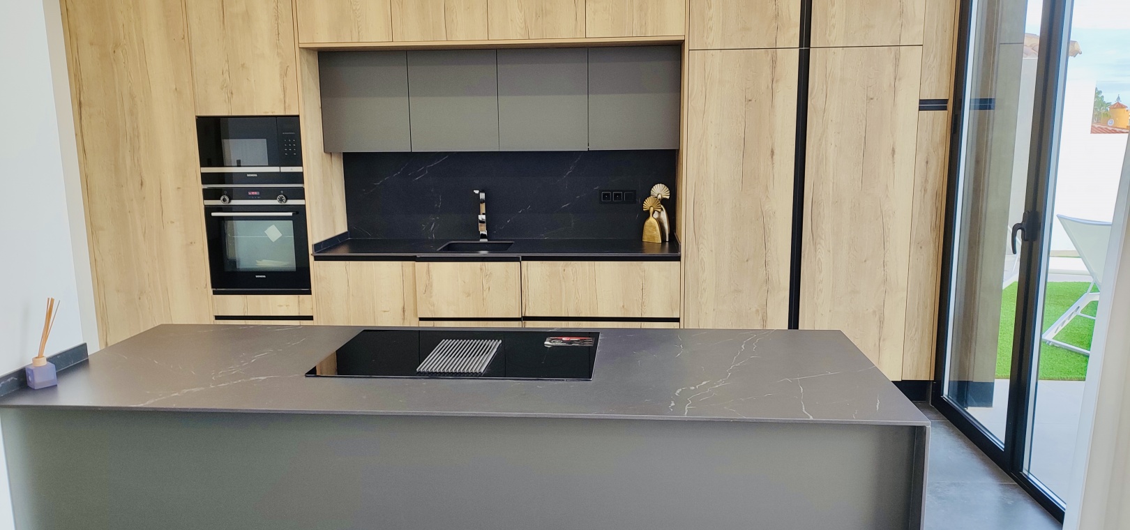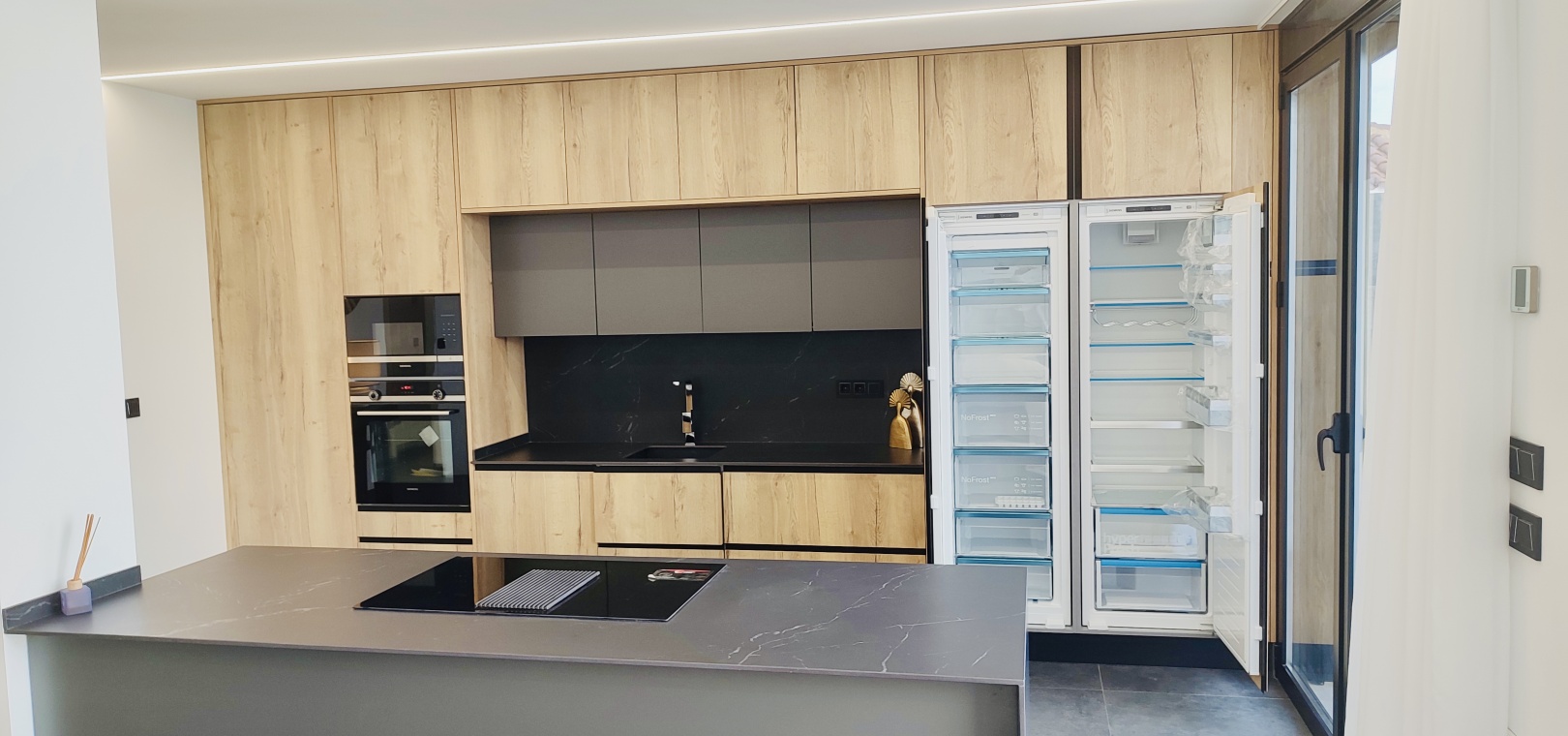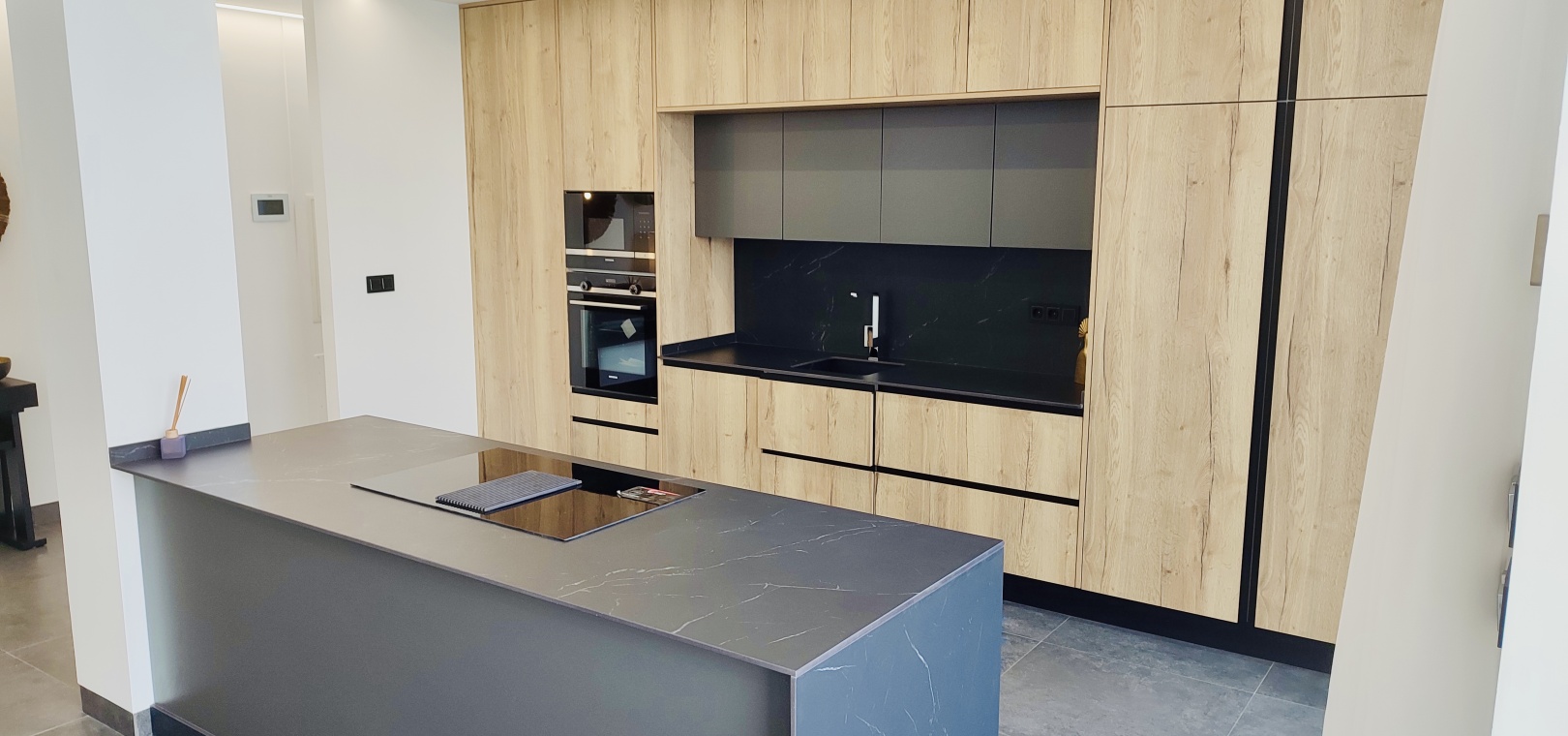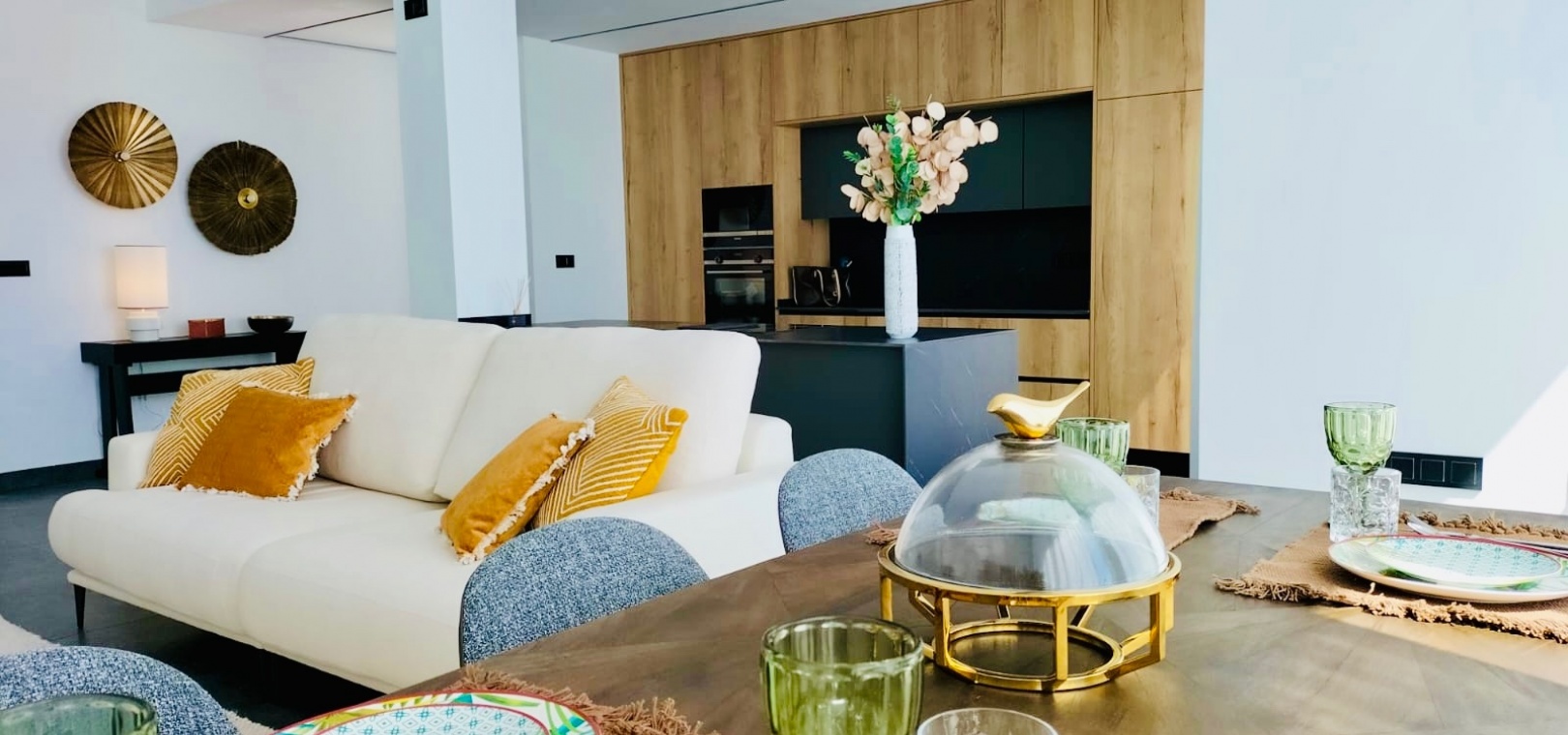 La cuisine contemporaine avec un îlot central s'intègre parfaitement dans le salon et la salle à manger ouverts , créant un espace lumineux et convivial idéal pour la vie de famille moderne.