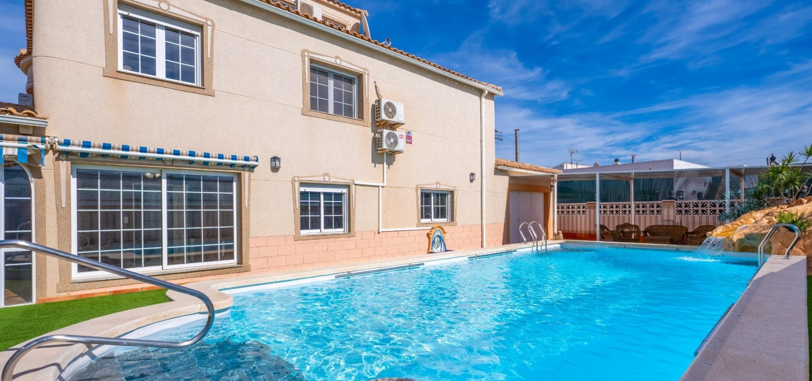 Située dans l'un des quartiers les plus prisés de Chaparral, à Torrevieja , cette immense villa offre une combinaison parfaite de qualité de vie, de tranquillité et de confort , tout en restant proche des services essentiels, des plages et des lieux de divertissement .