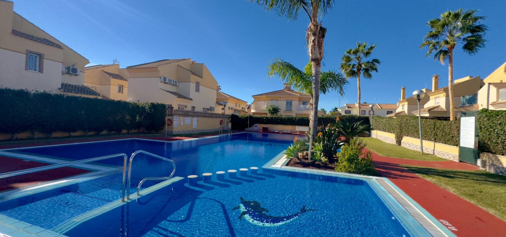 Le terrain de 98,45 m² offre un espace extérieur privatif idéal pour se détendre ou prendre ses repas en plein air. La résidence dispose d'une piscine commune bien entretenue, entourée d'espaces verts, parfaite pour les loisirs et la détente. Une place de parking privée (n° 9) est incluse dans le prix.