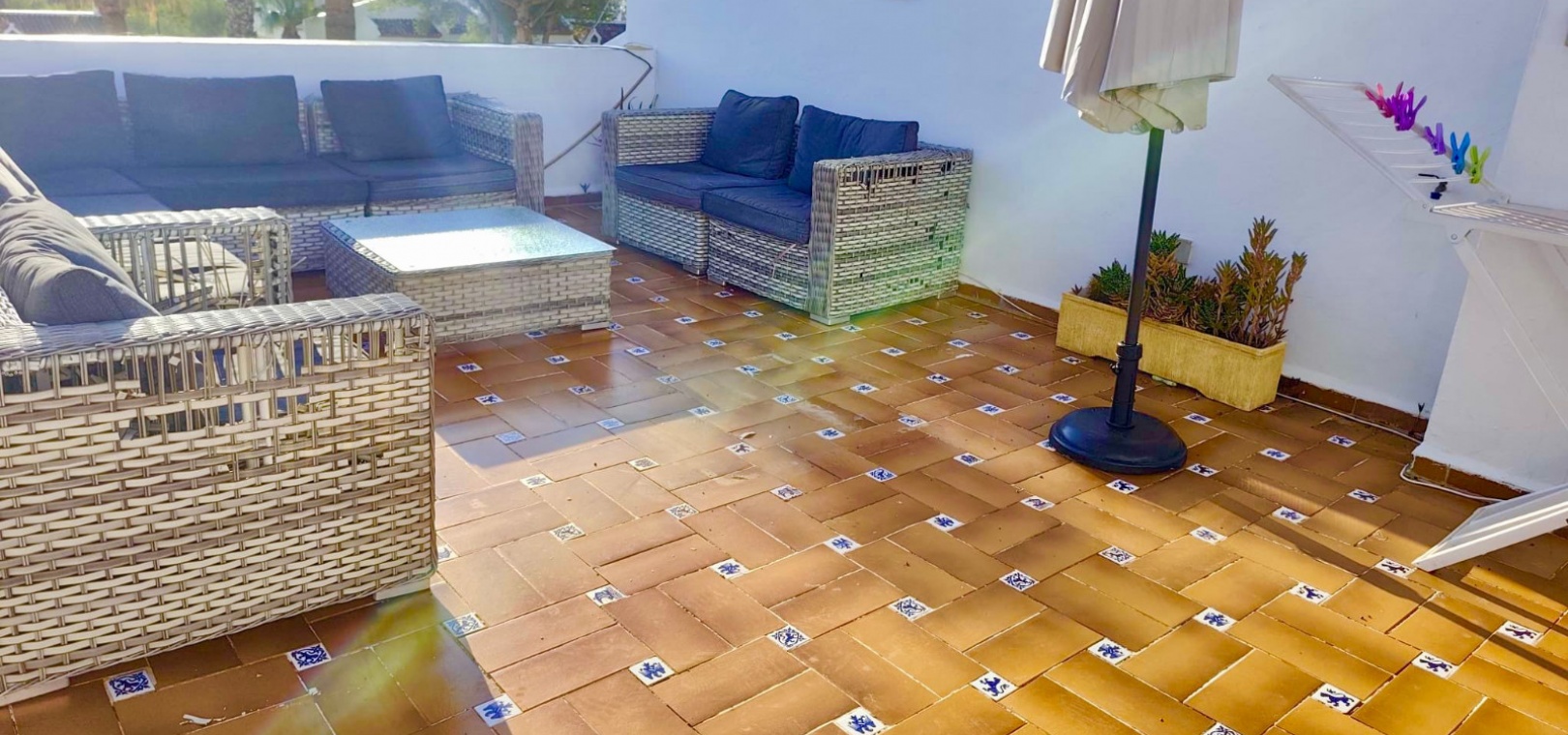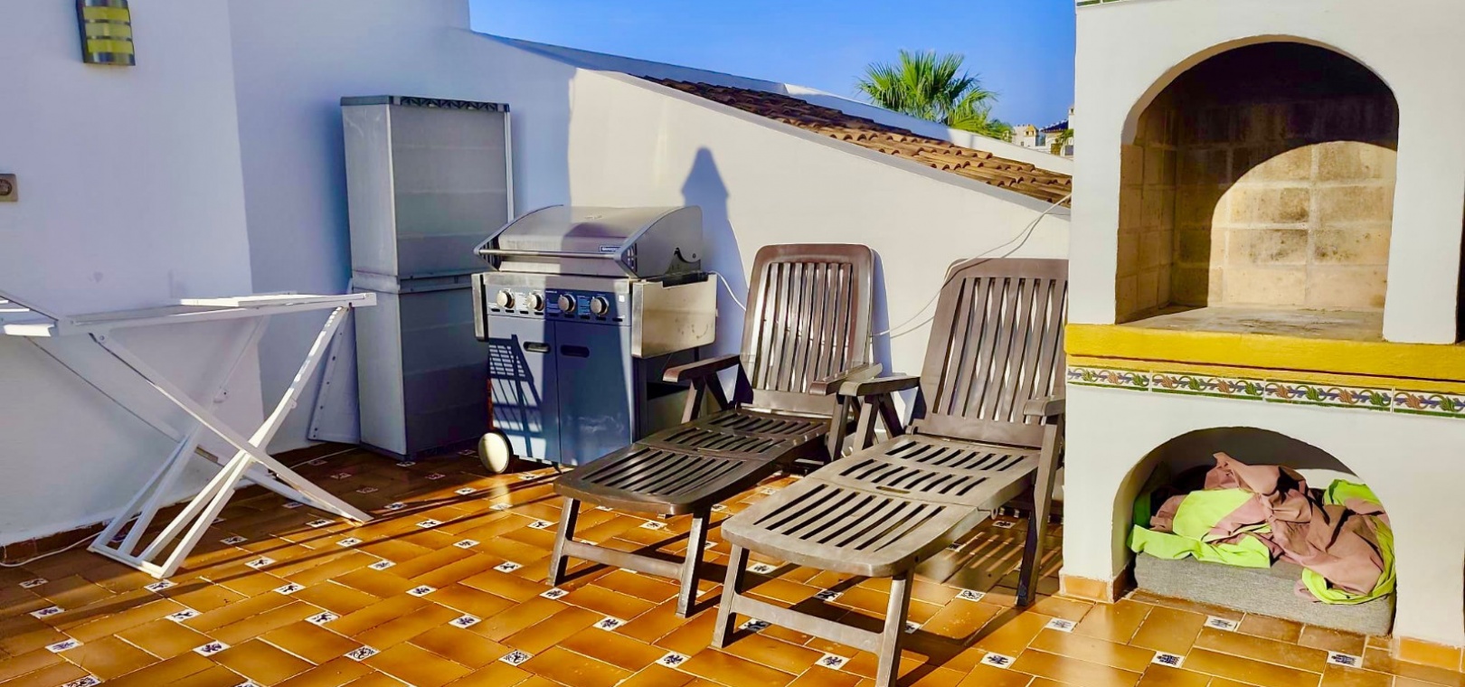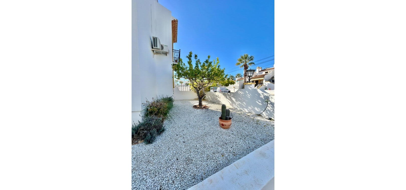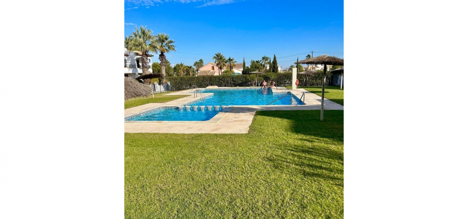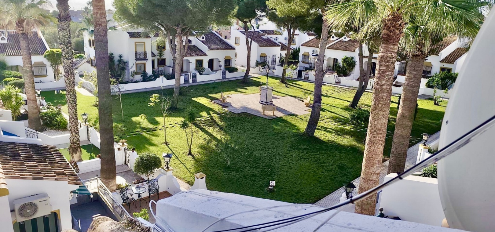 Salon/salle à manger lumineux avec climatisation réversible et portes-fenêtres donnant sur un balcon privé Un escalier extérieur relie le balcon à un spacieux solarium privé sur le toit, équipé d'un barbecue. Cuisine ouverte entièrement équipée avec buanderie séparée Salle de bain avec douche à l'italienne Deux chambres doubles, toutes deux avec placards intégrés Jardin privé sur le côté et à l'arrière Accès à une belle piscine commune et à des espaces communs bien entretenus