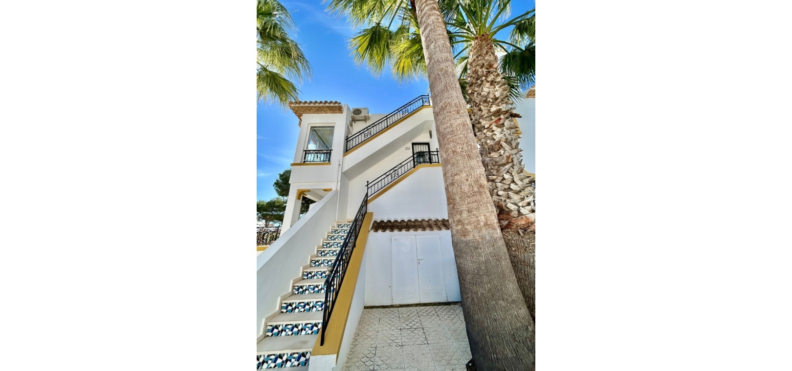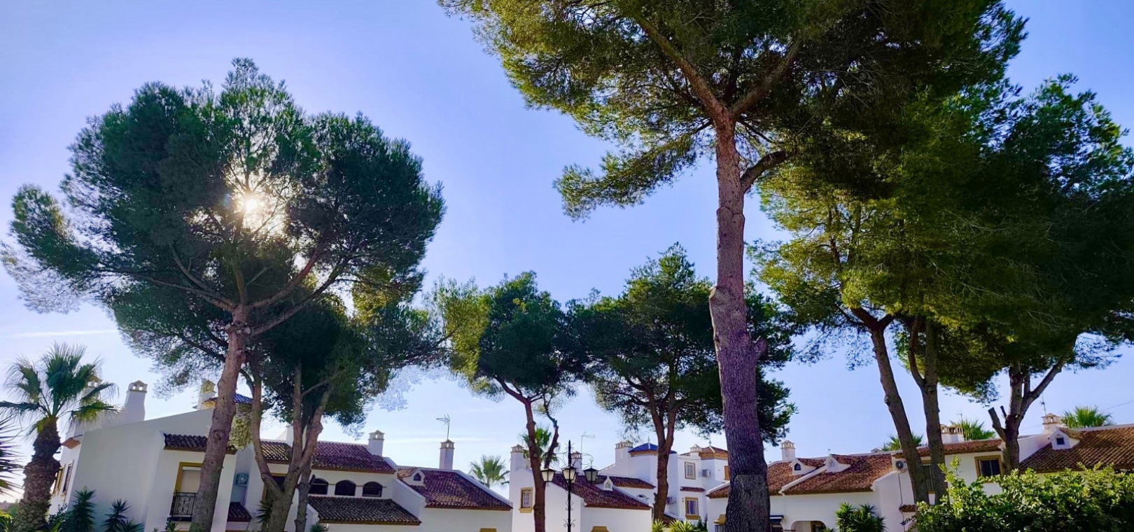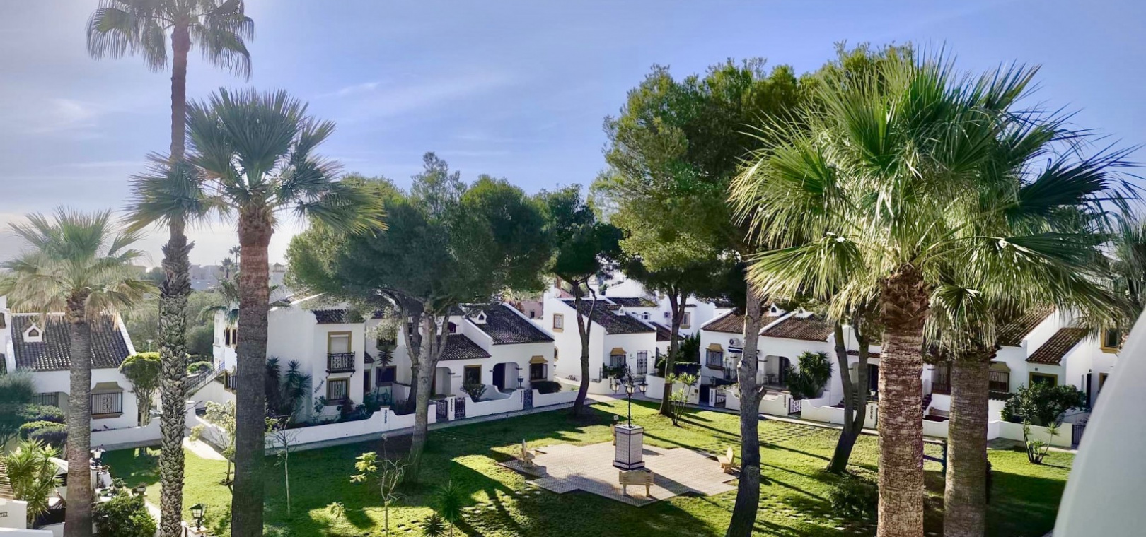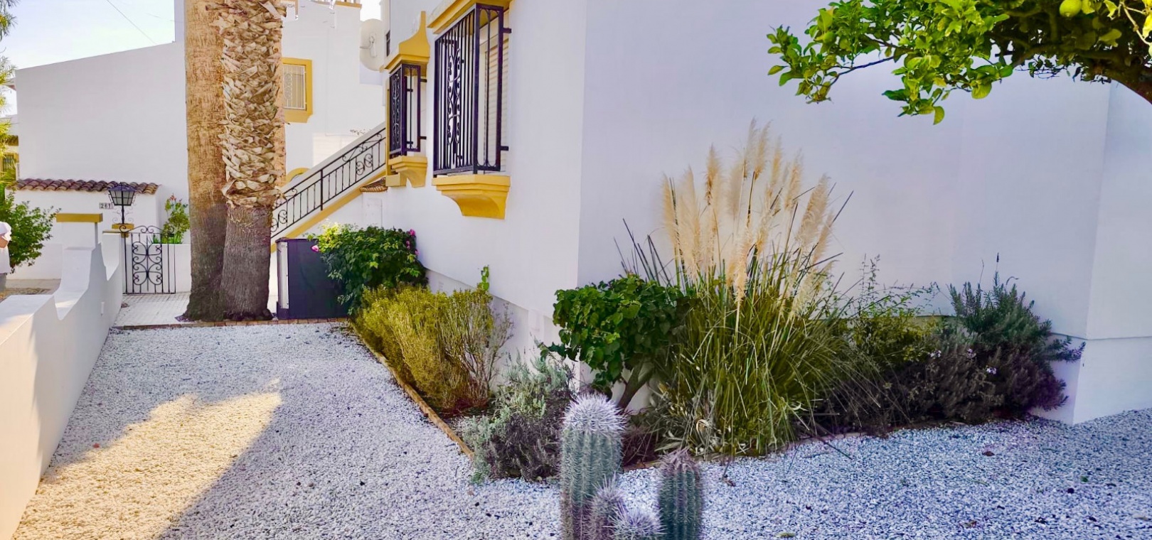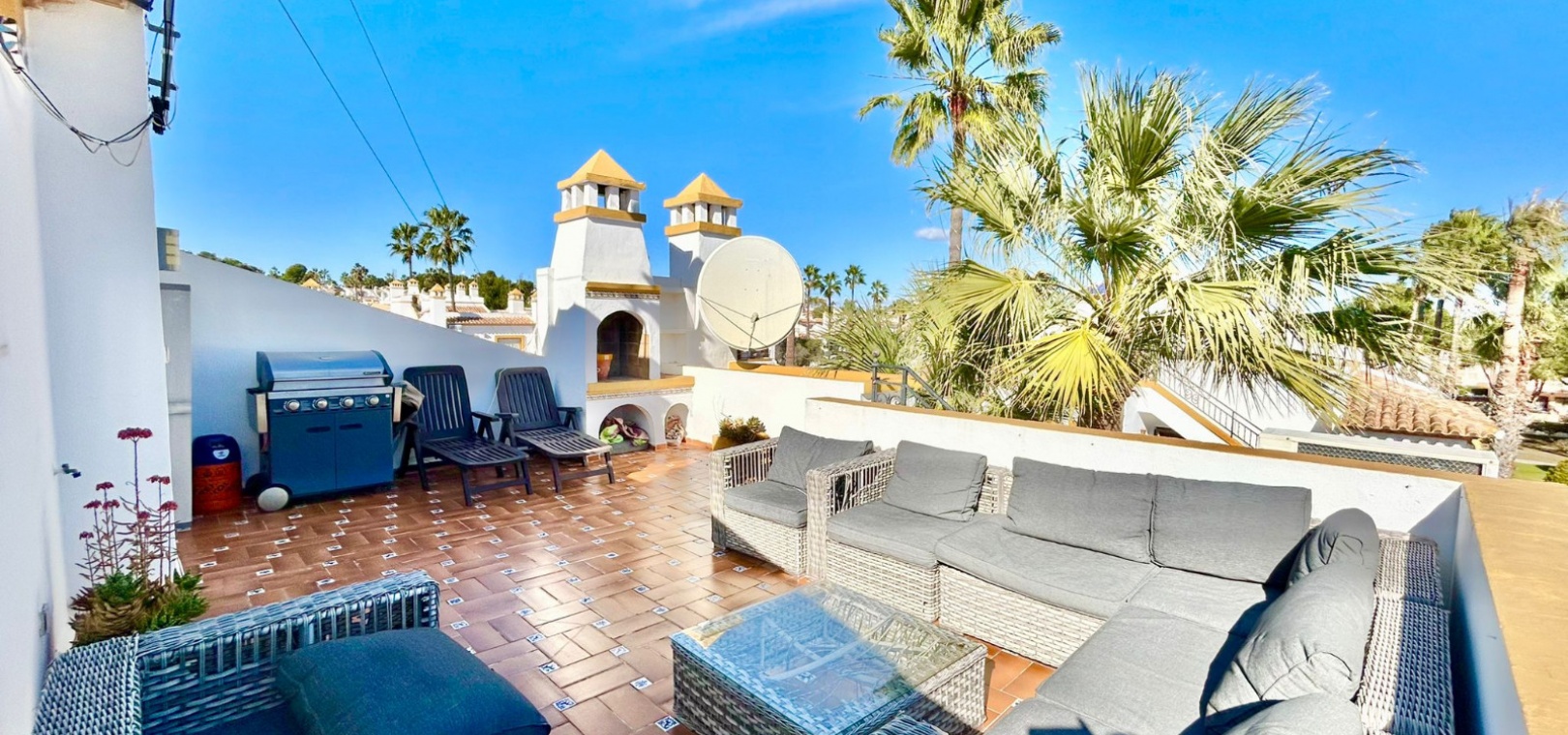 Salon/salle à manger lumineux avec climatisation réversible et portes-fenêtres donnant sur un balcon privé Un escalier extérieur relie le balcon à un spacieux solarium privé sur le toit, équipé d'un barbecue. Cuisine ouverte entièrement équipée avec buanderie séparée Salle de bain avec douche à l'italienne Deux chambres doubles, toutes deux avec placards intégrés Jardin privé sur le côté et à l'arrière Accès à une belle piscine commune et à des espaces communs bien entretenus