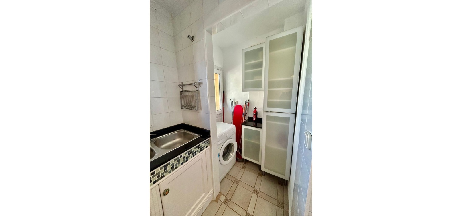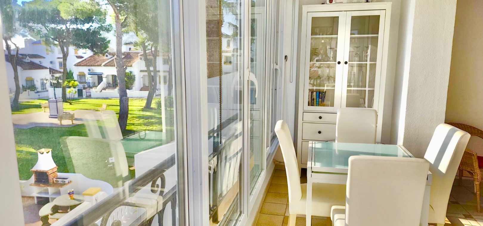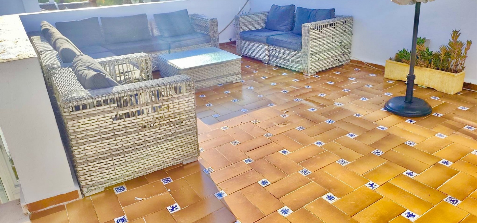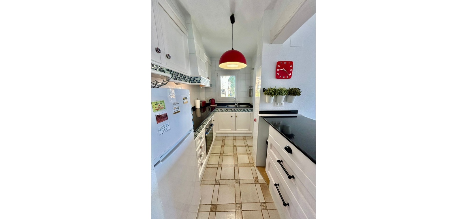 Salon/salle à manger lumineux avec climatisation réversible et portes-fenêtres donnant sur un balcon privé Un escalier extérieur relie le balcon à un spacieux solarium privé sur le toit, équipé d'un barbecue. Cuisine ouverte entièrement équipée avec buanderie séparée Salle de bain avec douche à l'italienne Deux chambres doubles, toutes deux avec placards intégrés Jardin privé sur le côté et à l'arrière Accès à une belle piscine commune et à des espaces communs bien entretenus