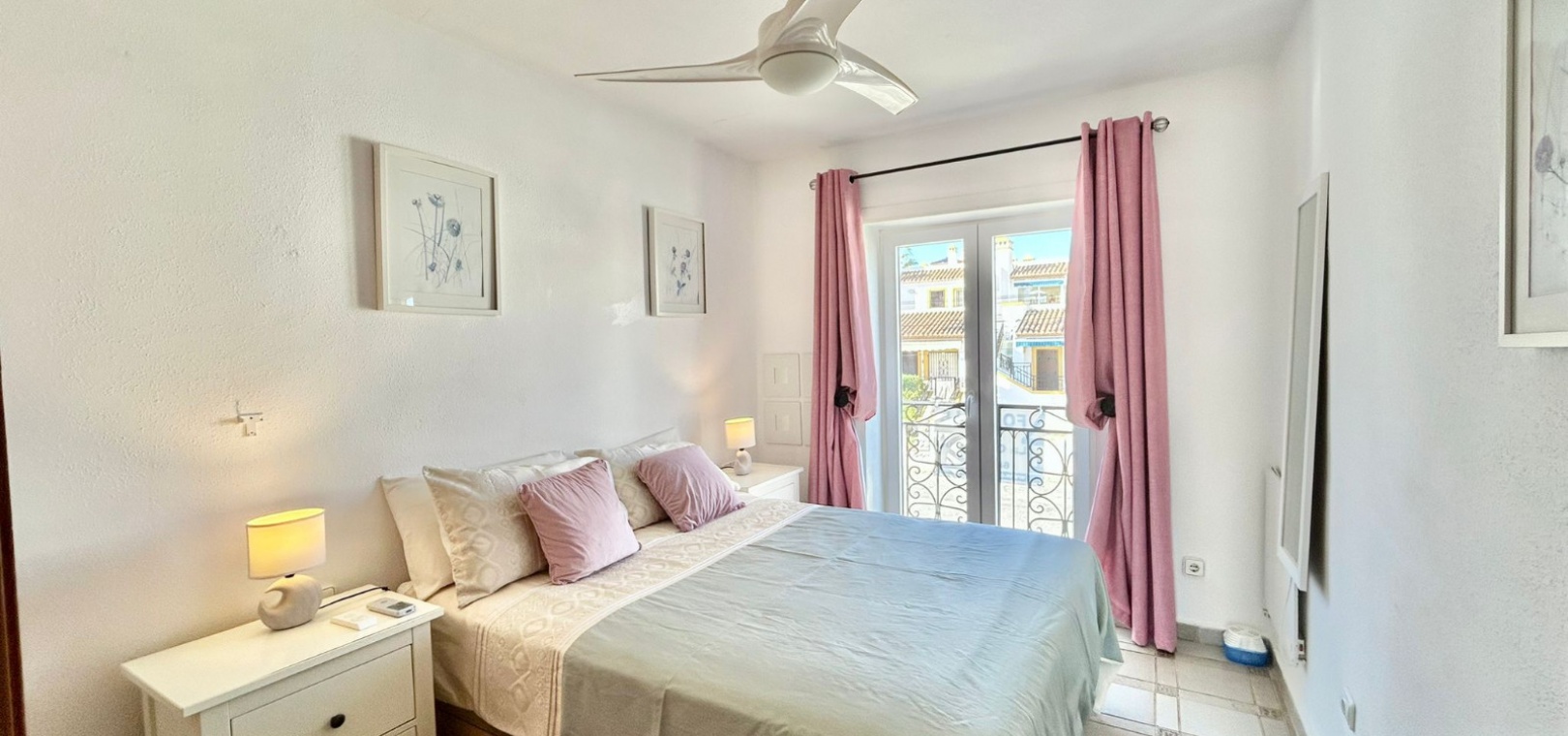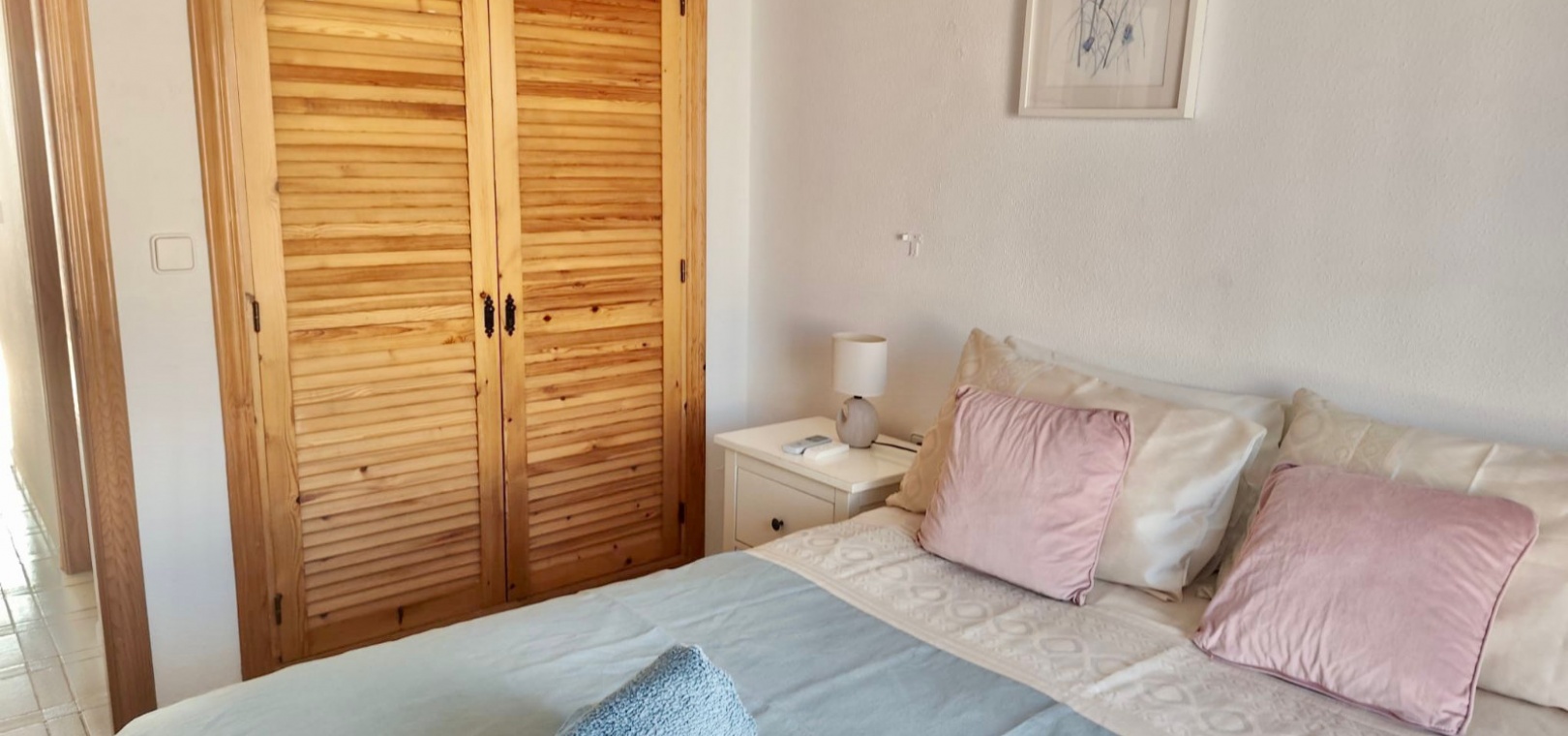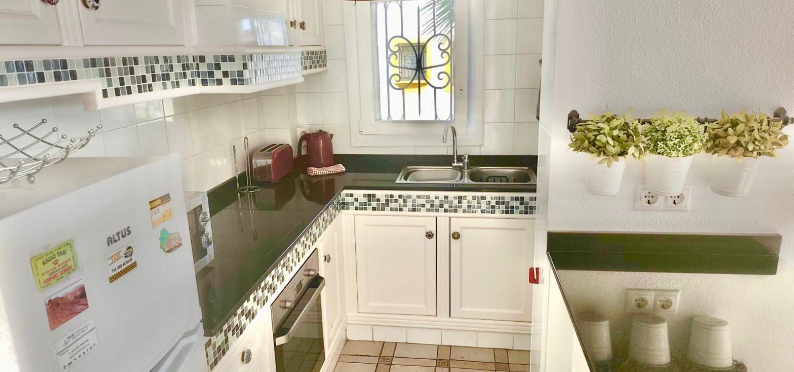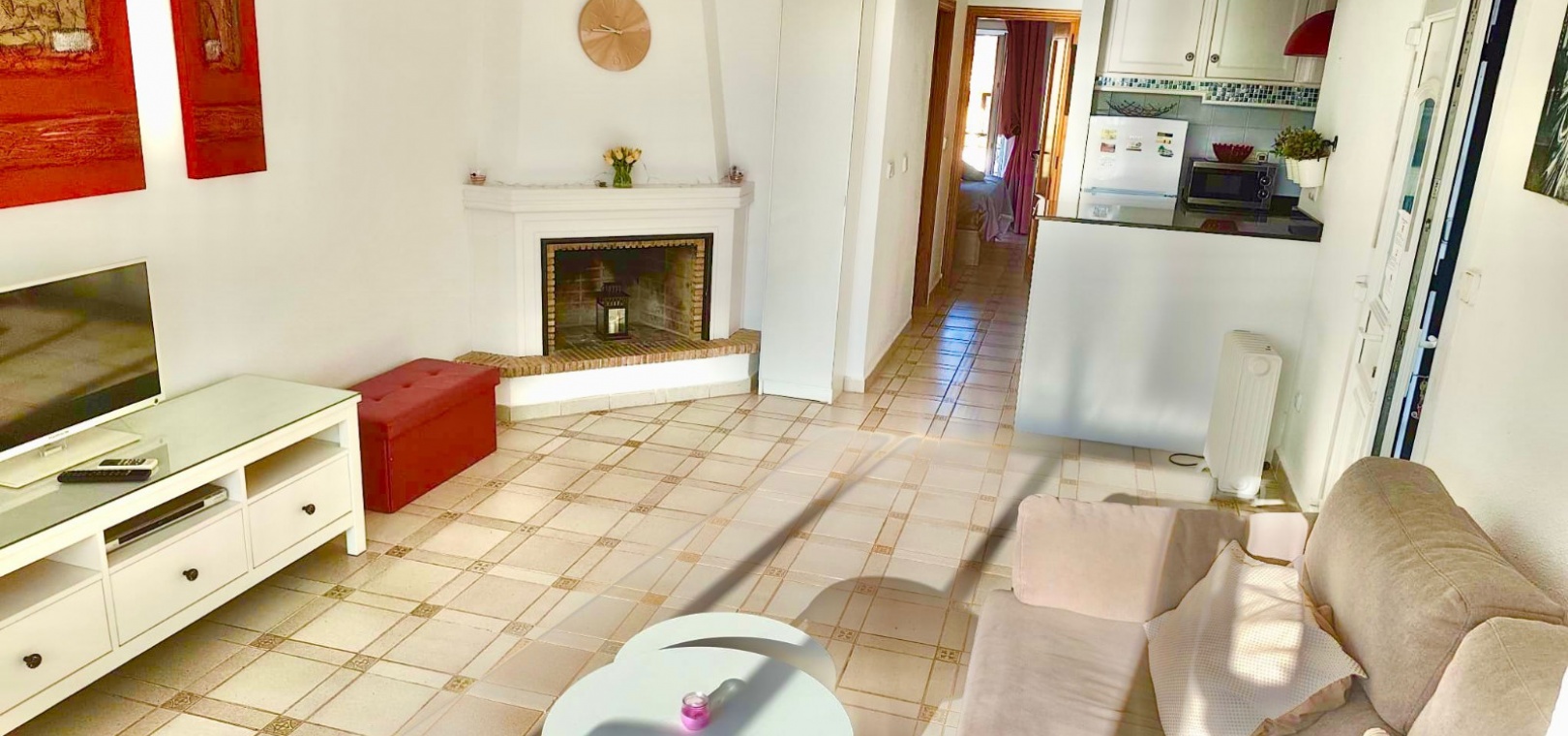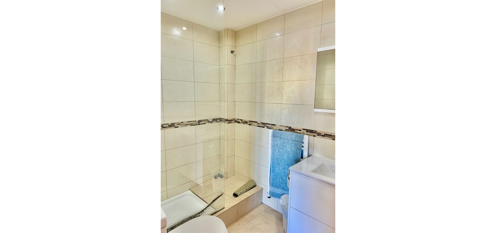 Salon/salle à manger lumineux avec climatisation réversible et portes-fenêtres donnant sur un balcon privé Un escalier extérieur relie le balcon à un spacieux solarium privé sur le toit, équipé d'un barbecue. Cuisine ouverte entièrement équipée avec buanderie séparée Salle de bain avec douche à l'italienne Deux chambres doubles, toutes deux avec placards intégrés Jardin privé sur le côté et à l'arrière Accès à une belle piscine commune et à des espaces communs bien entretenus